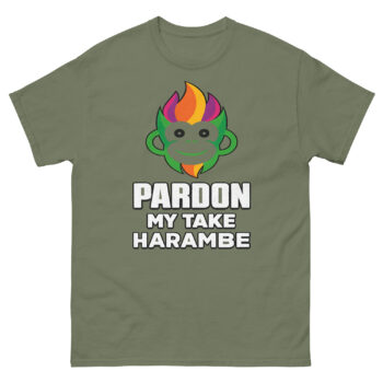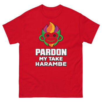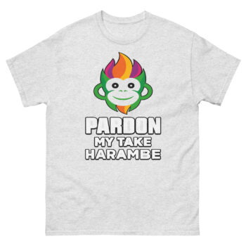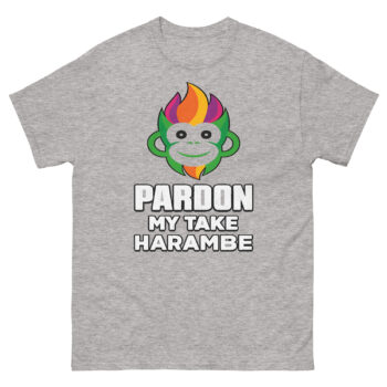 The Punchline: The phrase “PARDON MY TAKE HARAMBE” sits boldly below, tying the whole concept together in a perfect, ironic bow.