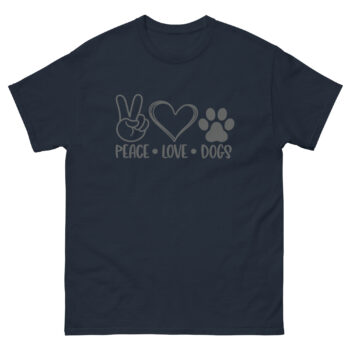 This “Peace • Love • Dogs” shirt is a simple, powerful design with broad appeal among dog lovers and pet parents.