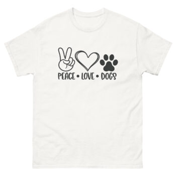 The Peace Love Dogs Shirt features a clean, eye-catching design with three iconic symbols: