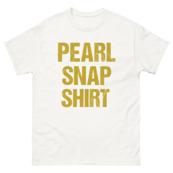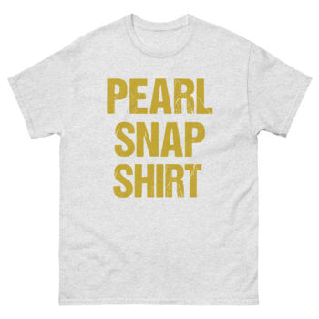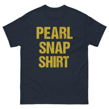 The phrase “PEARL SNAP SHIRT” is printed in a bold, distressed font that looks like it’s been pulled straight from an old rodeo poster. The stacked layout and vibrant yellow color make it impossible to miss. However, the real magic lies in the double meaning. For some, it’s a straightforward tribute to vintage western wear. For others, the word “SNAP” delivers a playful, knowing wink. This clever twist makes it more than just a country style t-shirt; it becomes a piece of wearable humor that breaks the ice and gets a smile.