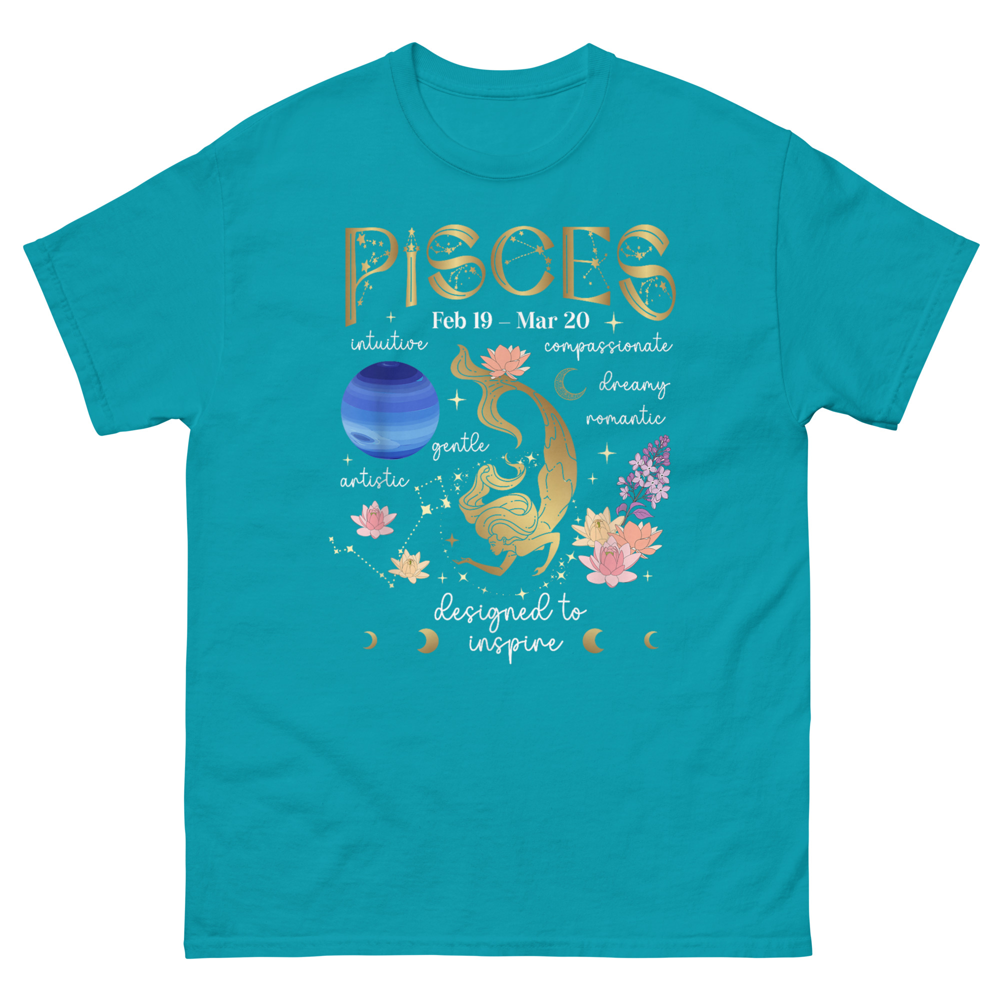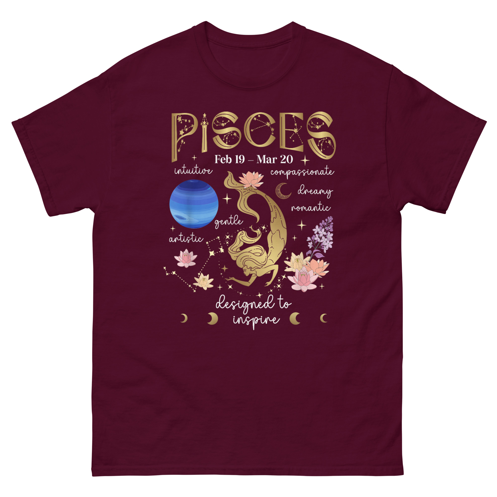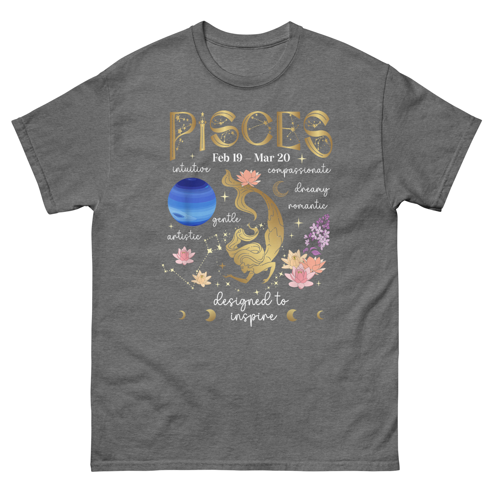 Every element serves a purpose. The Art Nouveau-style “PISCES” at the top frames the composition like an old botanical print. The dates “Feb 19 – Mar 20” ground it in calendar reality. The phrase “designed to inspire” at the base is not decorative, it is the mission statement. Pisces Facts T Shirt exists to remind wearers that their sign comes with depth, history, and purpose.