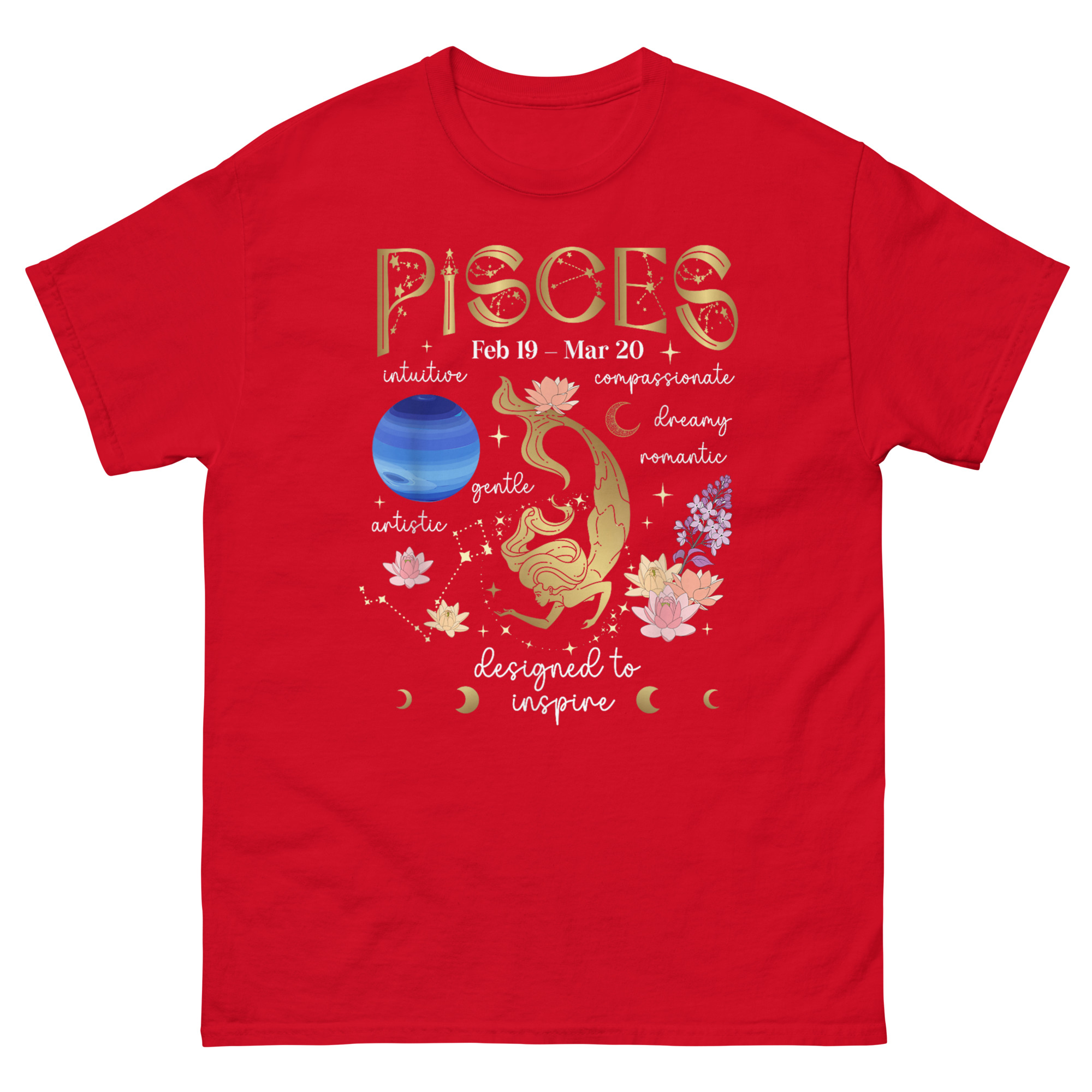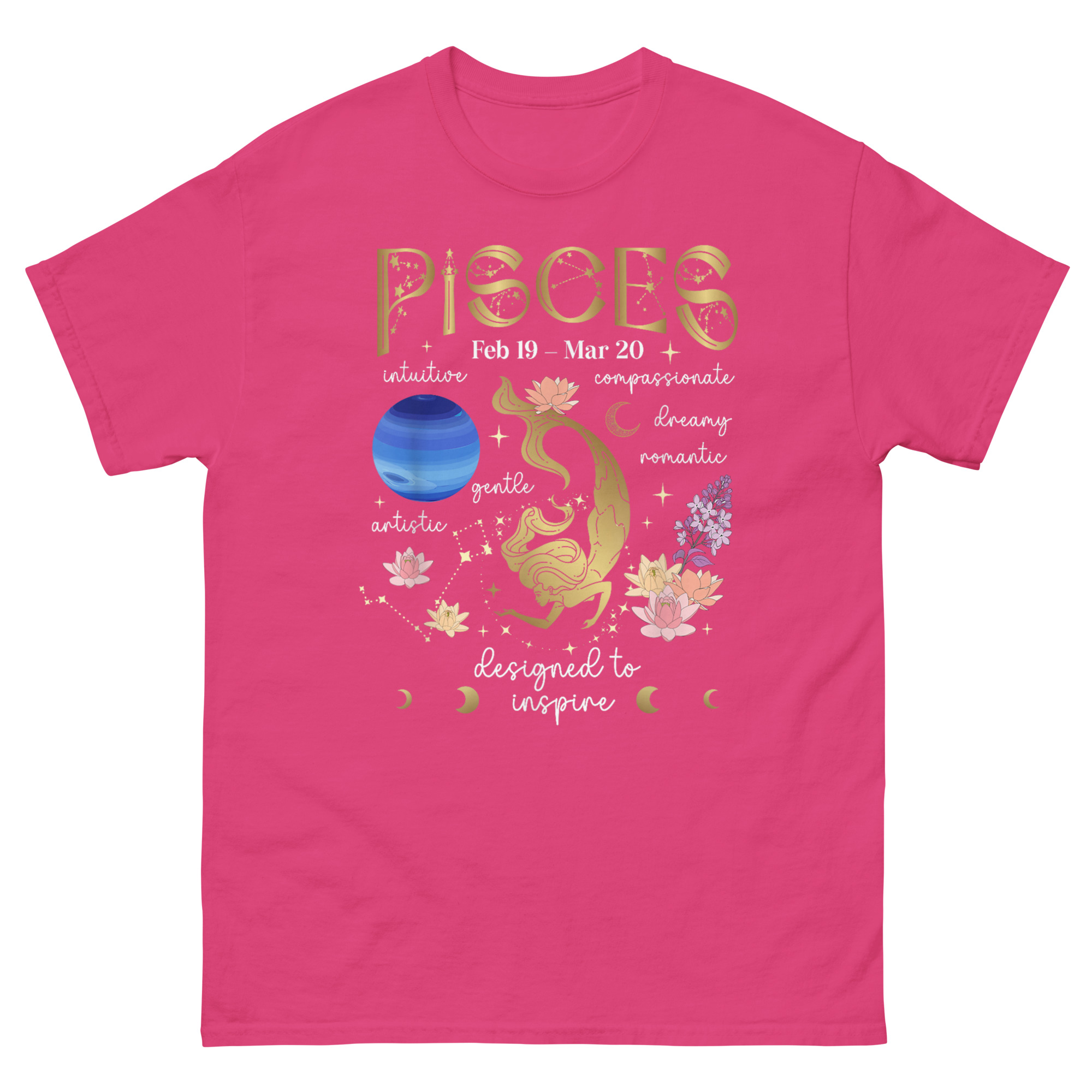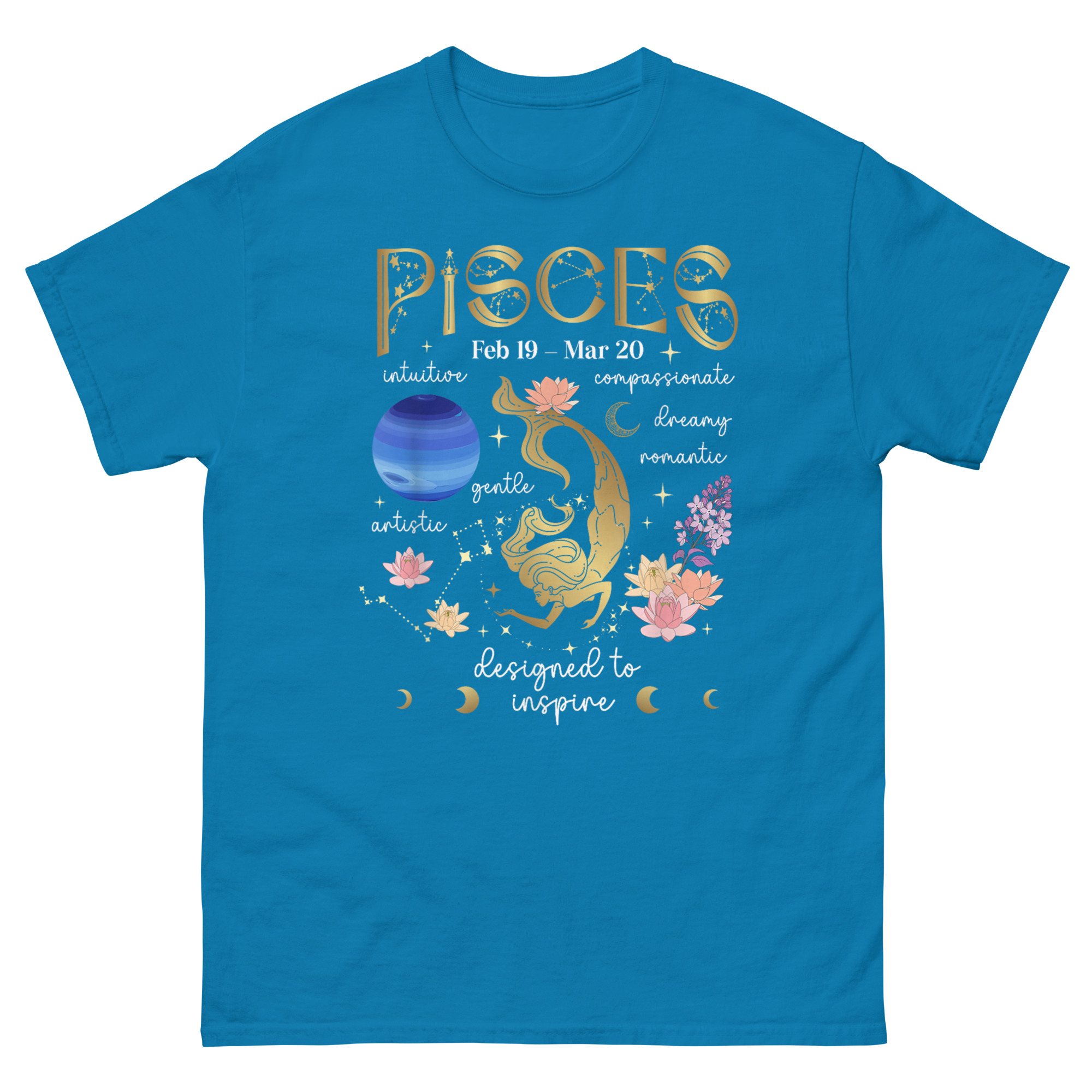 Every element serves a purpose. The Art Nouveau-style “PISCES” at the top frames the composition like an old botanical print. The dates “Feb 19 – Mar 20” ground it in calendar reality. The phrase “designed to inspire” at the base is not decorative, it is the mission statement. Pisces Facts T Shirt exists to remind wearers that their sign comes with depth, history, and purpose.