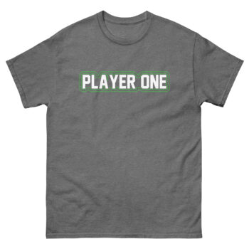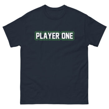 The all-caps “PLAYER ONE” text isn’t just a statement—it’s a badge of honor. The high-contrast white and green color scheme ensures it stands out, whether you’re on stream or at a tournament. This is the kind of video game identity t-shirt that makes other gamers nod in respect.