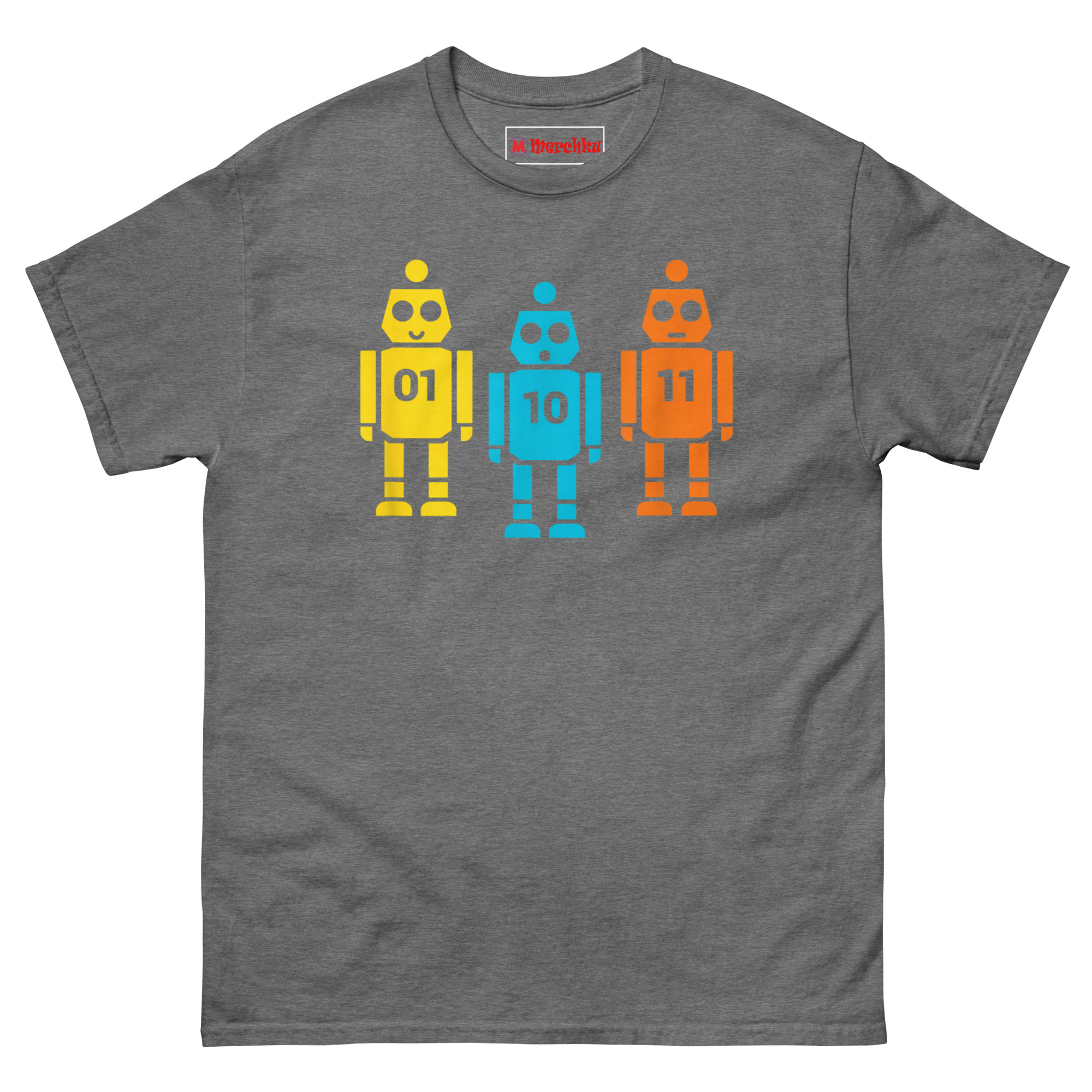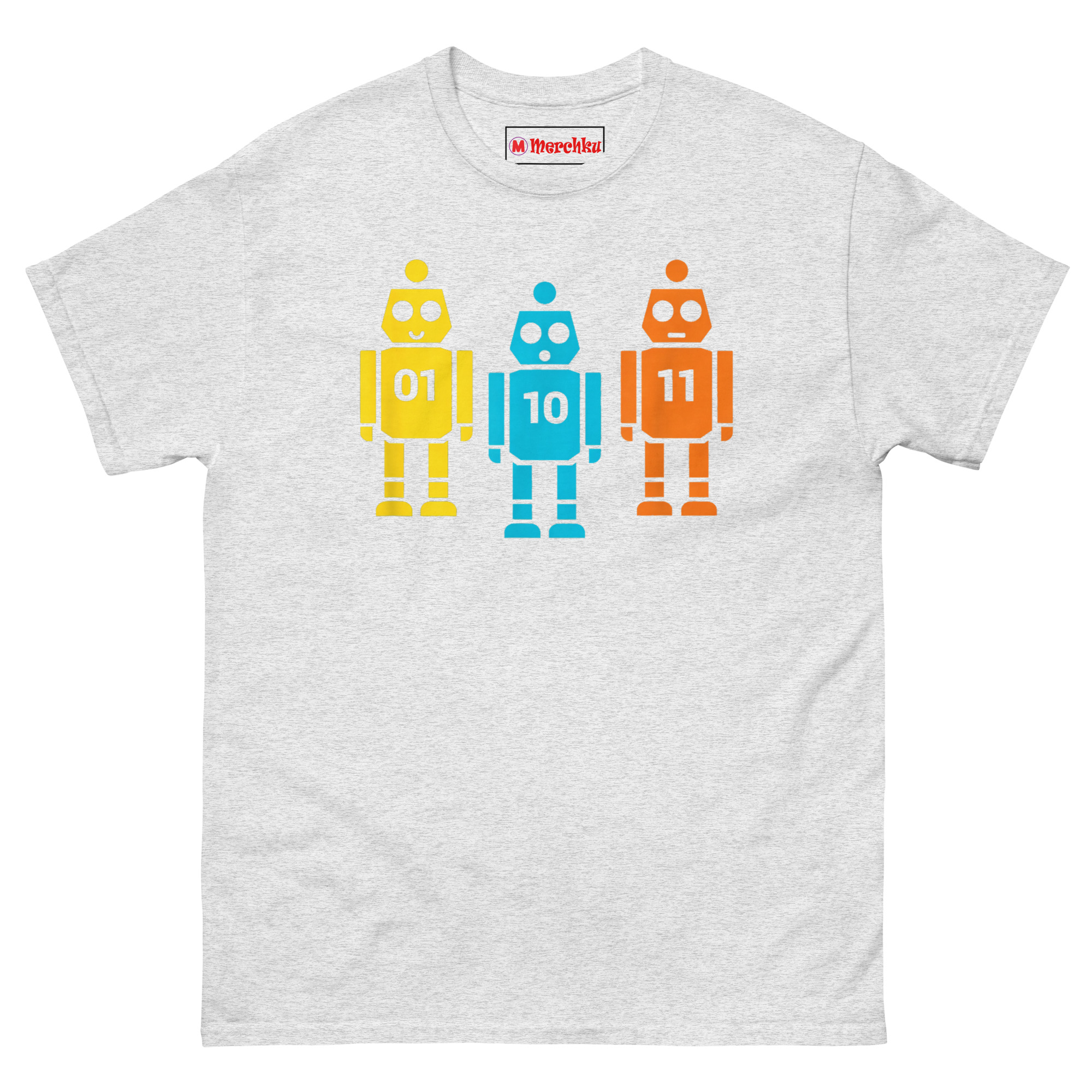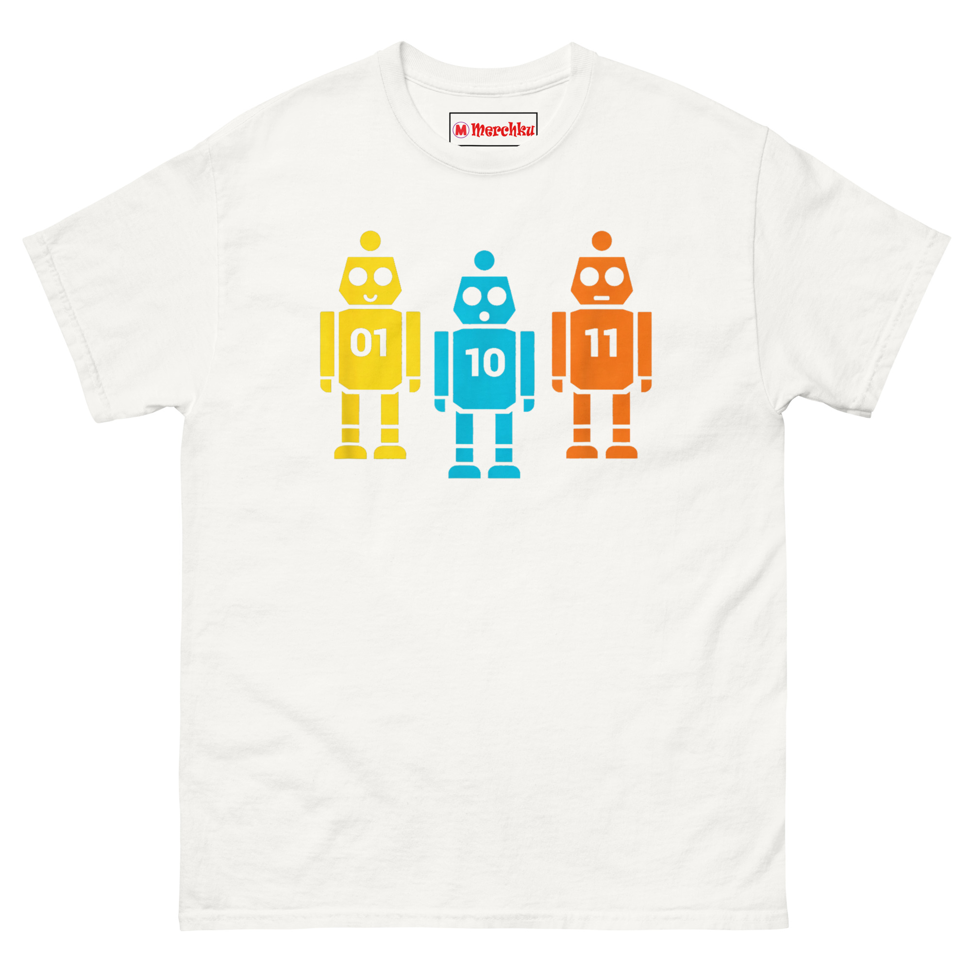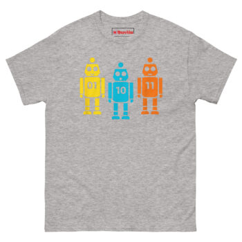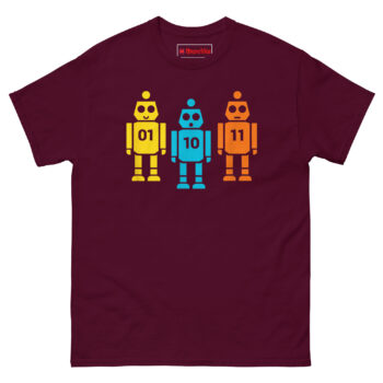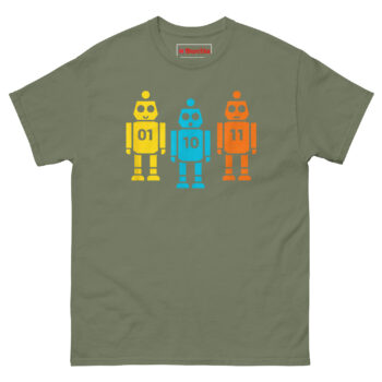 We wanted something that worked on two levels. To the casual observer, it’s just a cute, colorful shirt with three friendly vintage-style robots. But to anyone who works with code, it’s an instant inside joke. The robots stand shoulder to shoulder like a tiny mechanical chorus line. The yellow robot on the left proudly displays “01” (which is 1 in binary). The blue robot in the middle shows “10” (which is 2). And the orange robot on the right completes the set with “11” (which is 3). Together, they’re literally counting to three in the most geeky way possible. It’s the perfect retro robot binary code graphic tee for hackathons, coding bootcamps, or casual office wear.