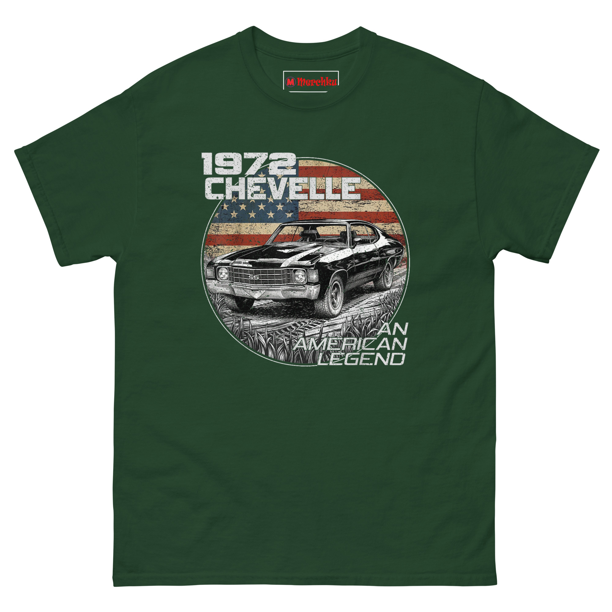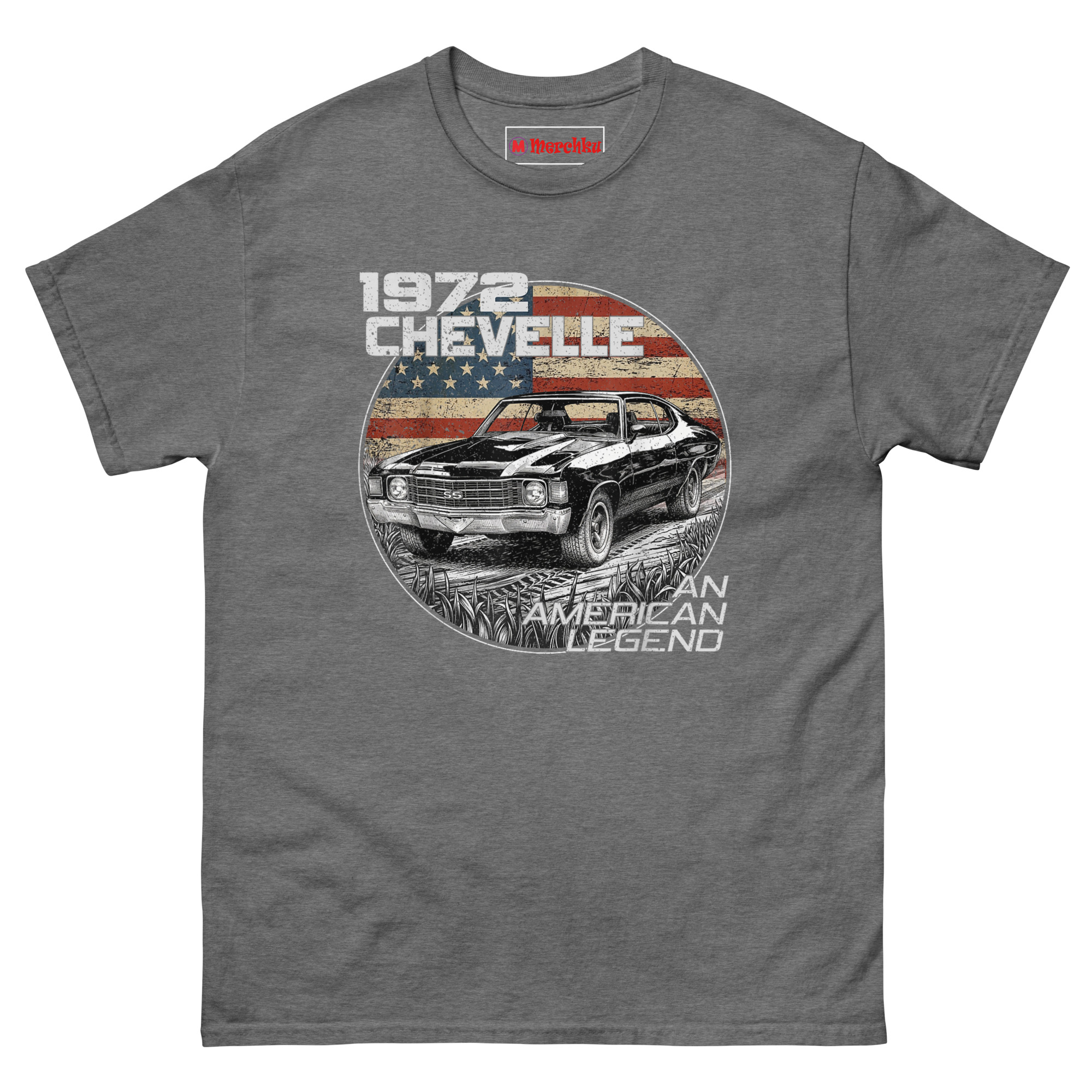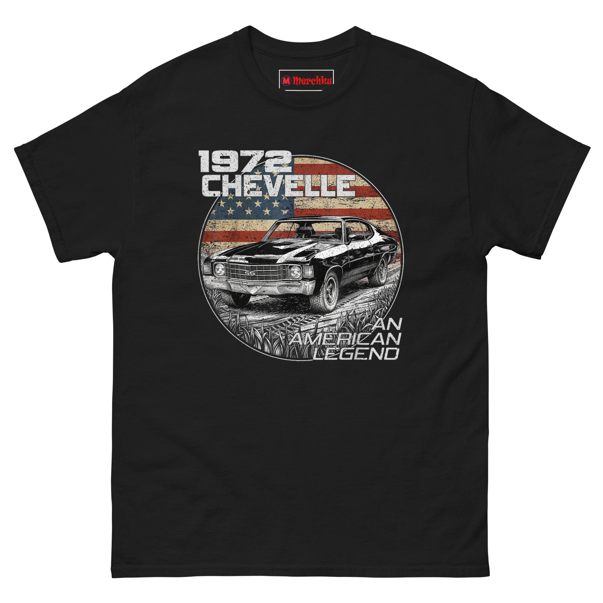 He wasn’t wrong. So we built a design that feels as solid as that car. A highly detailed hand-sketched illustration shows the Chevelle SS from a front-quarter angle, emphasizing that aggressive, wide stance. The car sits inside a circular “seal” with a faded, grunge-textured American flag behind it. Tire tracks and tall grass frame the bottom, giving it a “found in the wild” racetrack heritage feel. The monochrome car against the colored flag creates high visual contrast. “1972 CHEVELLE” sits in bold weathered block letters at the top left, while “AN AMERICAN LEGEND” curves along the bottom right in a distressed vintage typeface. This is Vintage style American muscle car graphic tees for guys who remember when cars had personality.