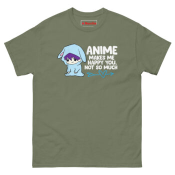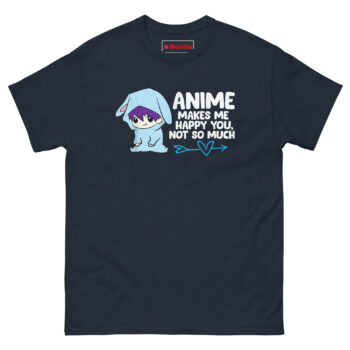 The Anime Makes Me Happy You Not So Much T Shirt pairs an adorable chibi character in a bunny onesie with text that draws a clear boundary. Purple hair, a smug little expression, and cozy rabbit ears create the soft aesthetic while the message handles the rest. Designed for anime fans who prefer streaming marathons over social gatherings, this shirt combines kawaii visuals with brutally honest words.