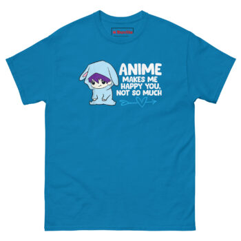 That moment became the foundation for this design. The chibi character with vibrant purple hair captures that exact energy, cozy, content, completely unbothered. The light-blue rabbit onesie with long drooping ears represents the physical comfort of being exactly where you want to be, doing exactly what you love. The tiny smug expression says everything without words. To the right, the bold white text delivers the message clearly: “ANIME MAKES ME HAPPY YOU, NOT SO MUCH.” A stylized cyan-blue arrow with a heart at its center points toward the character, tying the whole composition together. It’s Aggressive Cuteness, soft enough to feel welcoming, sharp enough to set boundaries. Anime Makes Me Happy You Not So Much T Shirt best for anyone who’s ever chosen a quiet night with their favorite series over a loud night with people who drain them.