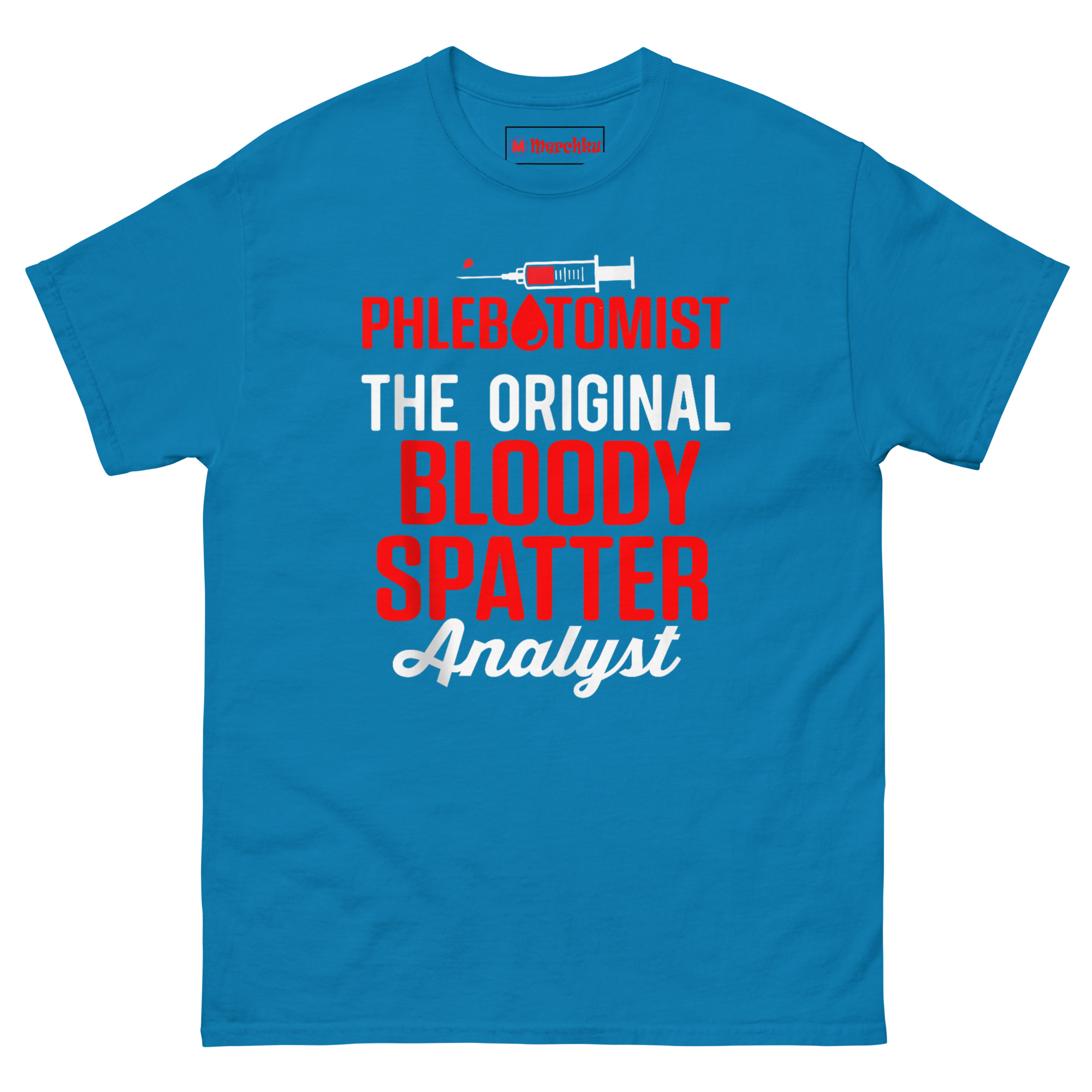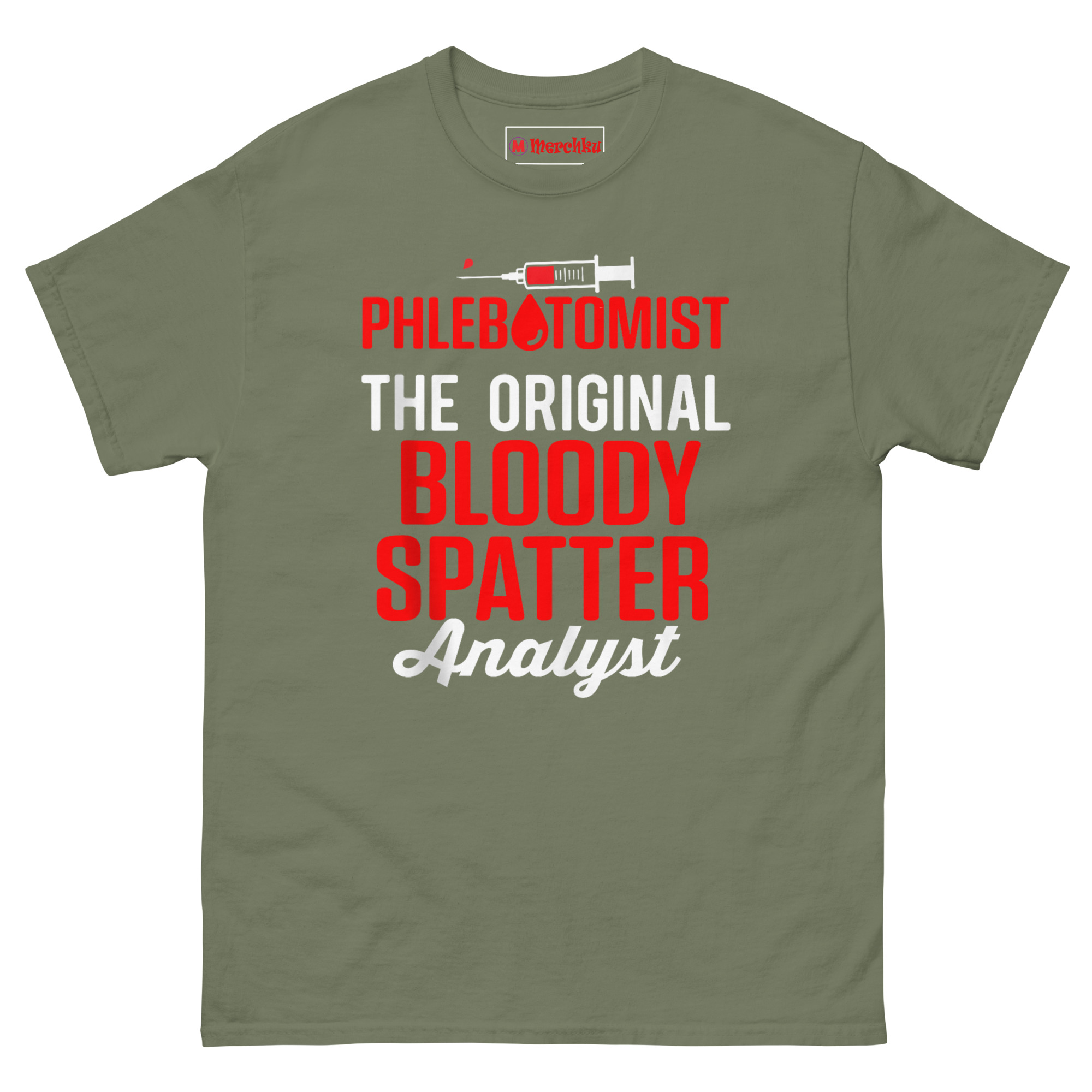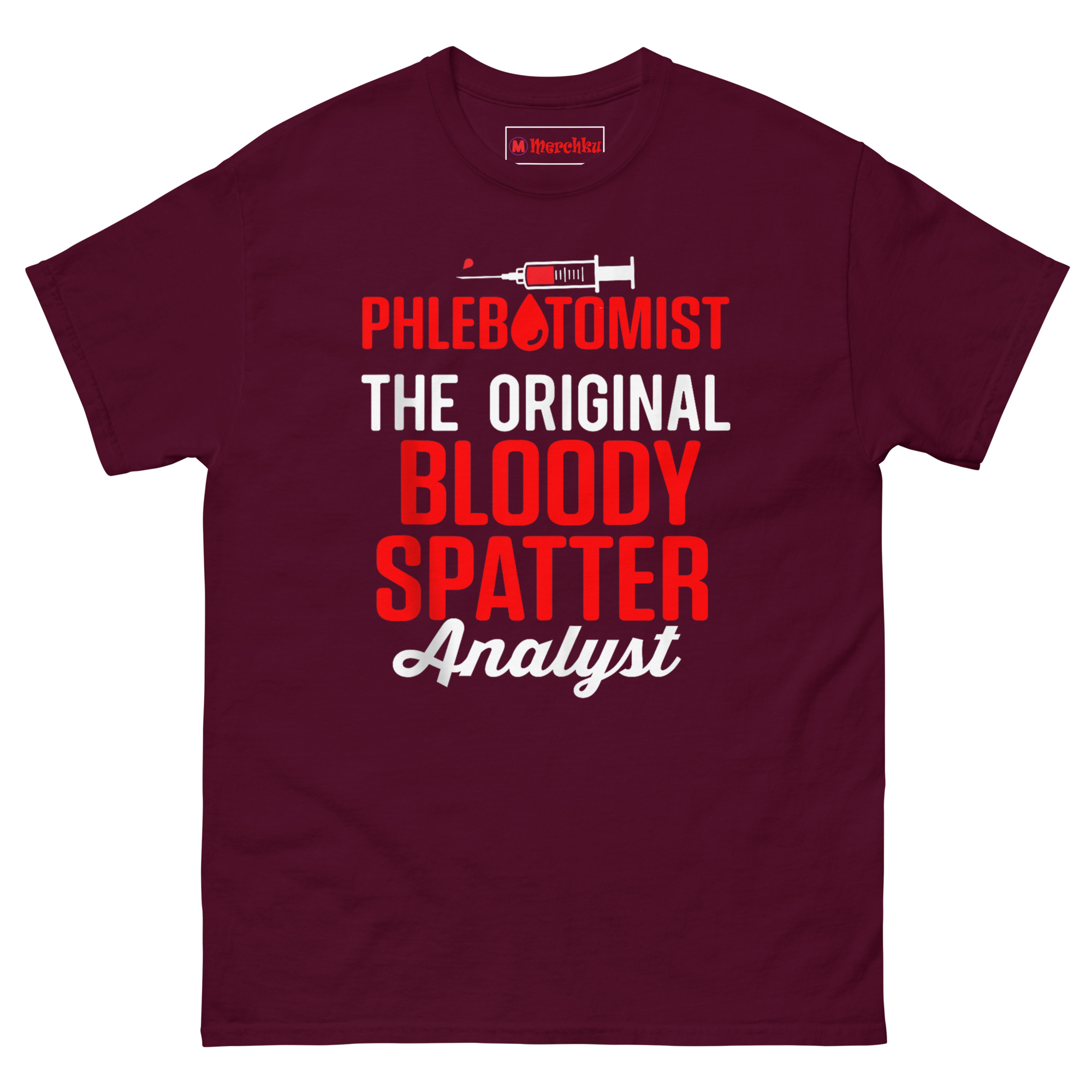 The idea for this Blood Spatter Analyst T Shirt came from a conversation with a phlebotomist friend who was tired of people asking if her job was scary. She said, “Everyone watches those true crime shows and thinks blood spatter analysts are the cool ones. Meanwhile, I’m the one actually handling the blood.” That stuck with me. There is a real irony there. Pop culture glamorizes forensic experts who study blood from a distance, but phlebotomists are the ones with the needles, drawing the samples, and dealing with the mess up close. We wanted to give them the recognition they deserve. The design plays with that contrast. “Phlebotomist” sits at the top with a blood drop replacing the ‘O’, because that is the actual job title. Below it, “BLOODY SPATTER” dominates the center in massive, distressed red letters. It is a nod to forensic science. Finally, “Analyst” in an elegant cursive adds that touch of professional irony. It says, “I was handling blood before it was cool.” This shirt is for the medical pros who know the real work happens at the bedside, not just on TV.