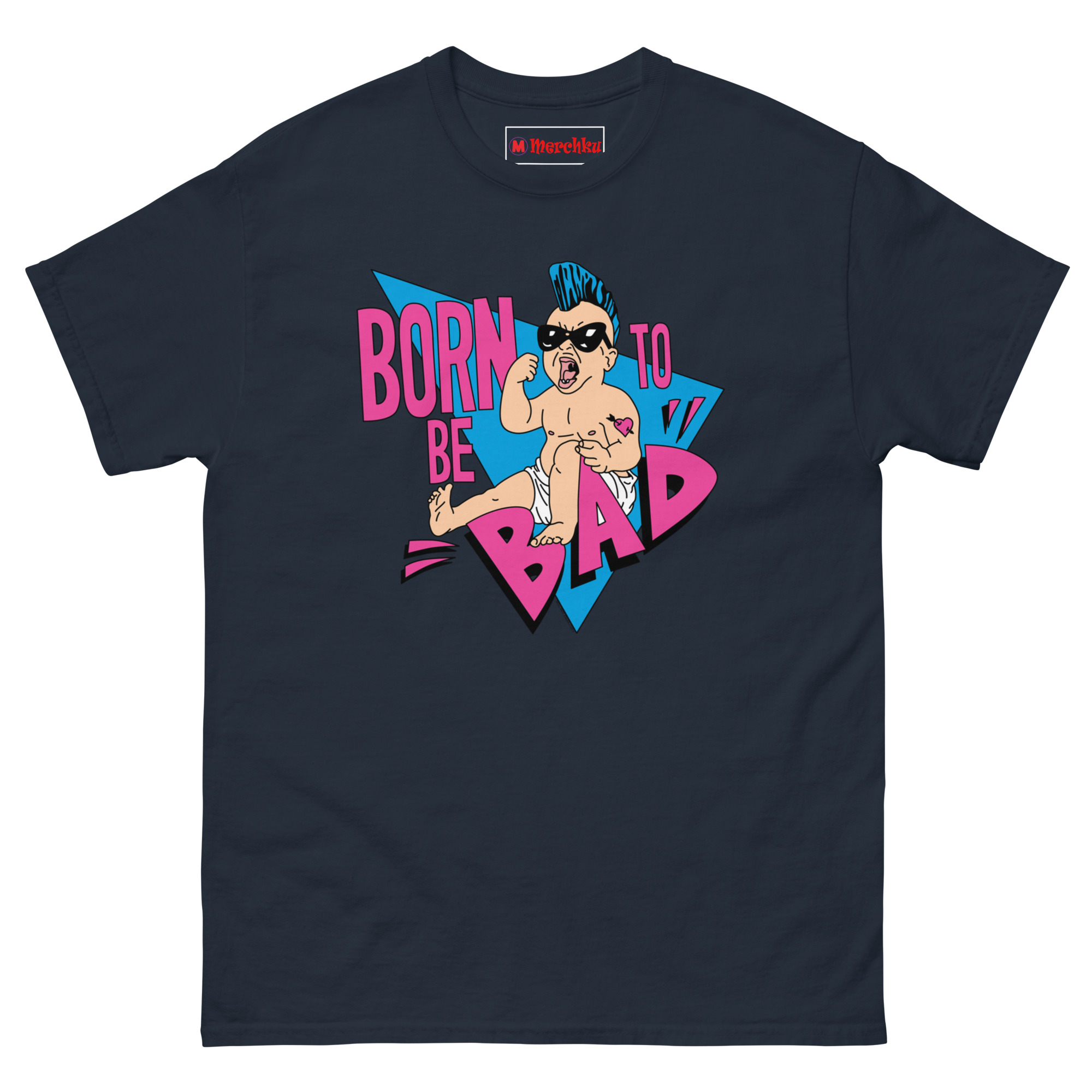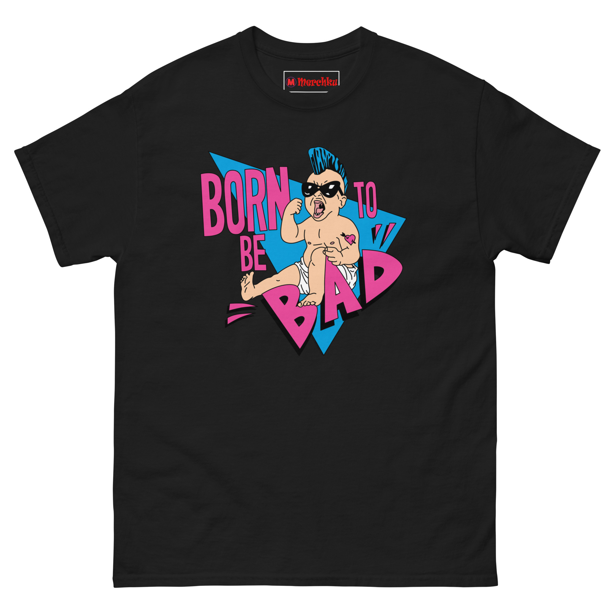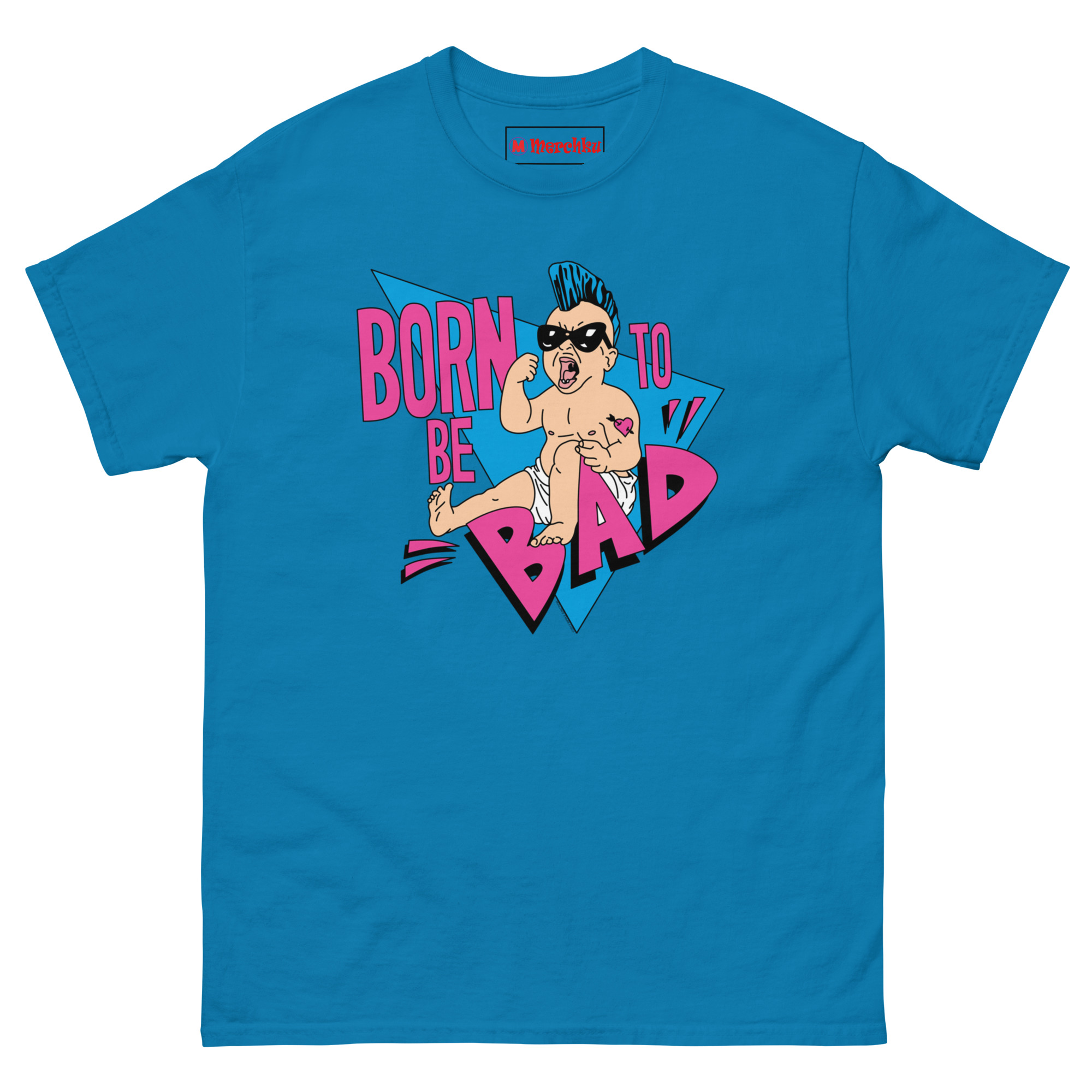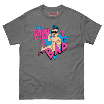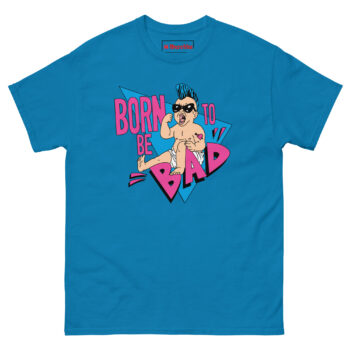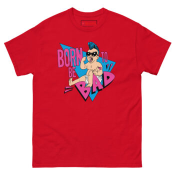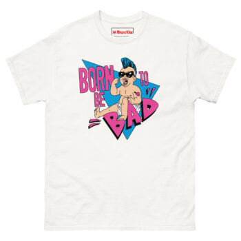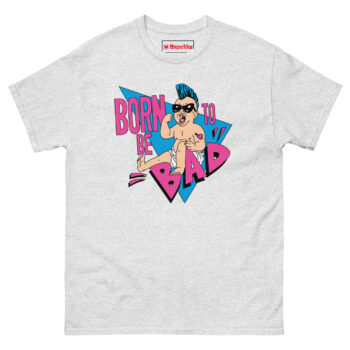 The Born To Be Bad T Shirt concept started with a simple question: what if babies came out of the womb already rebelling? Instead of the usual cute and cuddly onesies, we imagined a kid born with a built-in desire to cause trouble. The electric blue mohawk represents that defiant spirit, while the “Mom” heart tattoo on the arm adds a layer of ironic humor, even rebels love their mothers. We wrapped the character in retro triangles and a bold neon palette inspired by the 1990s radical style of skateboard graphics and vintage punk flyers. The magenta typography and distressed lettering complete the look, giving it an authentic screen-printed aesthetic that feels like it came straight from a 90z zine.