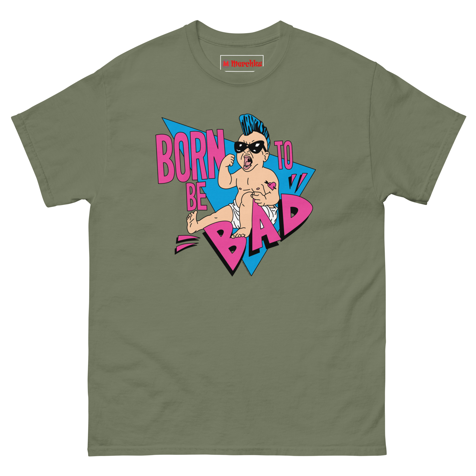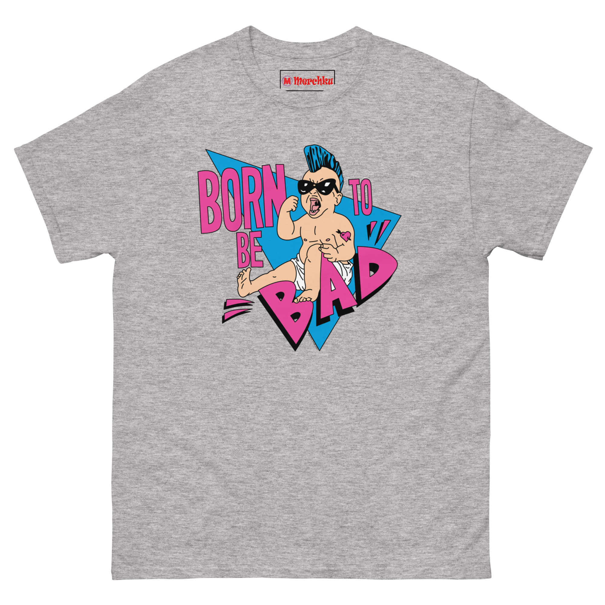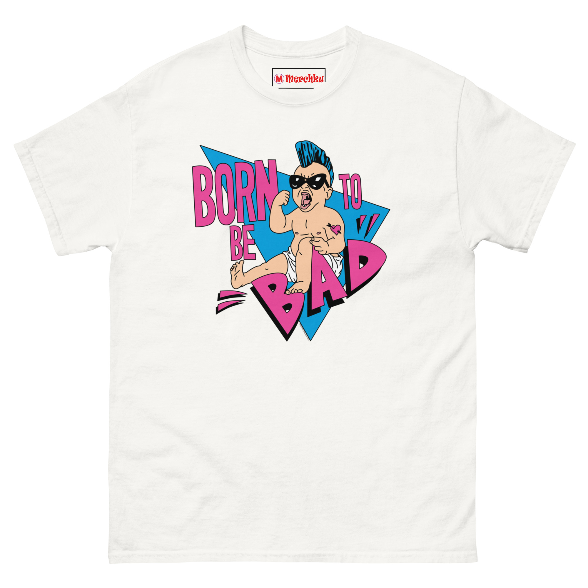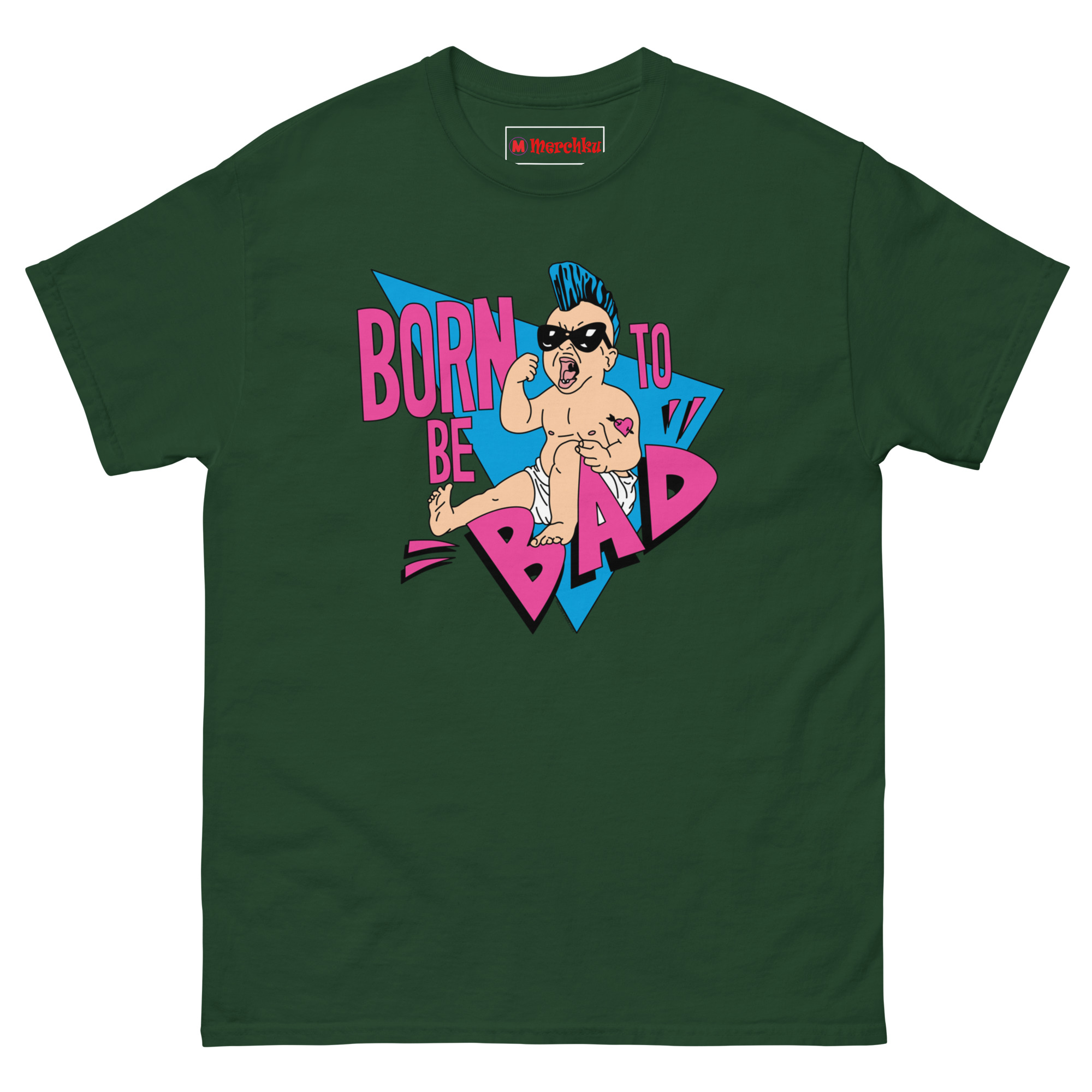 The Born To Be Bad T Shirt concept started with a simple question: what if babies came out of the womb already rebelling? Instead of the usual cute and cuddly onesies, we imagined a kid born with a built-in desire to cause trouble. The electric blue mohawk represents that defiant spirit, while the “Mom” heart tattoo on the arm adds a layer of ironic humor, even rebels love their mothers. We wrapped the character in retro triangles and a bold neon palette inspired by the 1990s radical style of skateboard graphics and vintage punk flyers. The magenta typography and distressed lettering complete the look, giving it an authentic screen-printed aesthetic that feels like it came straight from a 90z zine.