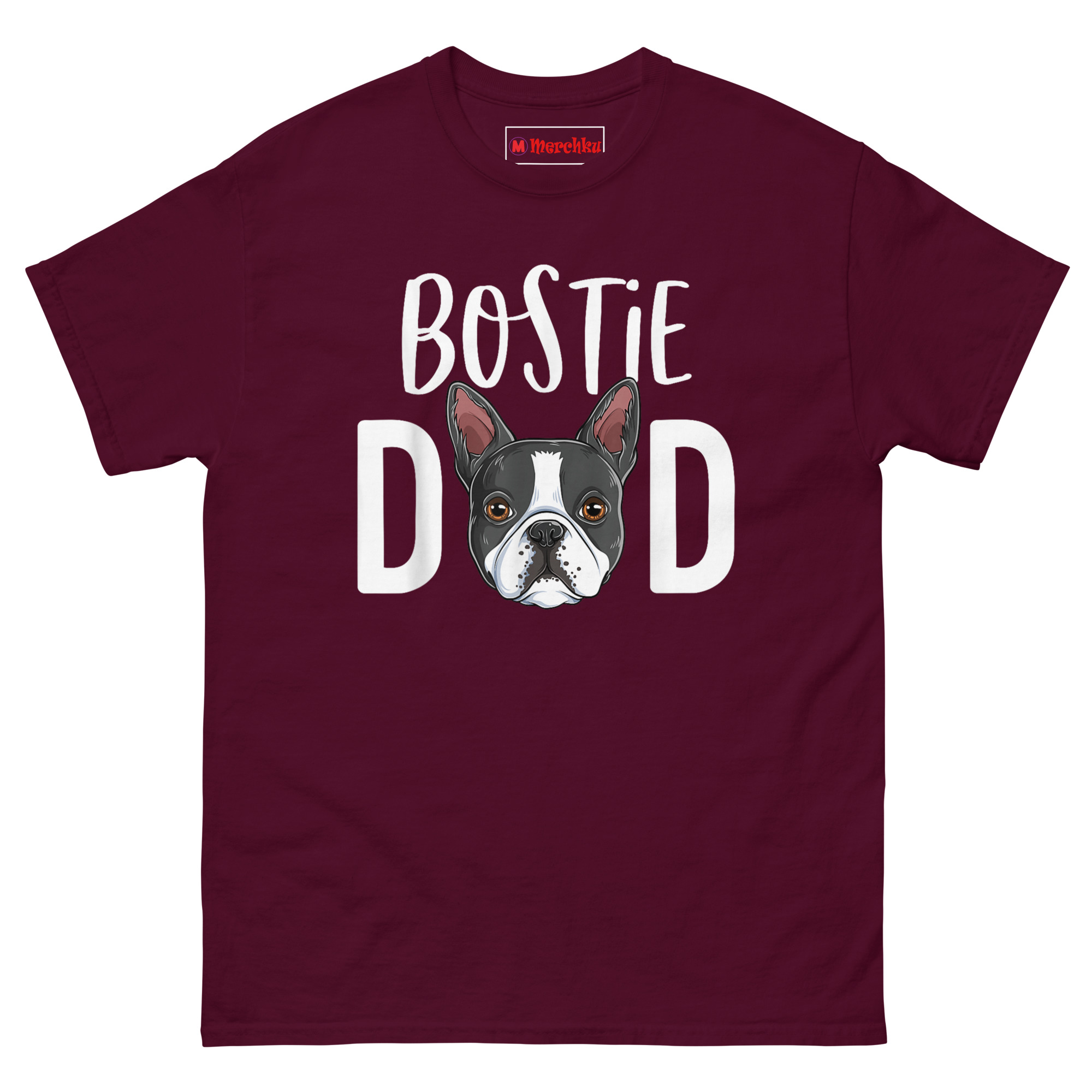 This Bostie Dad T Shirt is cut in a true classic fit, which means it runs true to size for most body types. It is not an athletic slim cut, so there is plenty of breathing room in the chest and midsection. If you typically wear a large in standard department store brands, choose a large here for a comfortable, relaxed look. For a more tailored or fitted appearance, you might consider going one size down. Refer to the specific chest width measurements in the size dropdown to confirm your best match, with options available from Small through 5XL.