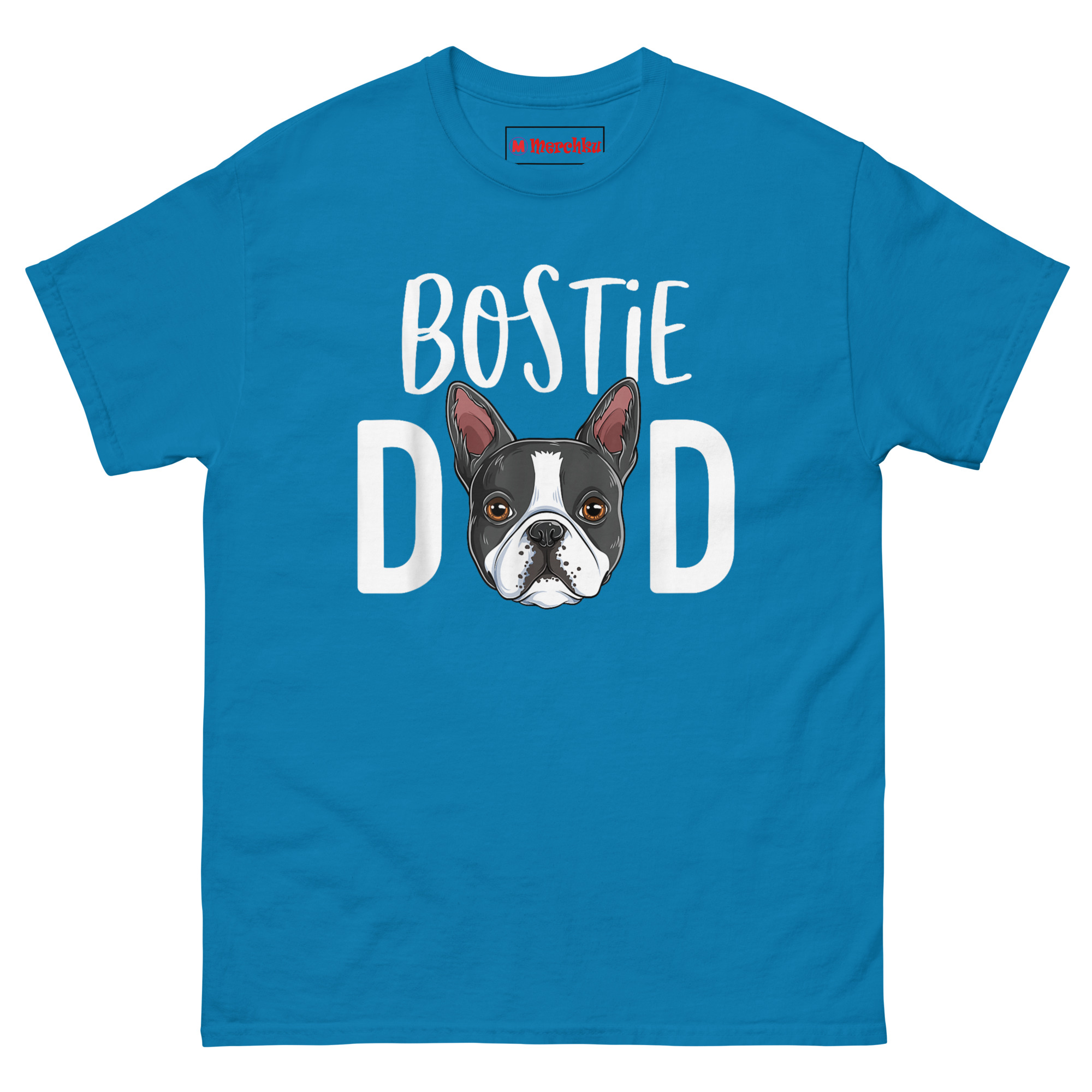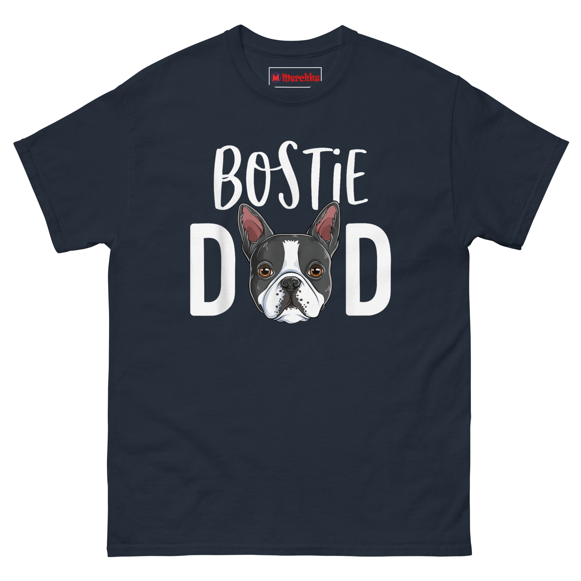 The spark for Bostie Dad T Shirt came from a neighbor who joked that he couldn’t fill out a form without listing his Boston Terrier as a dependent. That idea, that the dog is a core part of the family unit, became the driving force behind the layout. Instead of just slapping a cartoon on the chest, we integrated the breed directly into the wearer’s title. At the top, the nickname “BOSTIE” sits in a friendly, hand-drawn font. Below that, the word “DAD” appears in strong block letters, but the “A” is completely replaced by a detailed portrait of a Boston Terrier’s face. Consequently, the illustration showcases the soulful brown eyes and crisp tuxedo markings that make the breed so recognizable. This approach moves beyond a simple novelty tee; it gives the wearer a piece of “Pride Wear” that is stylish and subtle. In addition, the white ink finish contrasts sharply with the dark shirt fabric, ensuring the dog’s expression remains the clear focal point of the conversation.