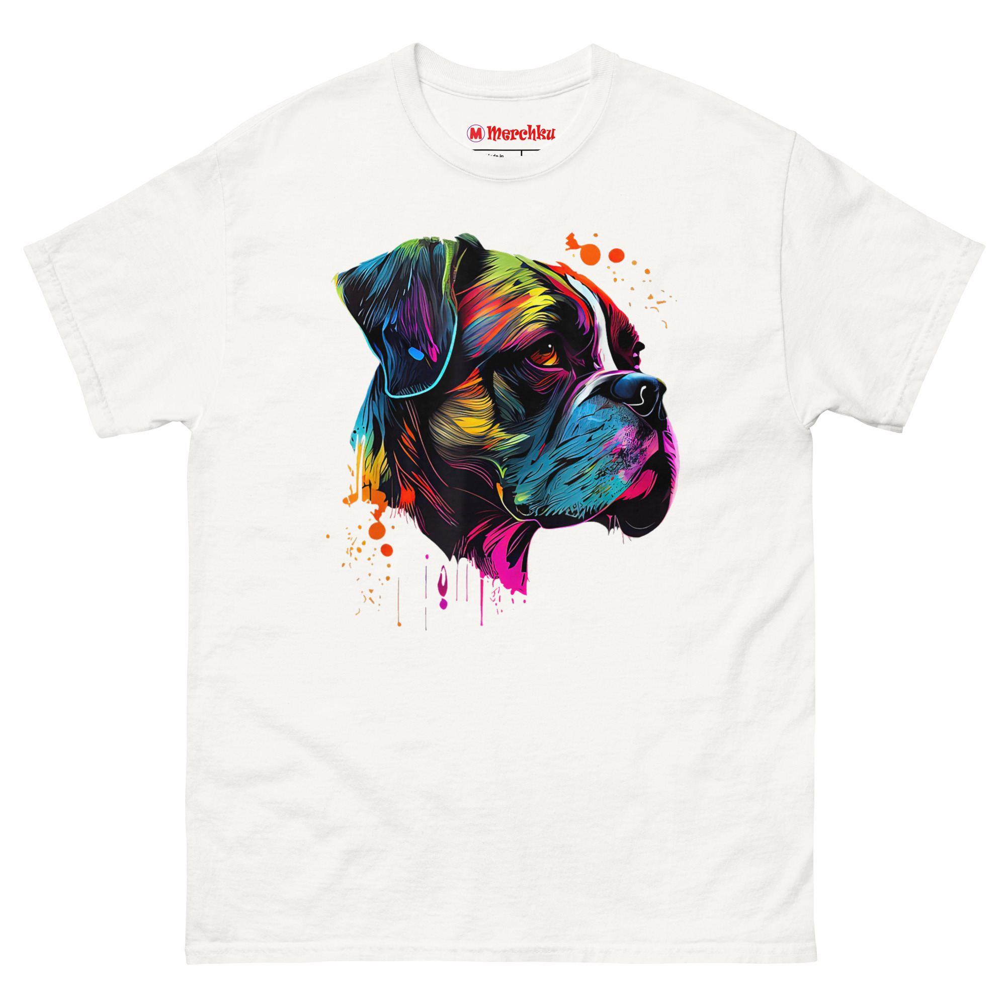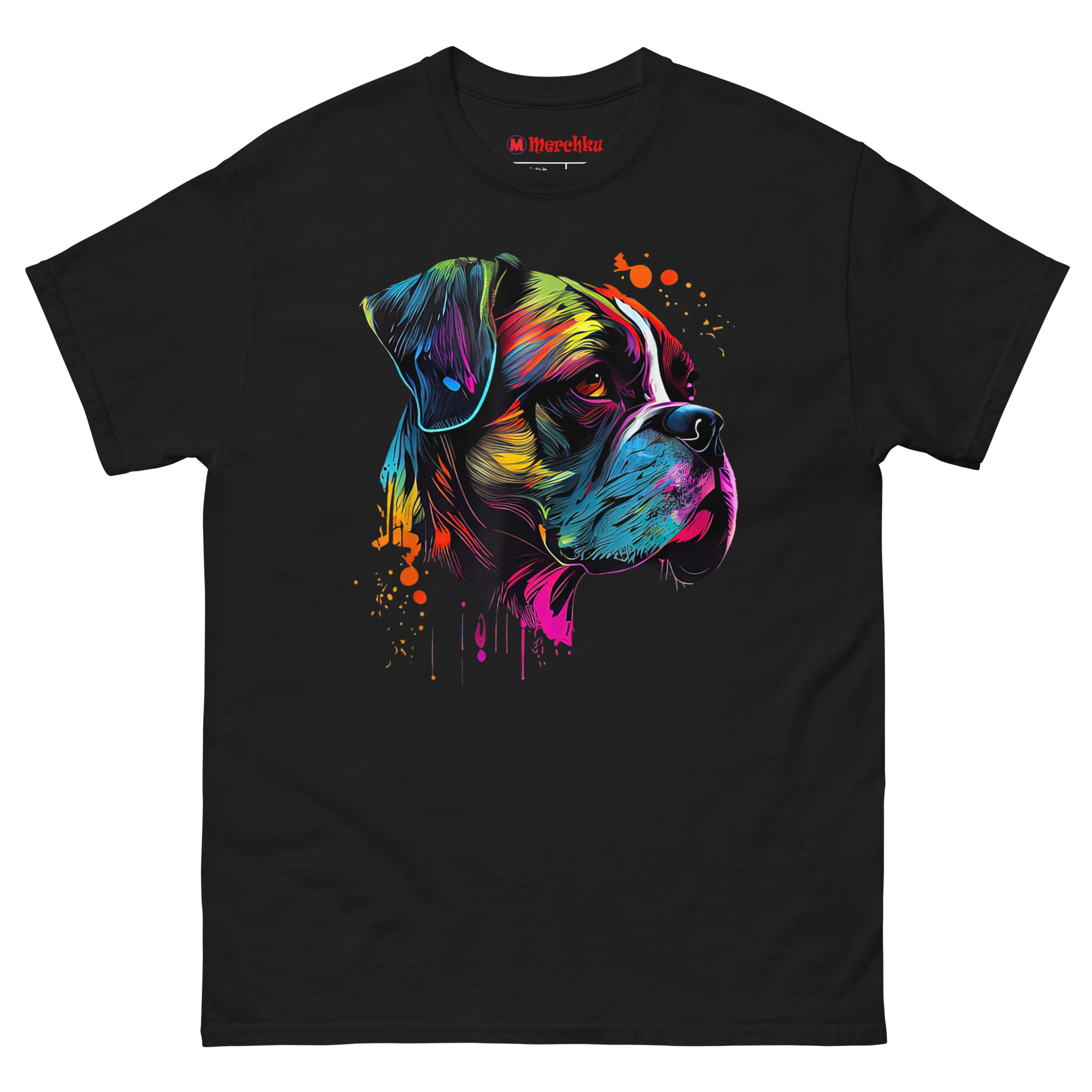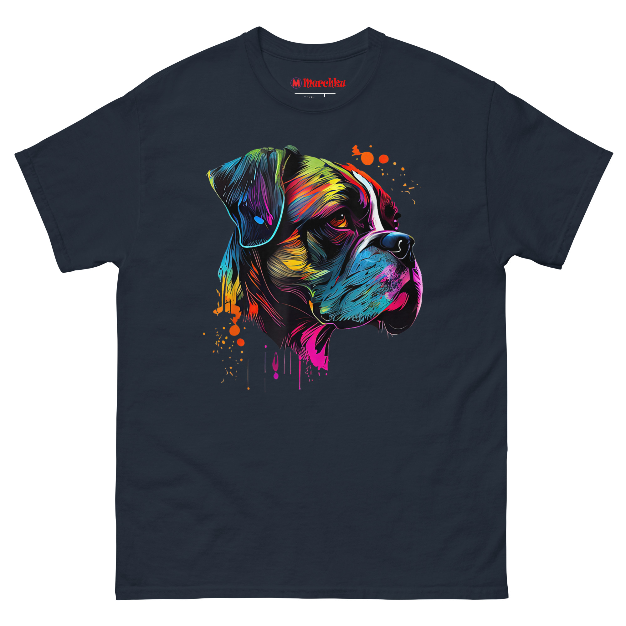 Boxer Artwork T Shirt design visualizes that explosive personality. We started with a black canvas to make the colors pop, symbolizing the light a Boxer brings into your home. The side profile highlights the breed’s iconic silhouette and strong jawline, giving a nod to their guardian nature. However, instead of solid colors, we used fluid lines of electric blue, neon yellow, and deep magenta. We then added intentional paint drips and splatters for a raw, creative feel. The warm amber tone in the dog’s expressive canine gaze is designed to feel alive, creating a connection between the art and the viewer that feels immediate and personal.