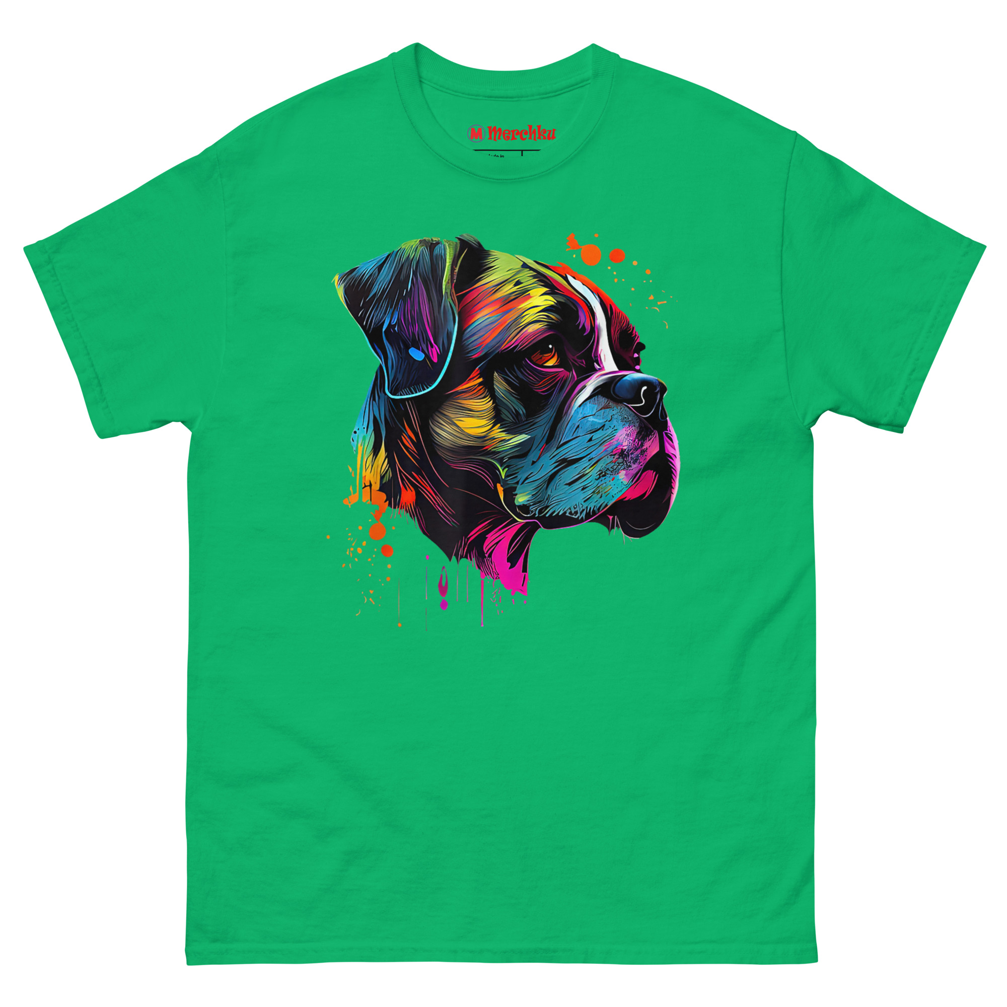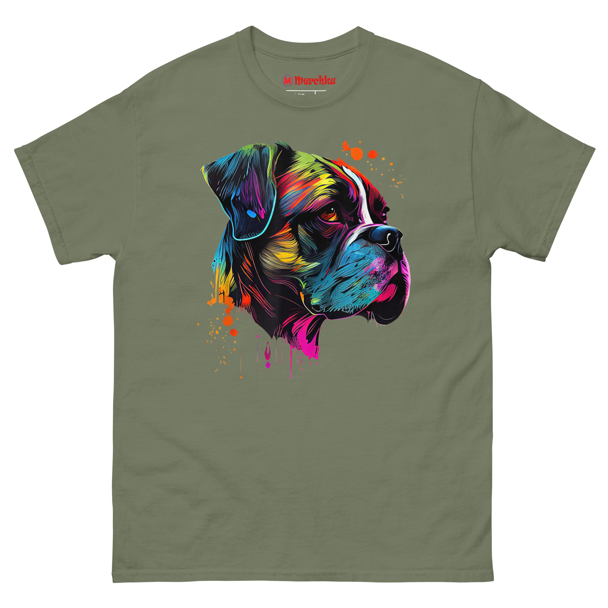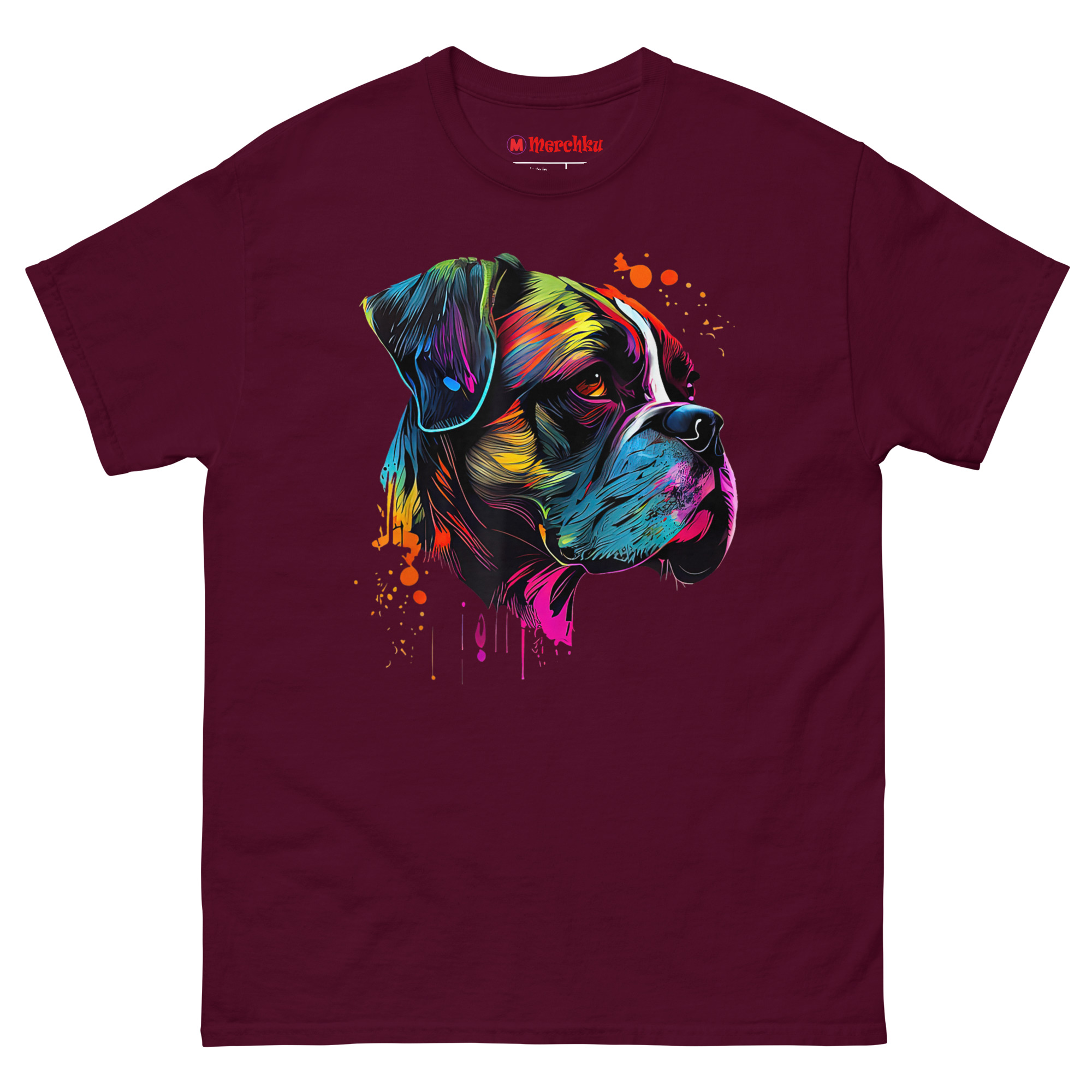 Boxer Artwork T Shirt design visualizes that explosive personality. We started with a black canvas to make the colors pop, symbolizing the light a Boxer brings into your home. The side profile highlights the breed’s iconic silhouette and strong jawline, giving a nod to their guardian nature. However, instead of solid colors, we used fluid lines of electric blue, neon yellow, and deep magenta. We then added intentional paint drips and splatters for a raw, creative feel. The warm amber tone in the dog’s expressive canine gaze is designed to feel alive, creating a connection between the art and the viewer that feels immediate and personal.