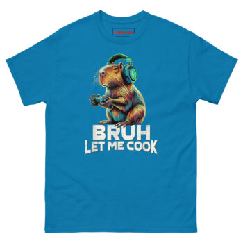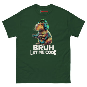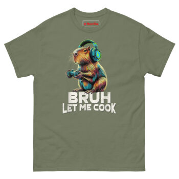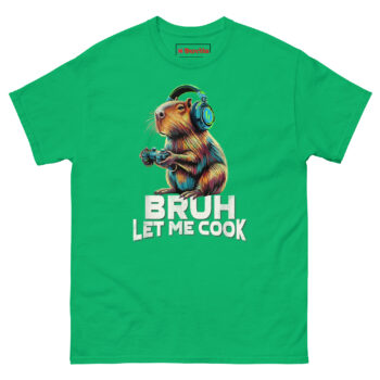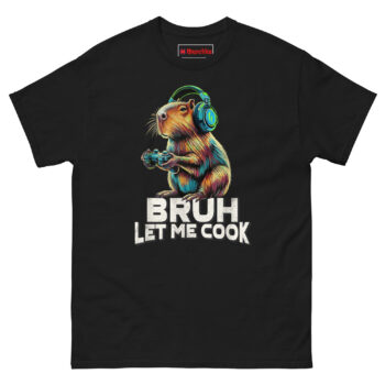 Meet the shirt that combines two internet favorites: chill animals and gamer slang. The Bruh Let Me Cook T Shirt features a vibrant, psychedelic capybara locked in with glowing headphones and a controller. It is designed for gamers, meme lovers, and anyone who appreciates the art of staying cool under pressure while dominating the leaderboard.
