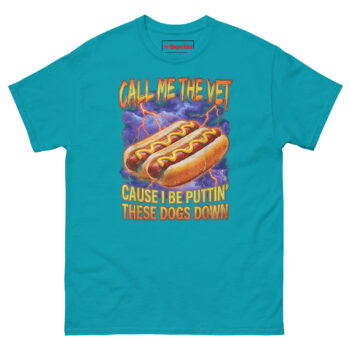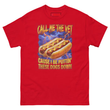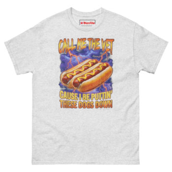 The Call Me The Vet Hot Dog T Shirt is exactly what it sounds like: a 100% cotton tee that turns a stressful veterinary shift into a moment of dark, hilarious relief. What makes it unique is the “90s bootleg” graphic featuring hot dogs in a thunderstorm, perfect for anyone who needs to laugh after a long day. Designed specifically as a funny gift for veterinarians and office staff who also love hot dogs, this shirt fits the clinic crowd better than a pair of scrubs.