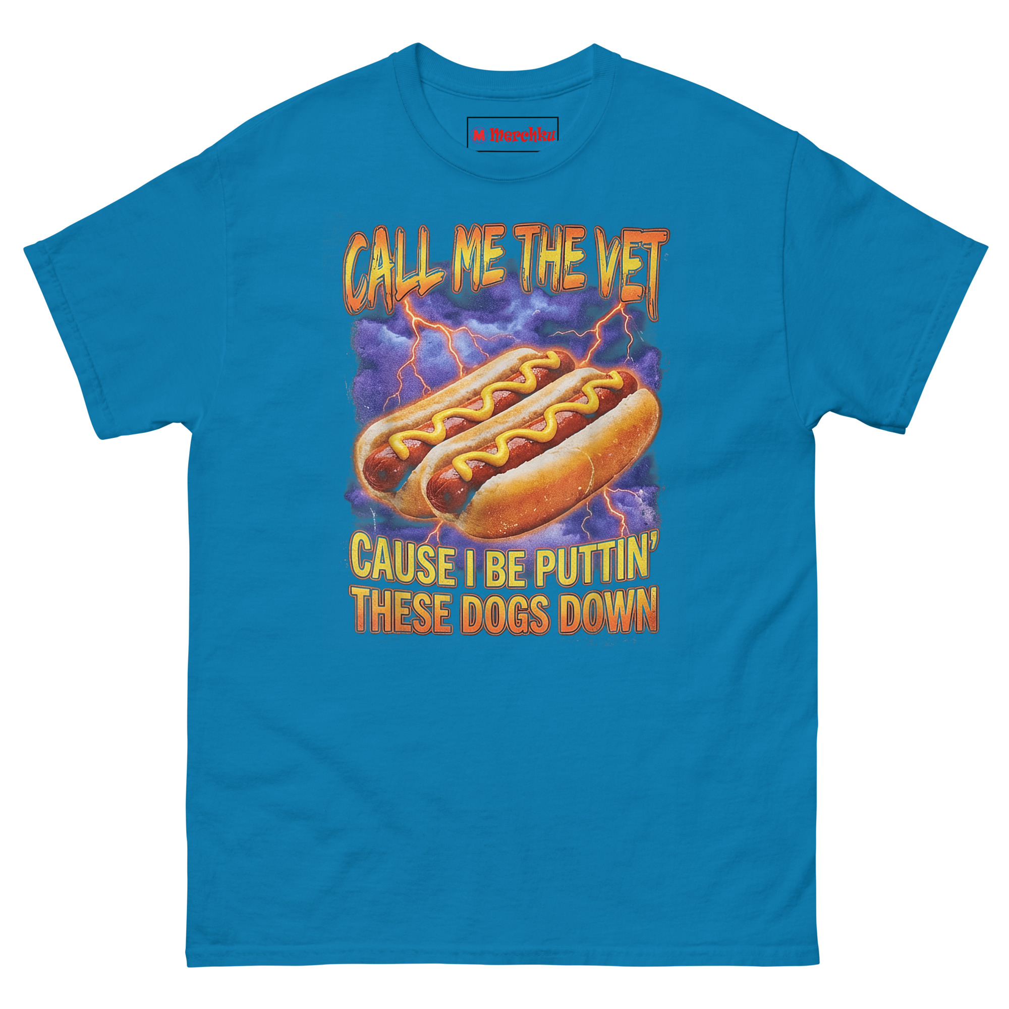 The artwork follows a true 90s bootleg aesthetic. You get hyper-realistic hot dogs with lightning bolts and purple clouds behind them, almost like a vintage arcade poster gone wrong (in the best way). The bold text reads “CALL ME THE VET” and “CAUSE I BE PUTTIN’ THESE DOGS DOWN.” It’s a membership badge for the iron-humored animal medicine crowd, blending internet meme culture with professional reality.