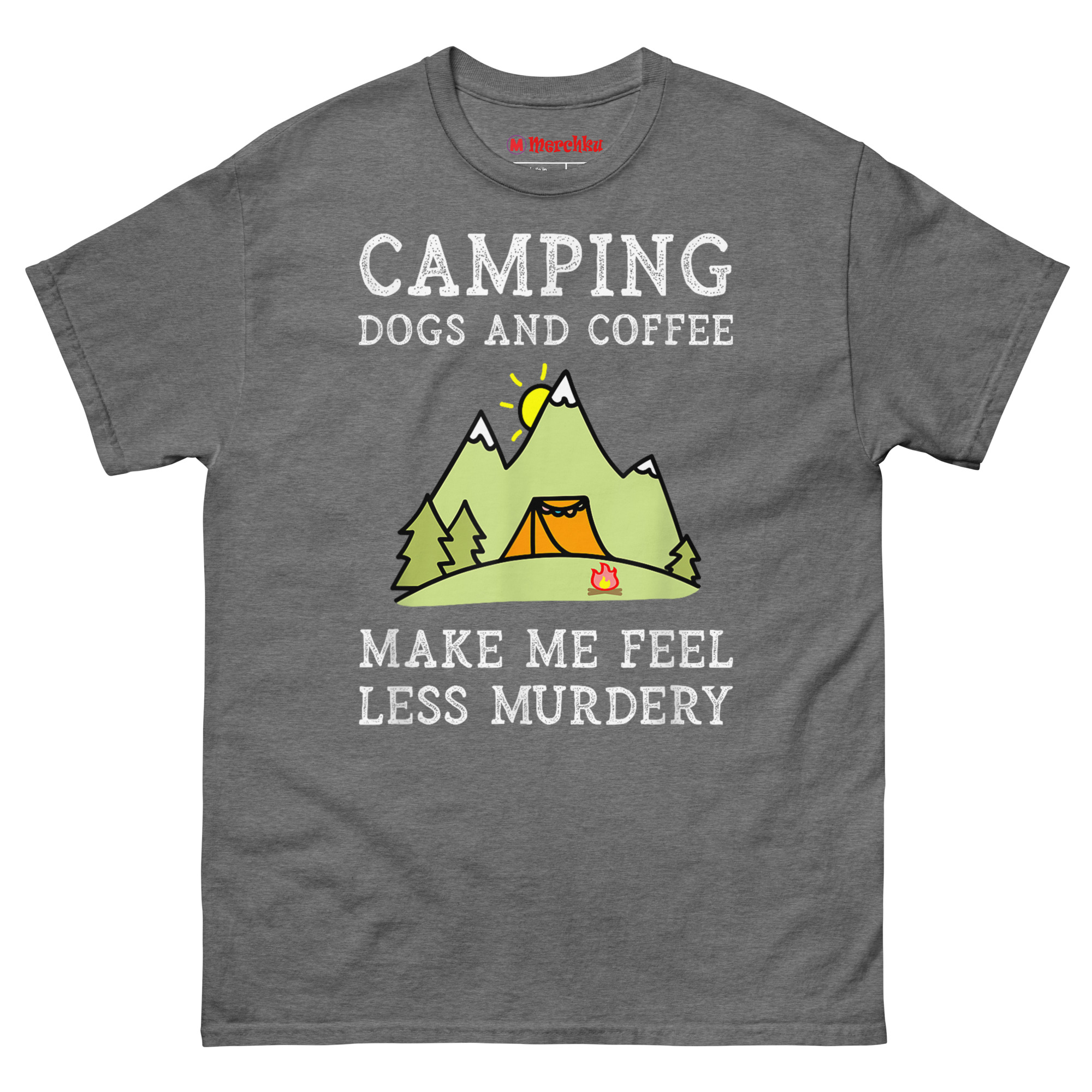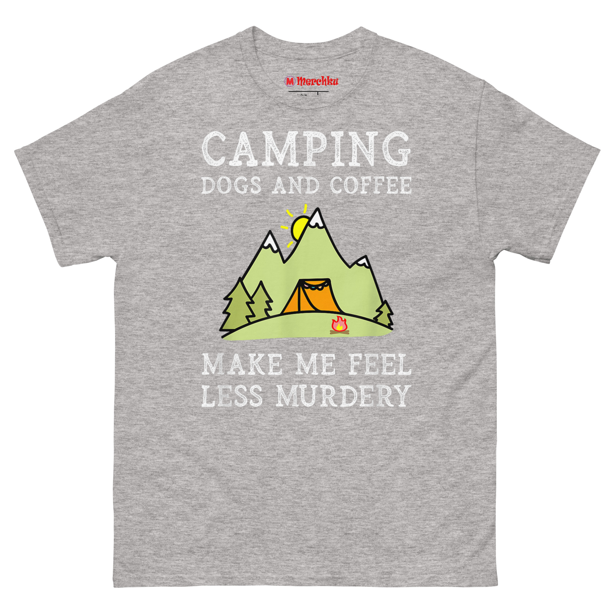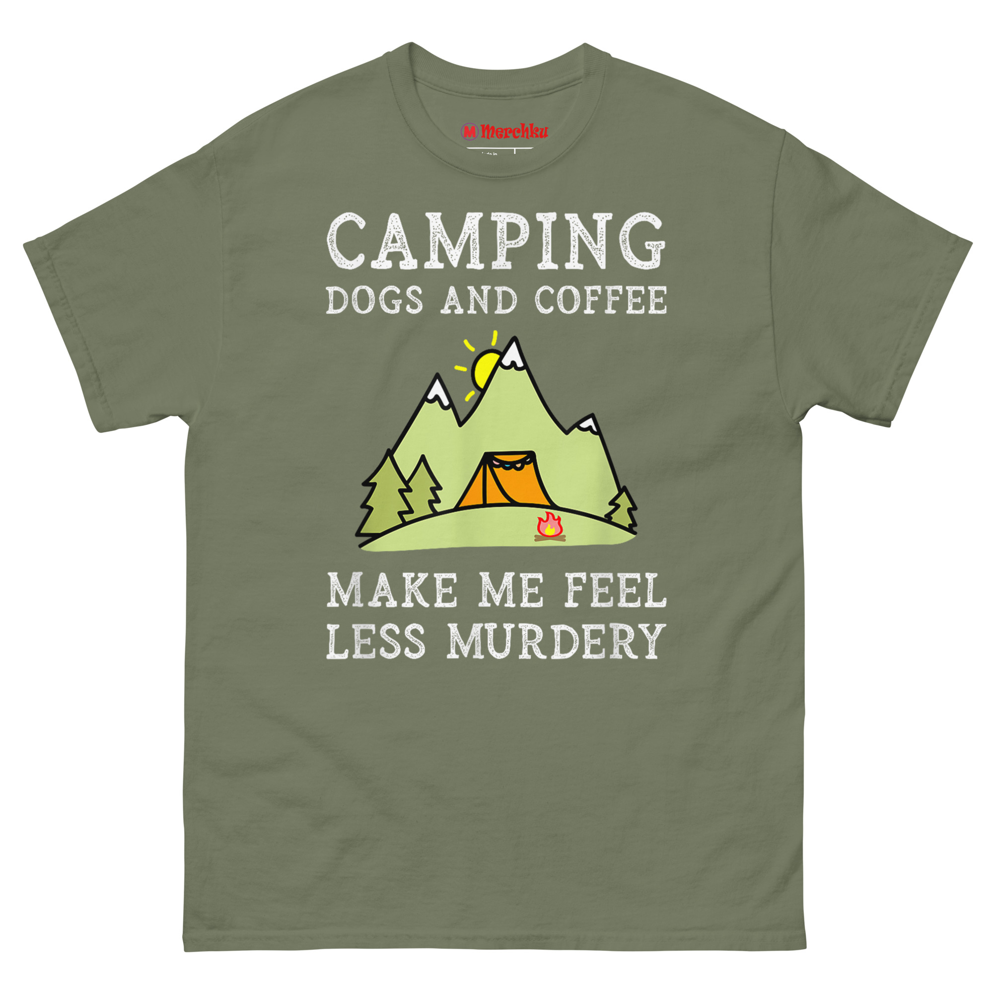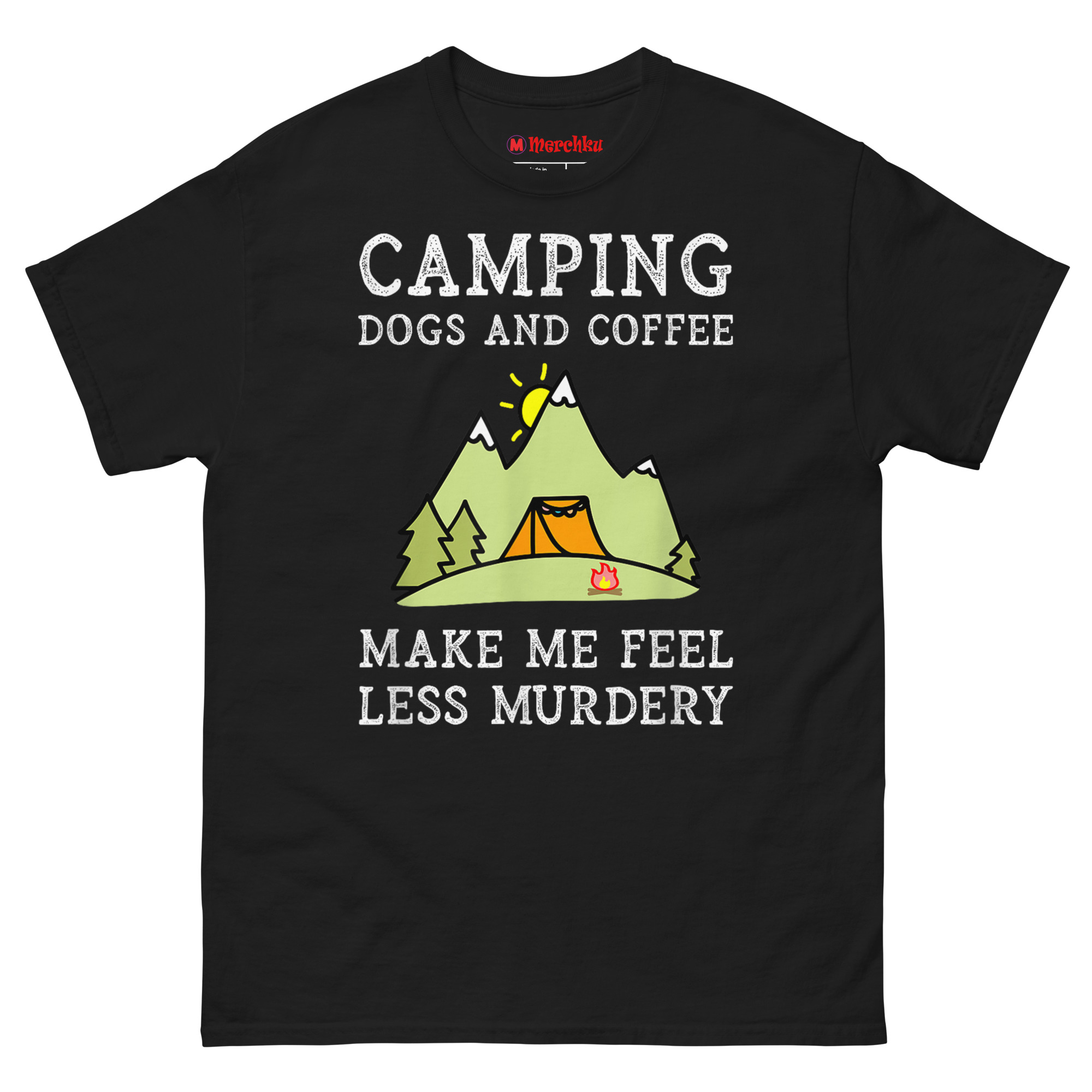 In a world that never stops demanding attention, the quiet of the woods becomes a mental health requirement. Dogs offer unconditional loyalty without judgment. Coffee provides the baseline patience needed to deal with… well, everything else. The design uses a playful, hyperbolic term, “Murdery”, that’s become popular internet slang for being extremely annoyed by people. It’s an immediate connection point for anyone who views the wilderness as a sanctuary from human chaos. The distressed “chalkboard” font and cheerful cartoon mountains, sun, and tent create a charming contrast with the darkly humorous text. It’s the perfect funny gift for antisocial outdoor enthusiasts who need a reminder of what truly matters.