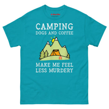 This is the Camping Dogs Coffee Make Me Feel Less Murdery T Shirt, a brutally honest statement for anyone who needs a break from humanity. It features a whimsical mountain landscape illustration paired with a punchline that perfectly captures the burnout era. Designed for solo campers, van lifers, introverts, and anyone whose sanity depends on regular doses of wilderness, canine companionship, and caffeine.