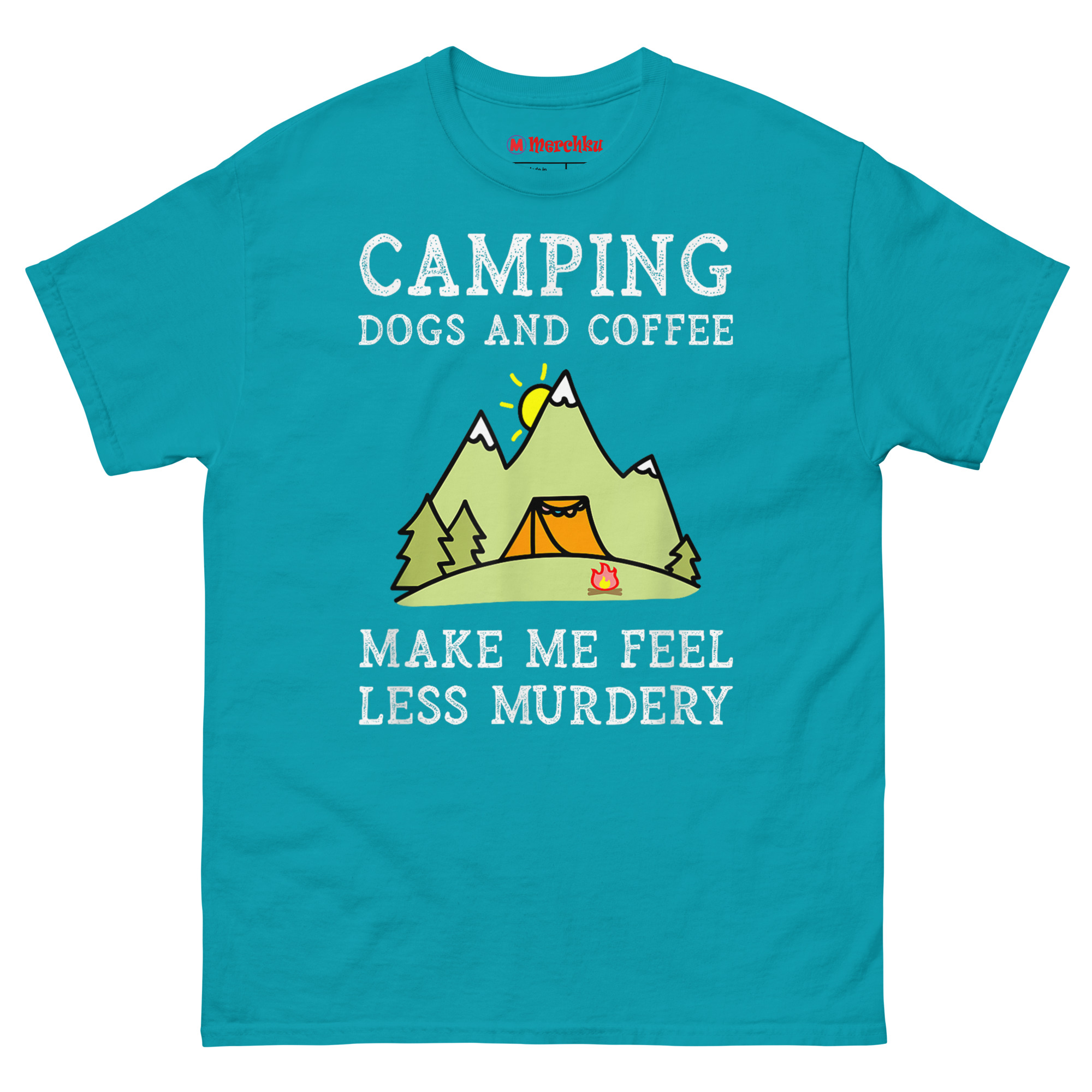 - Ink Safety: Camping Dogs Coffee Make Me Feel Less Murdery T Shirt use Oeko-Texโข certified, water-based Kornit and NeoPigment inks. They are safe and contain no high-concern chemicals.