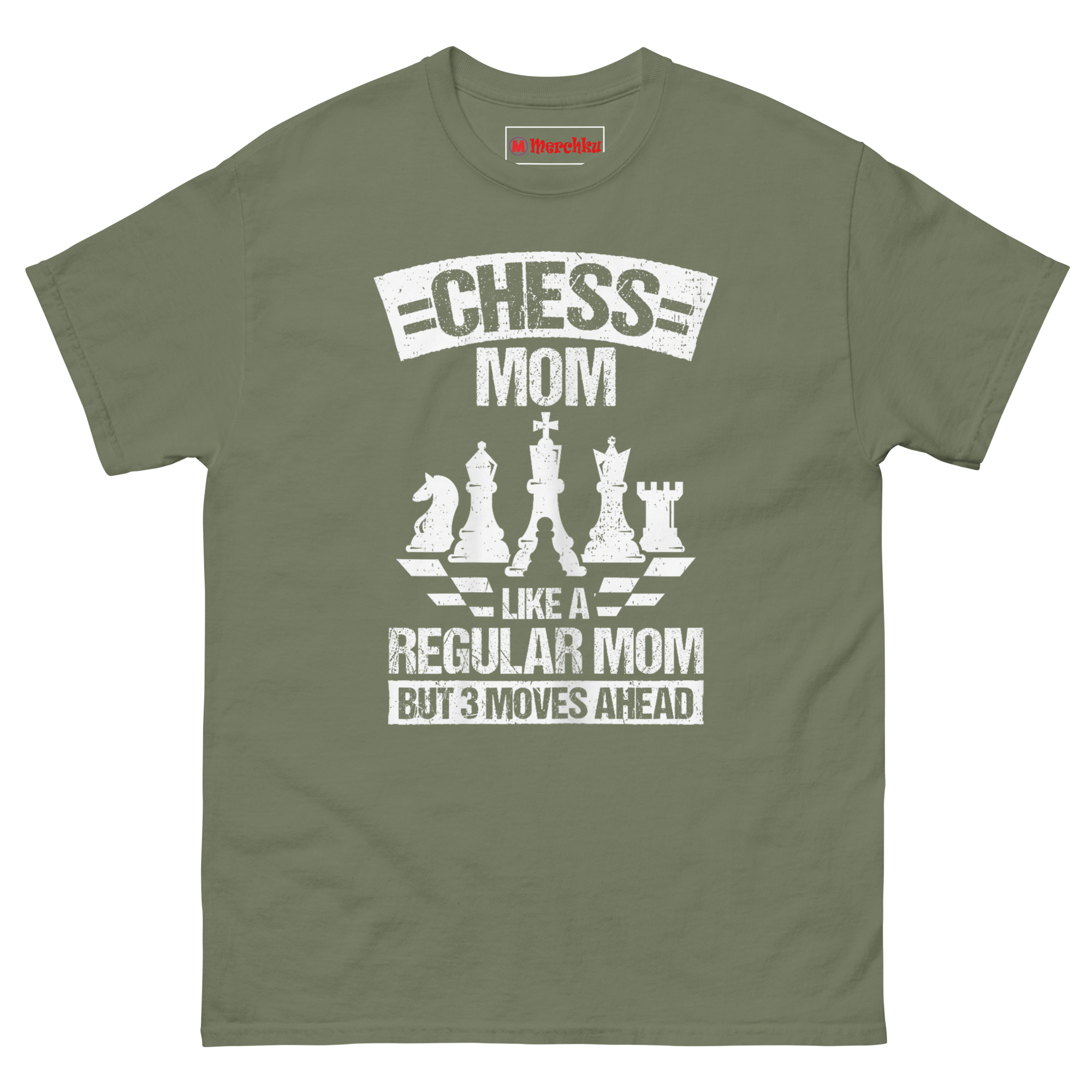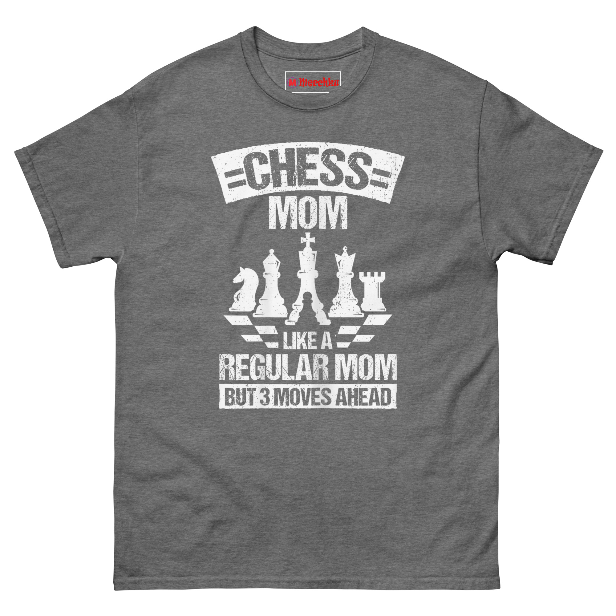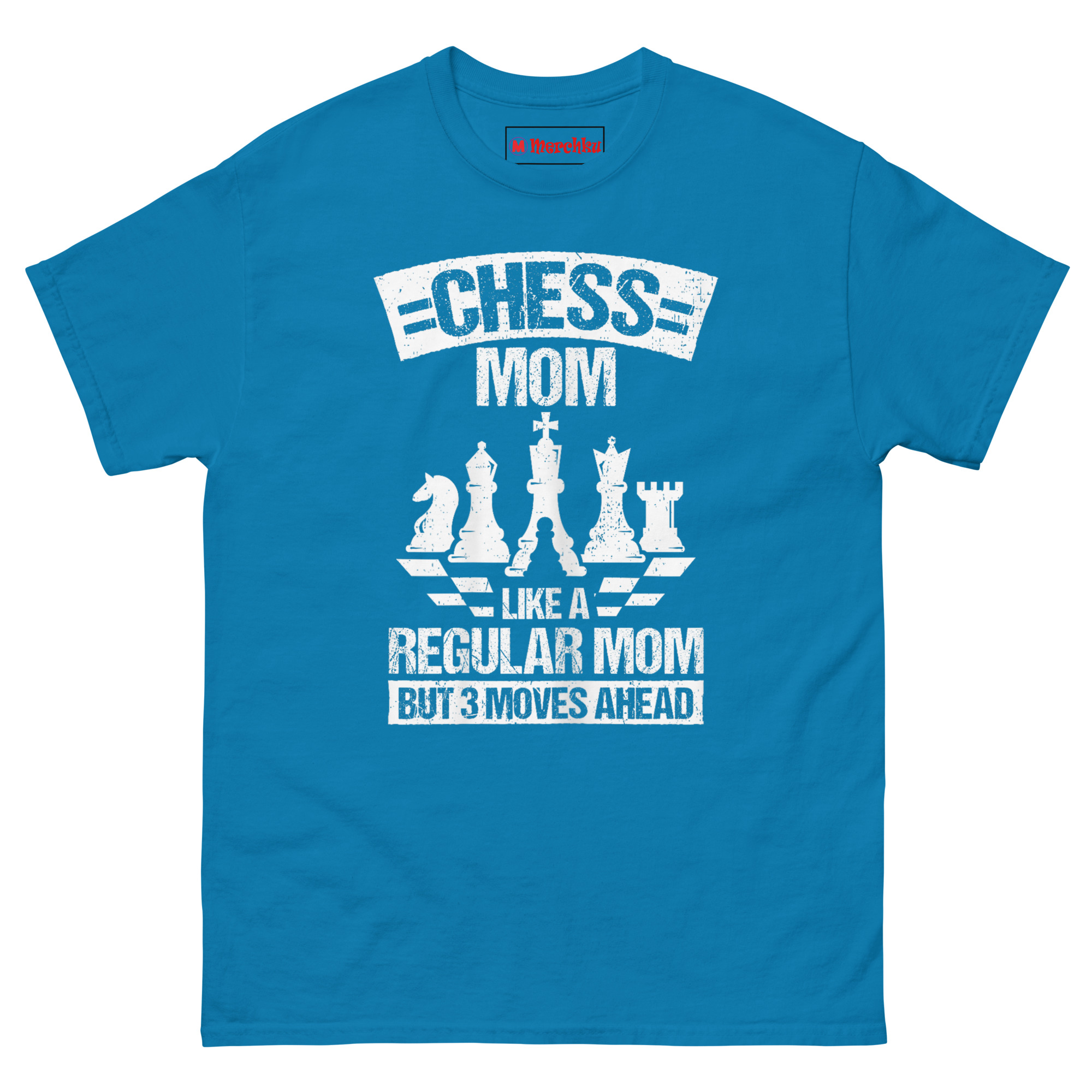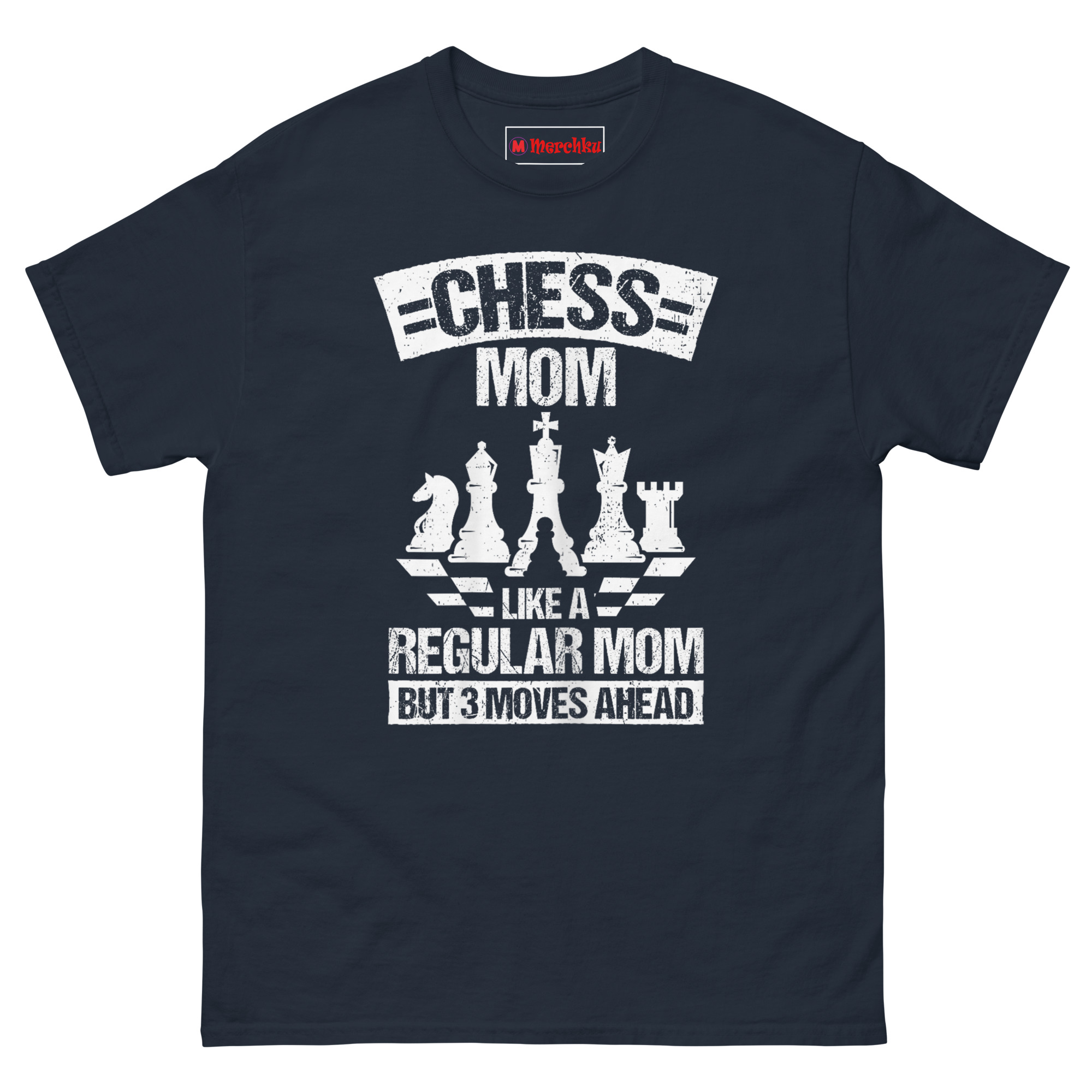 Unlike typical parenting shirts that lean cheesy, this one lands on clever. The vintage white-on-black print shows a row of chess pieces, Knight, Bishop, King, Queen, Rook with a single Pawn in front. Below, the tagline hits hard: “Like a regular mom but 3 moves ahead.” The distressed varsity font gives it a worn-in feel, like a lucky tournament jersey. It takes the “soccer mom” trope and upgrades it to something calculated, proud, and undeniably sharp.