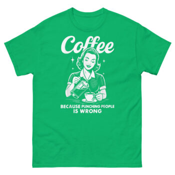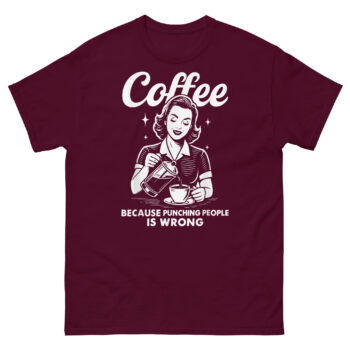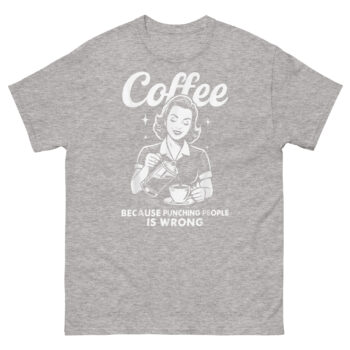 We created Coffee Because Punching People is Wrong T Shirt for the person who hasn’t spoken to anyone before their first cup. You know the feeling. The world hasn’t done anything wrong yet, but you’re already irritated. Then the coffee kicks in, and suddenly you can function like a normal human being. It’s not magic. It’s chemistry. But it feels like magic.