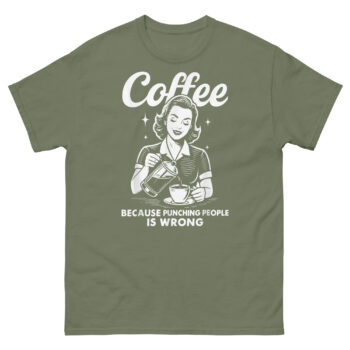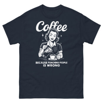 This is a beautifully vintage-inspired graphic tee for anyone whose morning brew is the only thing standing between them and chaos. The Coffee Because Punching People is Wrong T Shirt features a serene 1950s-style woman gracefully pouring coffee from a French press, surrounded by magical sparkles. It’s the ultimate sarcastic morning routine apparel for coffee lovers who understand that caffeine is a civilizing force.
