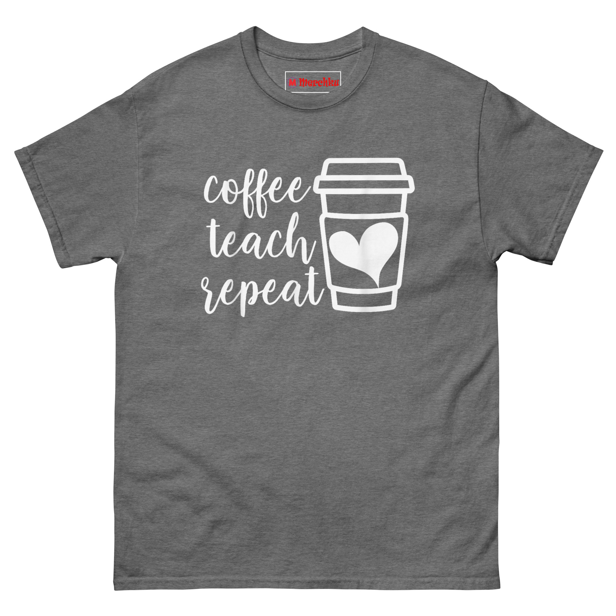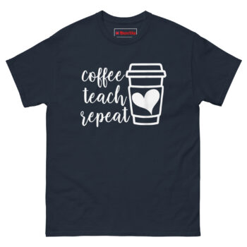 We created this Coffee Teach Repeat Shirt after watching a friend’s third cup of coffee cool down while she stayed after school to help a struggling student. That moment stuck with us. Instead of a loud, flashy print, we chose a minimalist black tee with white lettering, because great teachers don’t need to shout. The stacked script “coffee teach repeat” sits beside a takeaway cup outline. However, the real detail is the solid white heart printed directly on the cup’s sleeve. That heart isn’t decorative. It represents why teachers survive 6:00 AM alarms and late-night grading sessions. The caffeine wakes you up, but the love for your students keeps you going. It’s subtle enough for parent-teacher conferences yet meaningful enough to make another teacher smile in the hallway.