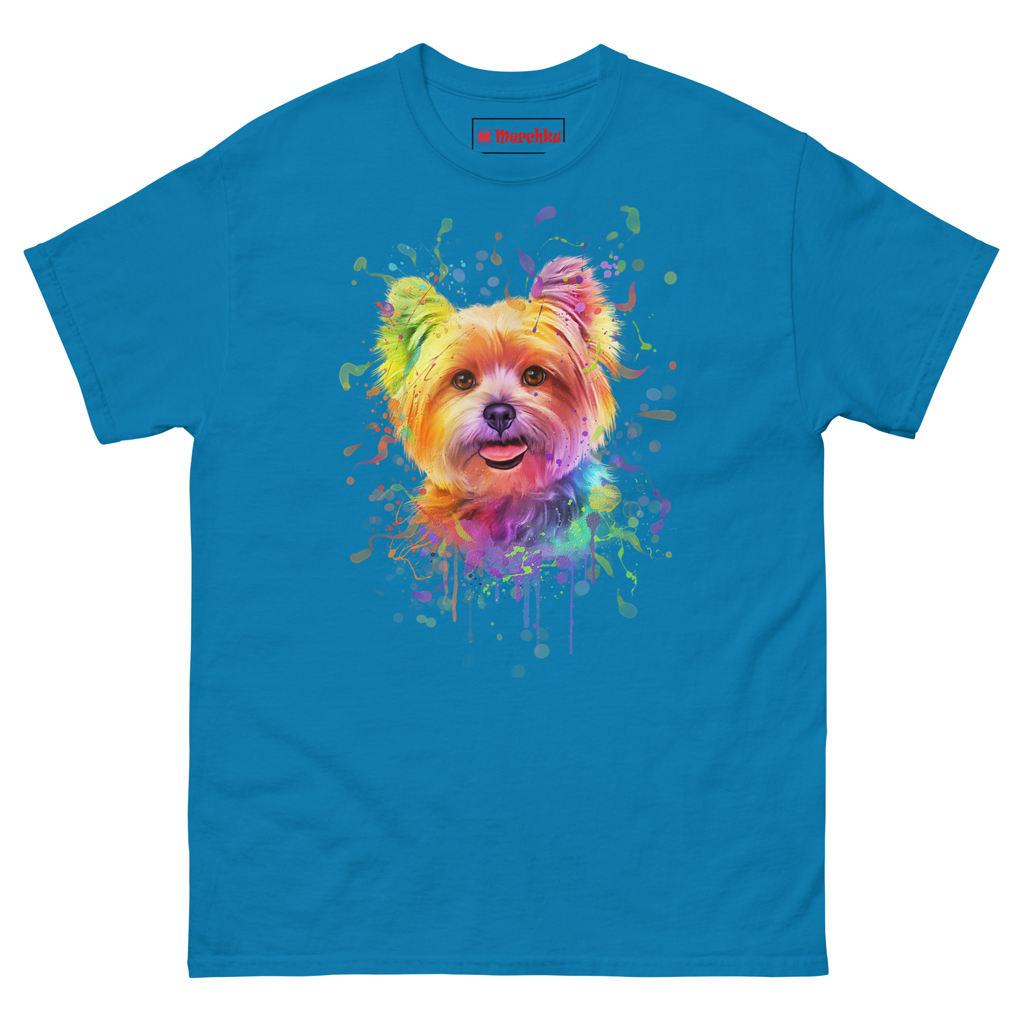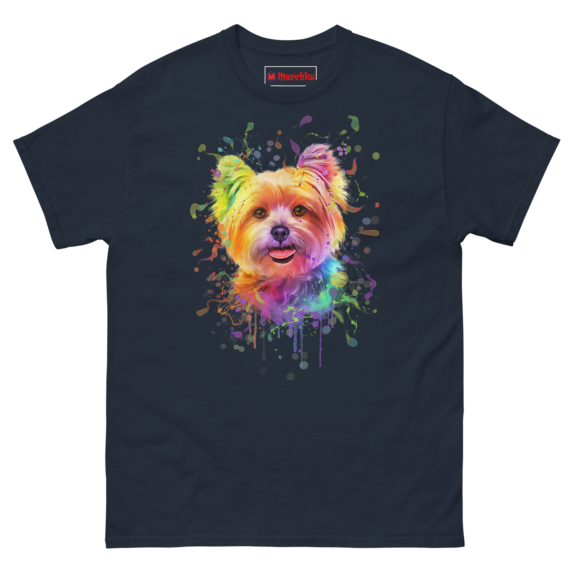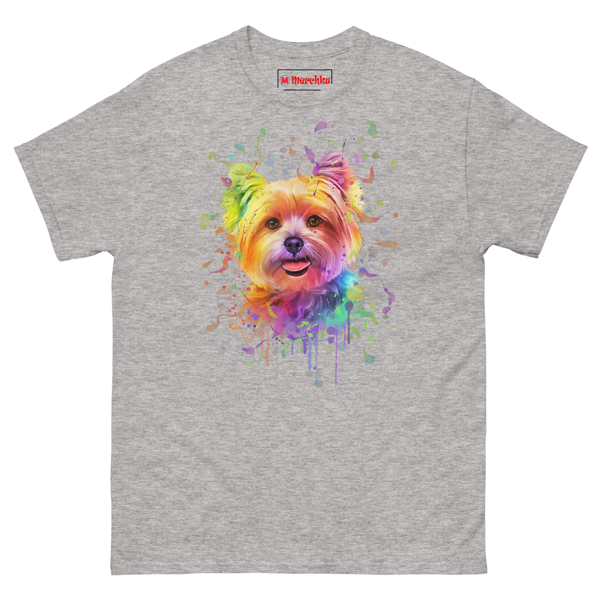 That phrase stuck with us. Yorkies aren’t calm, quiet lap dogs. They’re bursts of energy packed into four-pound bodies. They leave a trail of toys, fur, and happiness everywhere they go. So we wanted to create a portrait that looked like that energy had literally exploded onto the shirt. The watercolor style felt perfect fluid, unpredictable, and full of movement. We painted the Yorkie’s sweet face in soft rainbow tones, then let the colors explode outward in messy splatters and drips. The bottom of the design fades into a cool, wet paint effect, like the artwork is still fresh and dripping. It’s the ultimate rainbow watercolor yorkie dog face t-shirt for anyone whose dog is their favorite splash of color.