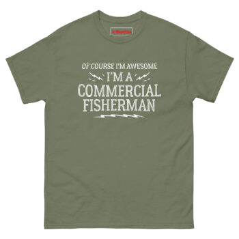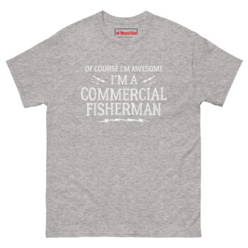 The inspiration for Commercial Fisherman T Shirt came from a conversation with a Bering Sea crab fisherman who laughed when someone called his job “adventurous.” He said, “It is not adventure. It is work. Hard, cold, dangerous work. And yeah, I am awesome at it.”