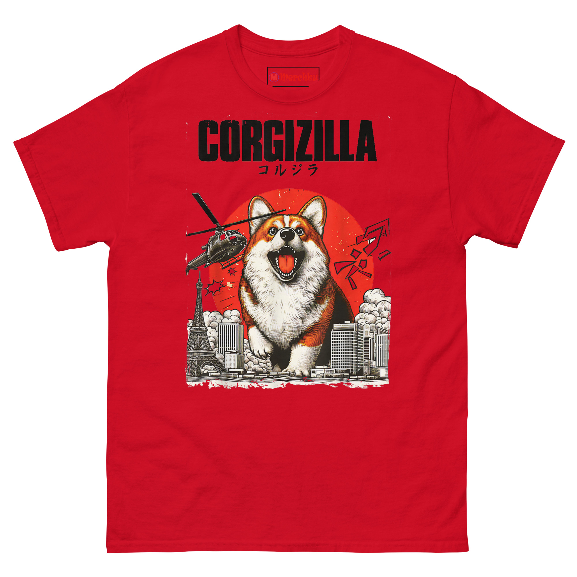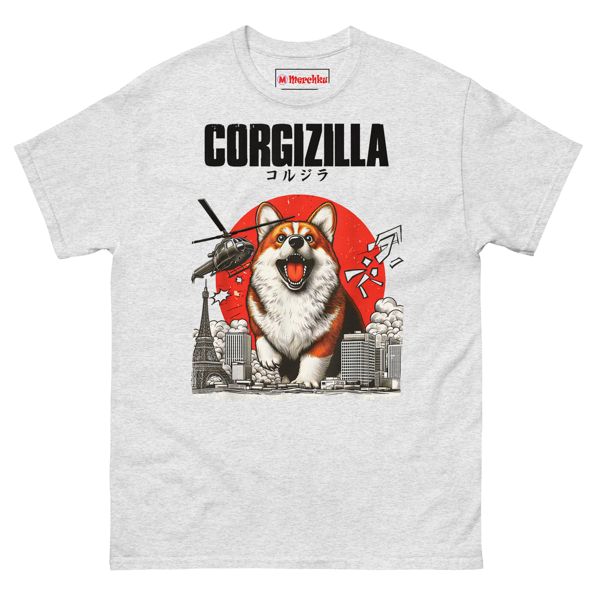 This CorgiZilla T Shirt concept came from watching a Corgi boss around dogs three times its size at the park. There is a specific confidence these little herders carry, they genuinely believe they are massive creatures. We wanted to visualize that mindset. The classic Kaiju movie poster format provided the perfect framework. Black-and-white city skyscrapers crumble under giant paws. A Tokyo-style broadcast tower leans precariously. Smoke billows everywhere while a military helicopter flies close to those happy ears. The roaring face reads as pure joy rather than destruction. Red rising sun background adds authentic Japanese monster movie vibes. Katakana translation across the top seals the homage. It captures the hilarious contrast between a creature that should be terrifying and one that primarily wants belly rubs. This is Kaiju apparel for anyone who understands that small dogs have the biggest personalities.