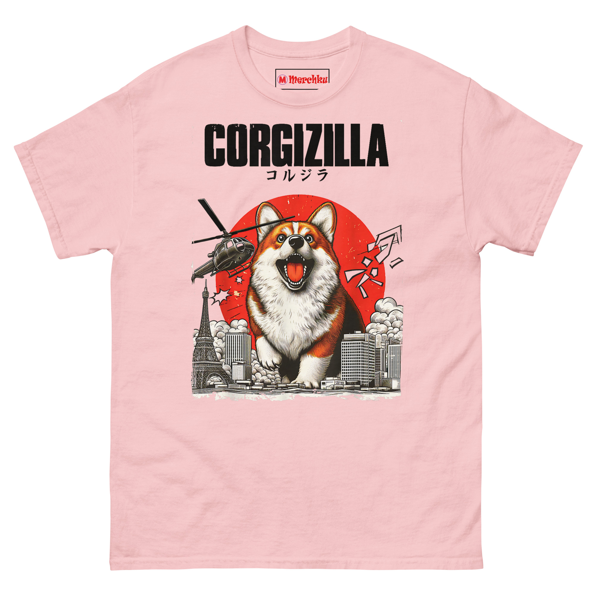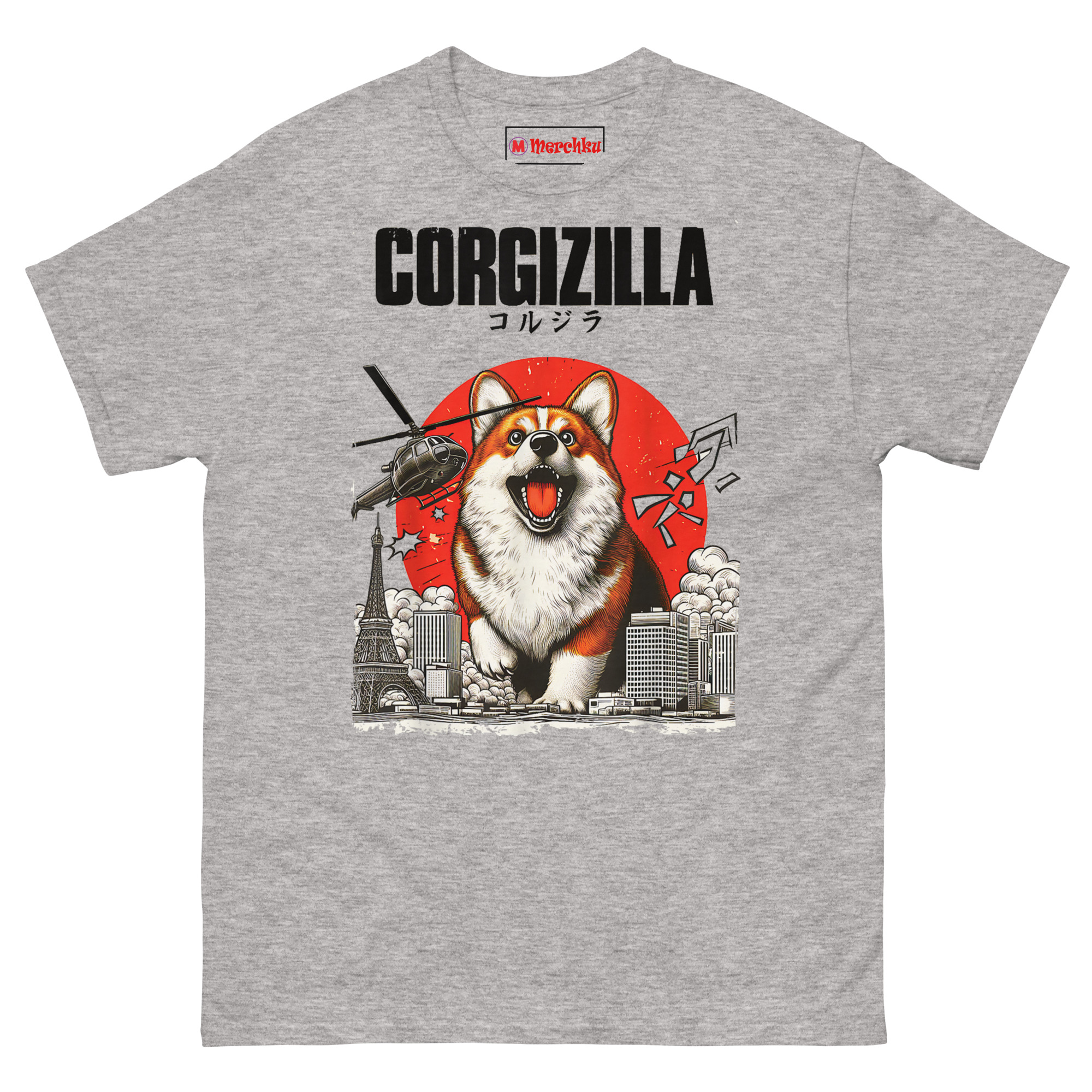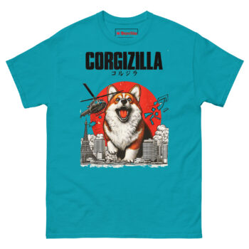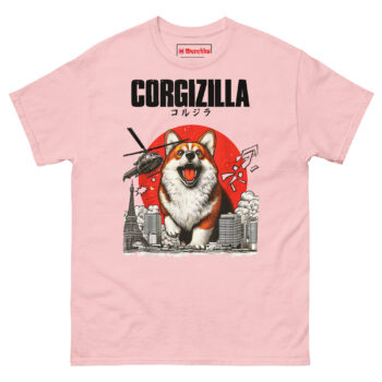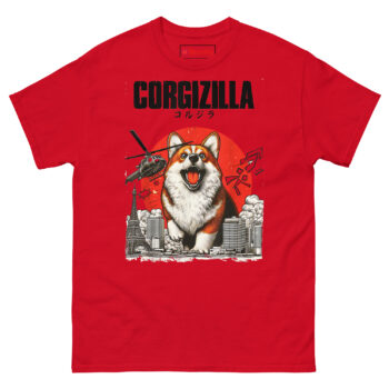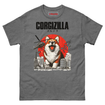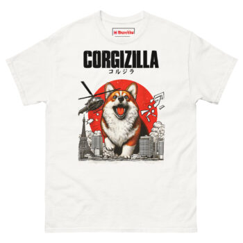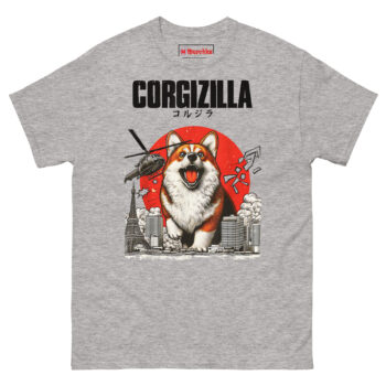 The CorgiZilla T Shirt transforms every Corgi owner’s inside joke into epic monster movie art. This tee features a happy but roaring Welsh Corgi rampaging through a black-and-white Tokyo skyline, complete with military helicopters and a vintage rising sun background. Designed for dog lovers who appreciate pop culture mashups and the undeniable “big dog energy” of small, stubby-legged pups.