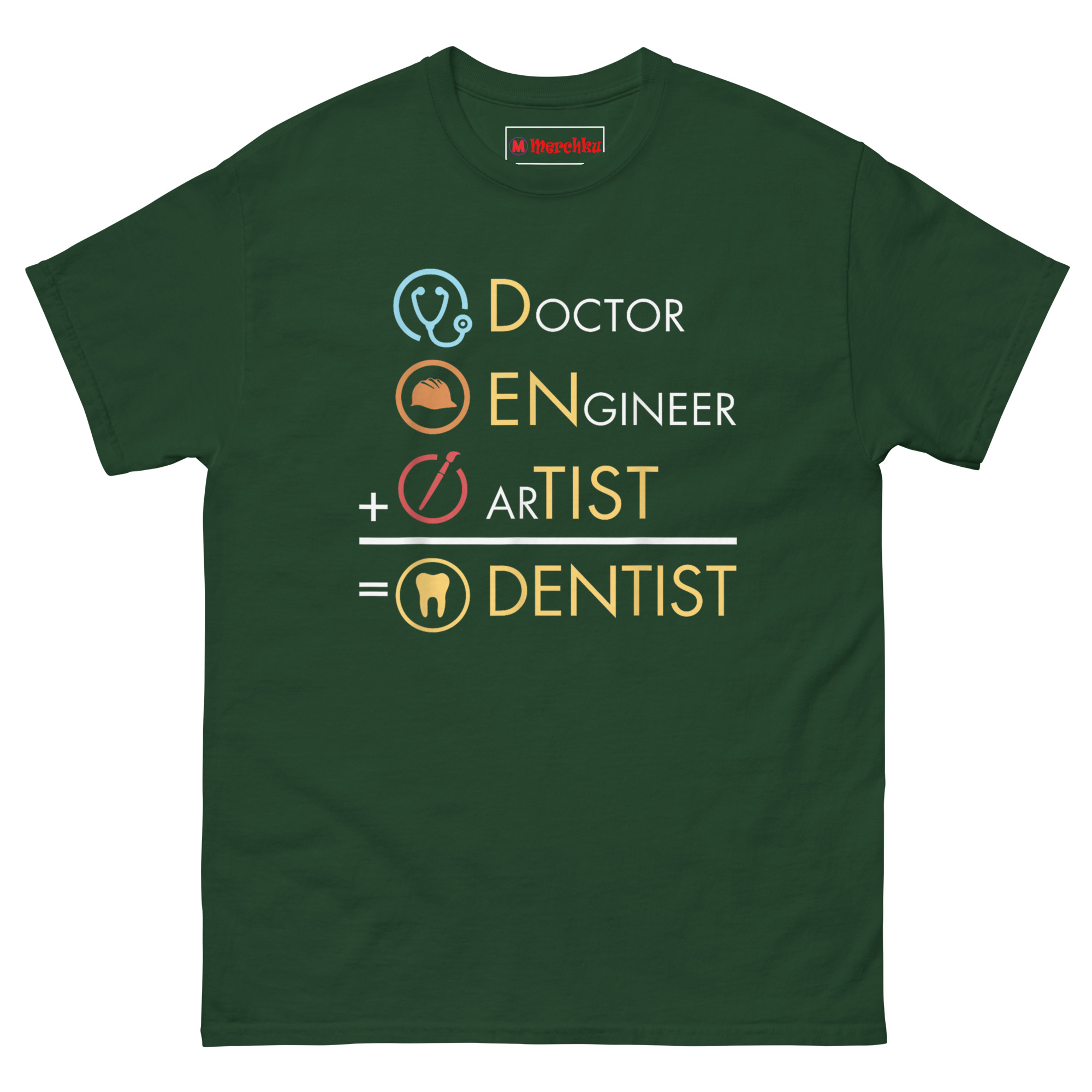 Doctor Engineer Artist Dentist T Shirt design actually started with a patient’s comment. A friend of ours, a periodontist, was shaping a new crown and a patient watched him work, then said, “You know, you’re like a doctor, but you also have to build things and make them look perfect.” That moment of clarity stuck with him, and he shared it with us.