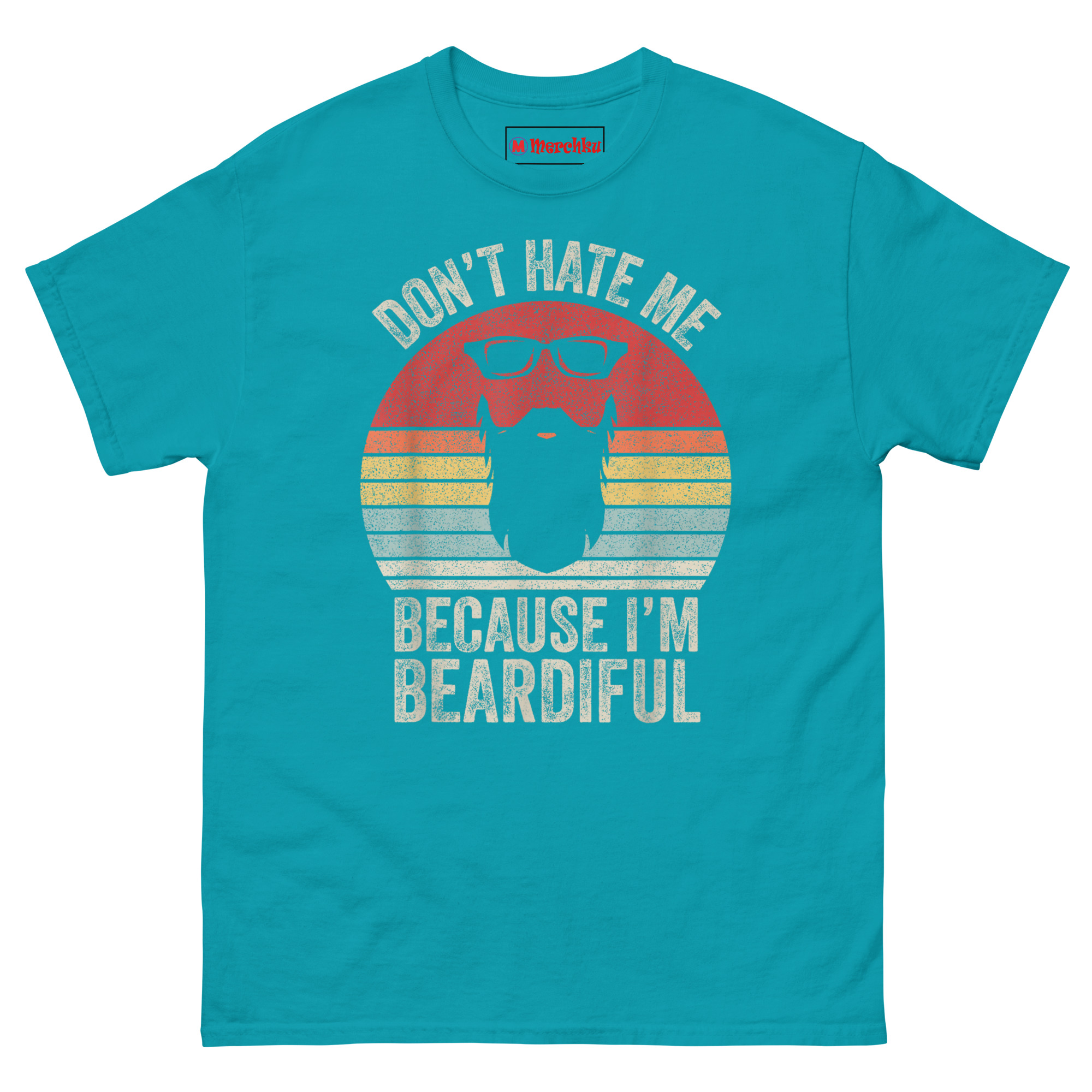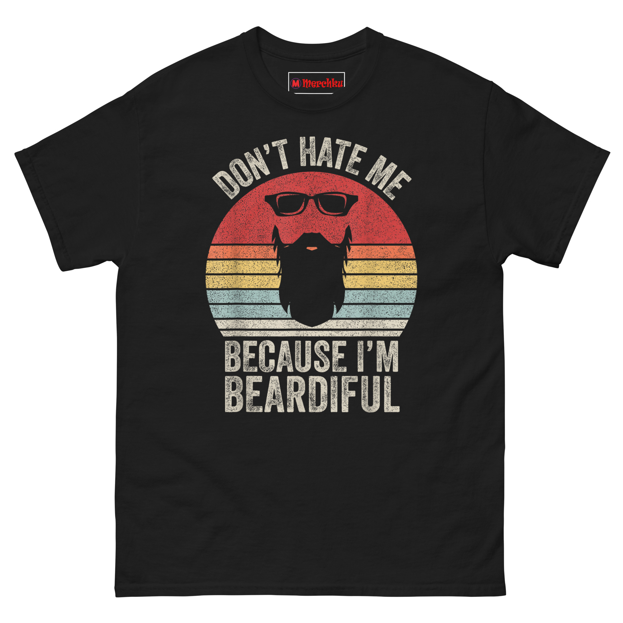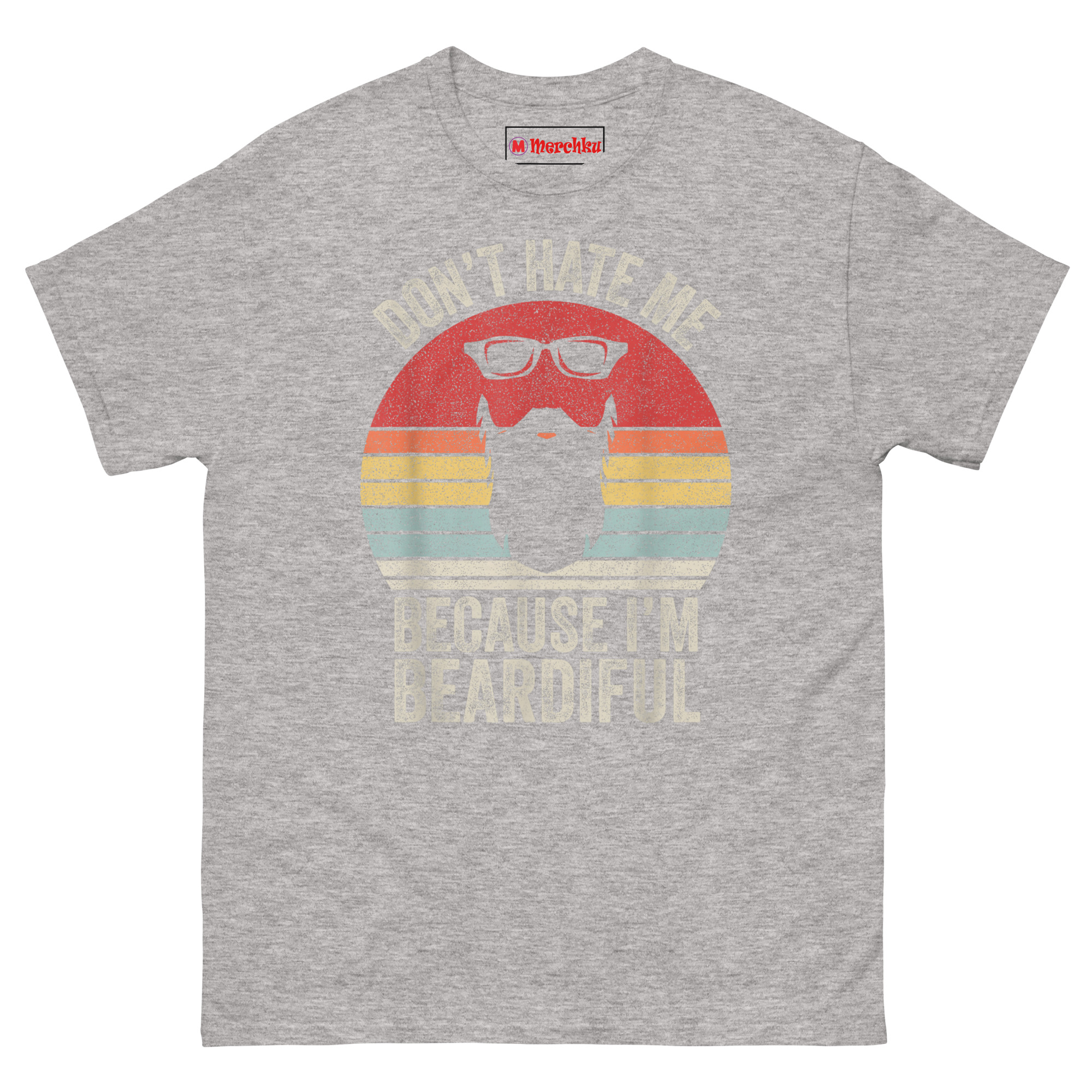 The Don’t Hate Me Because I’m Beardiful T Shirt design borrows from 70s and 80s motorcycle culture and retro diner signs. That sunset badge with horizontal stripes? It’s a classic “Outrun” look. The black wayfarer sunglasses and thick beard silhouette sit right inside the sunset colors. Then we hit it with a heavy distressed texture so the shirt already looks like a lucky vintage find from your dad’s closet.