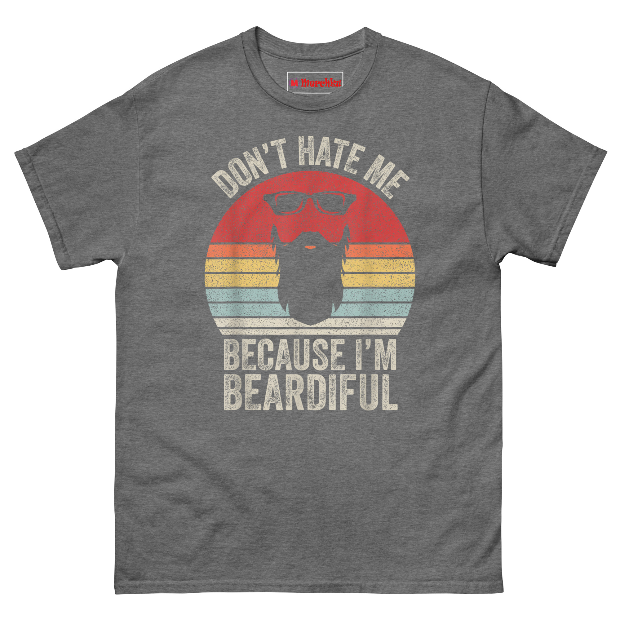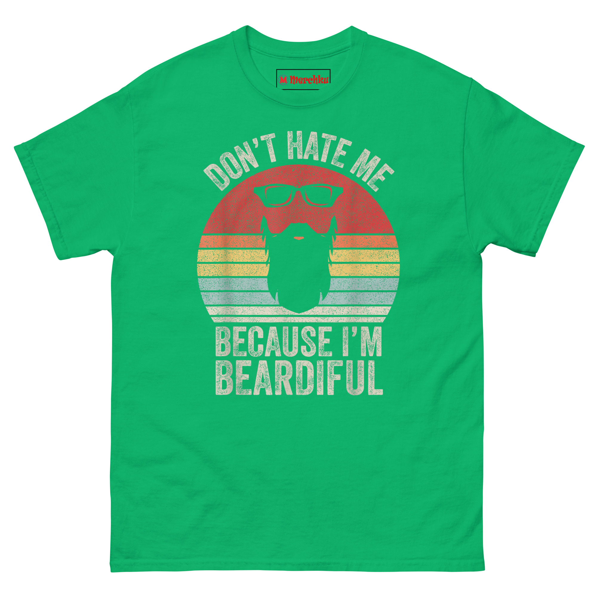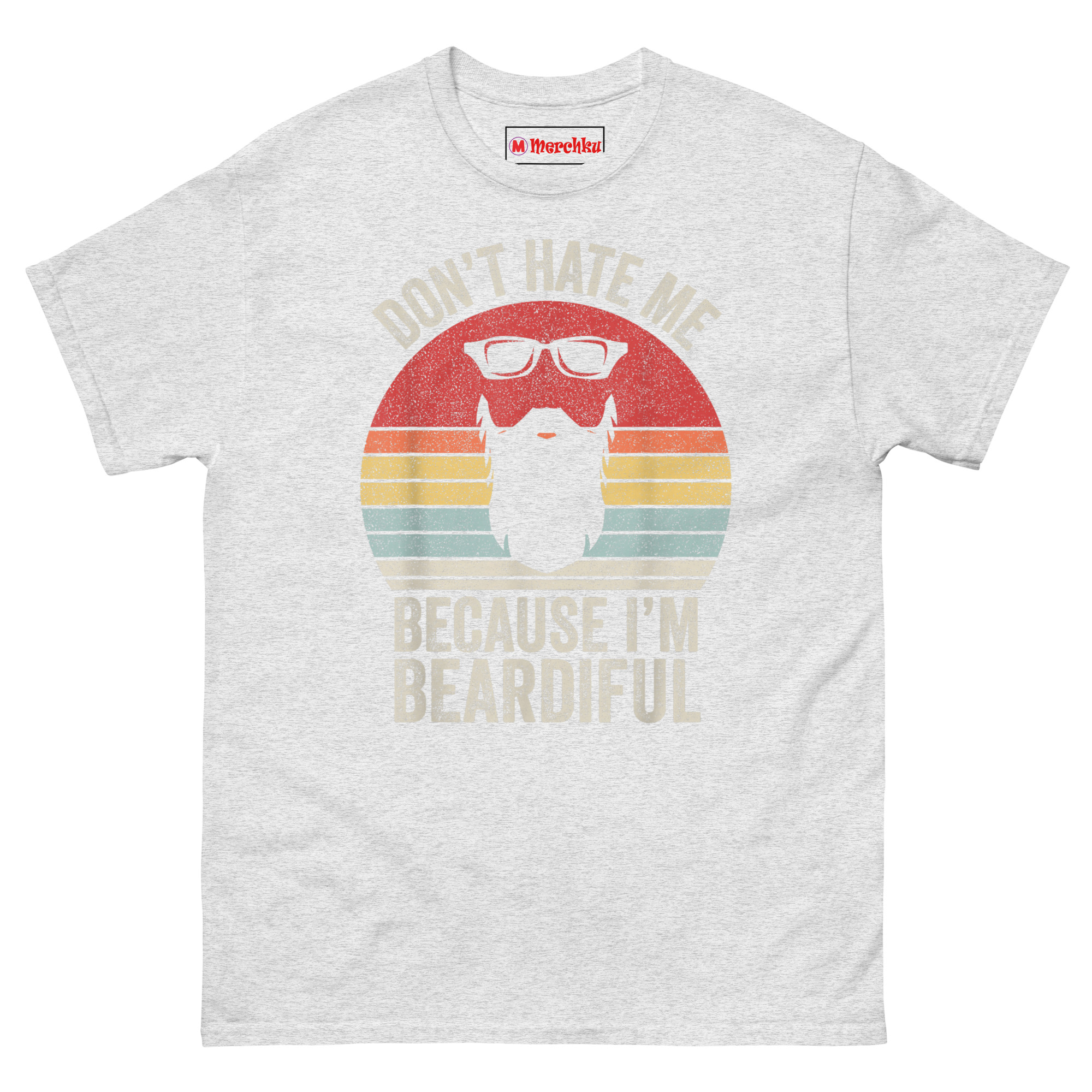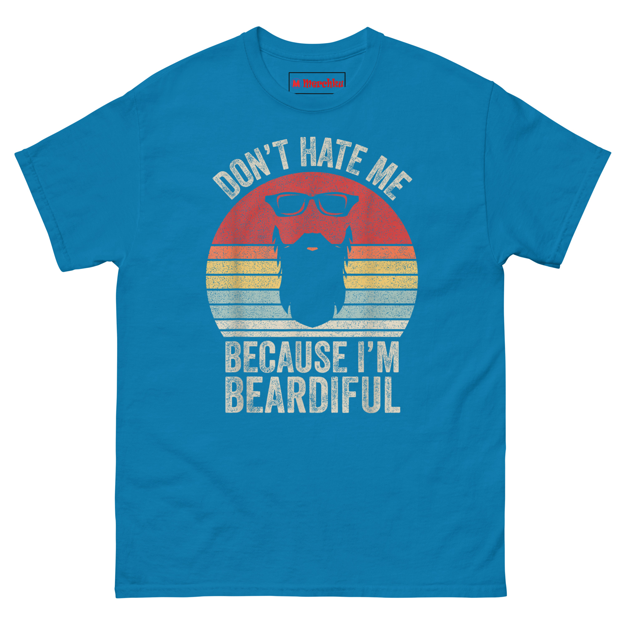The Don’t Hate Me Because I’m Beardiful T Shirt design borrows from 70s and 80s motorcycle culture and retro diner signs. That sunset badge with horizontal stripes? It’s a classic “Outrun” look. The black wayfarer sunglasses and thick beard silhouette sit right inside the sunset colors. Then we hit it with a heavy distressed texture so the shirt already looks like a lucky vintage find from your dad’s closet.