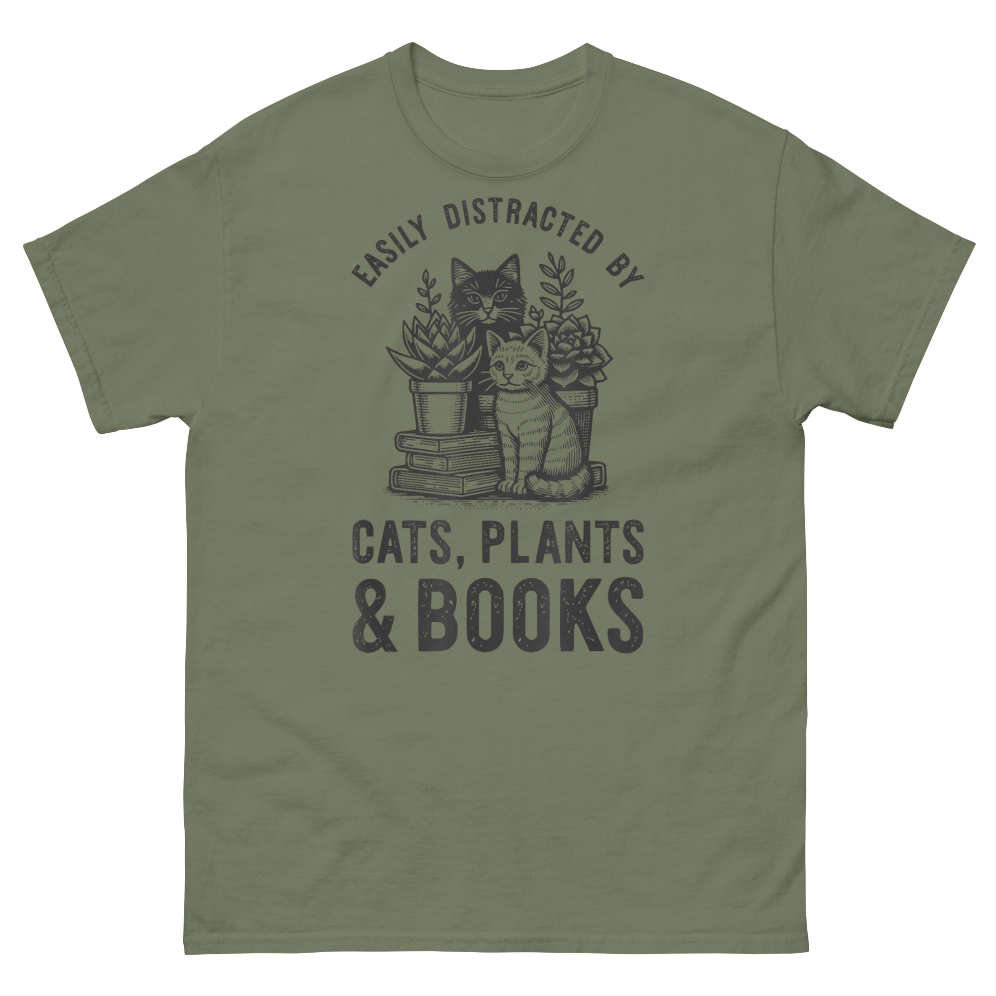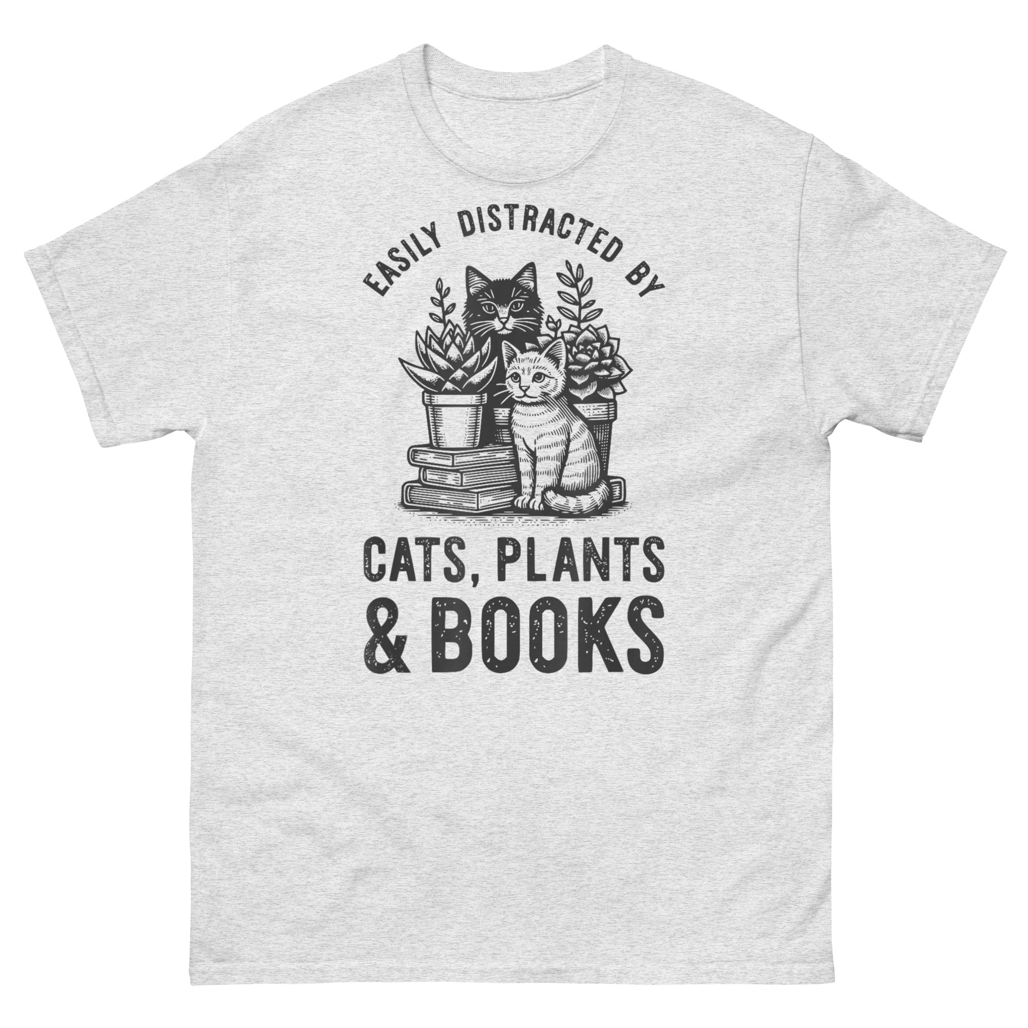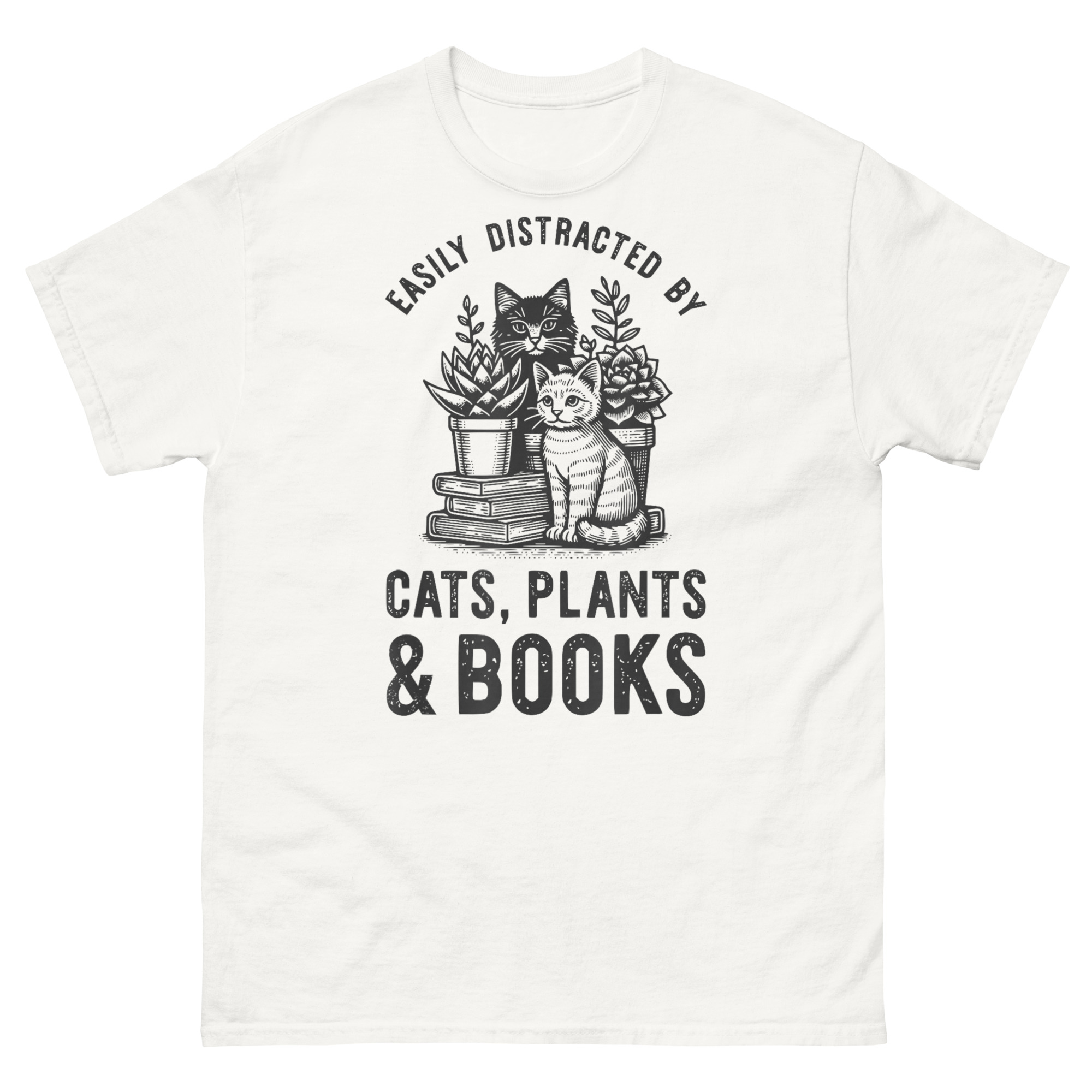 About Easily Distracted By Cats Plants And Books T Shirt Design