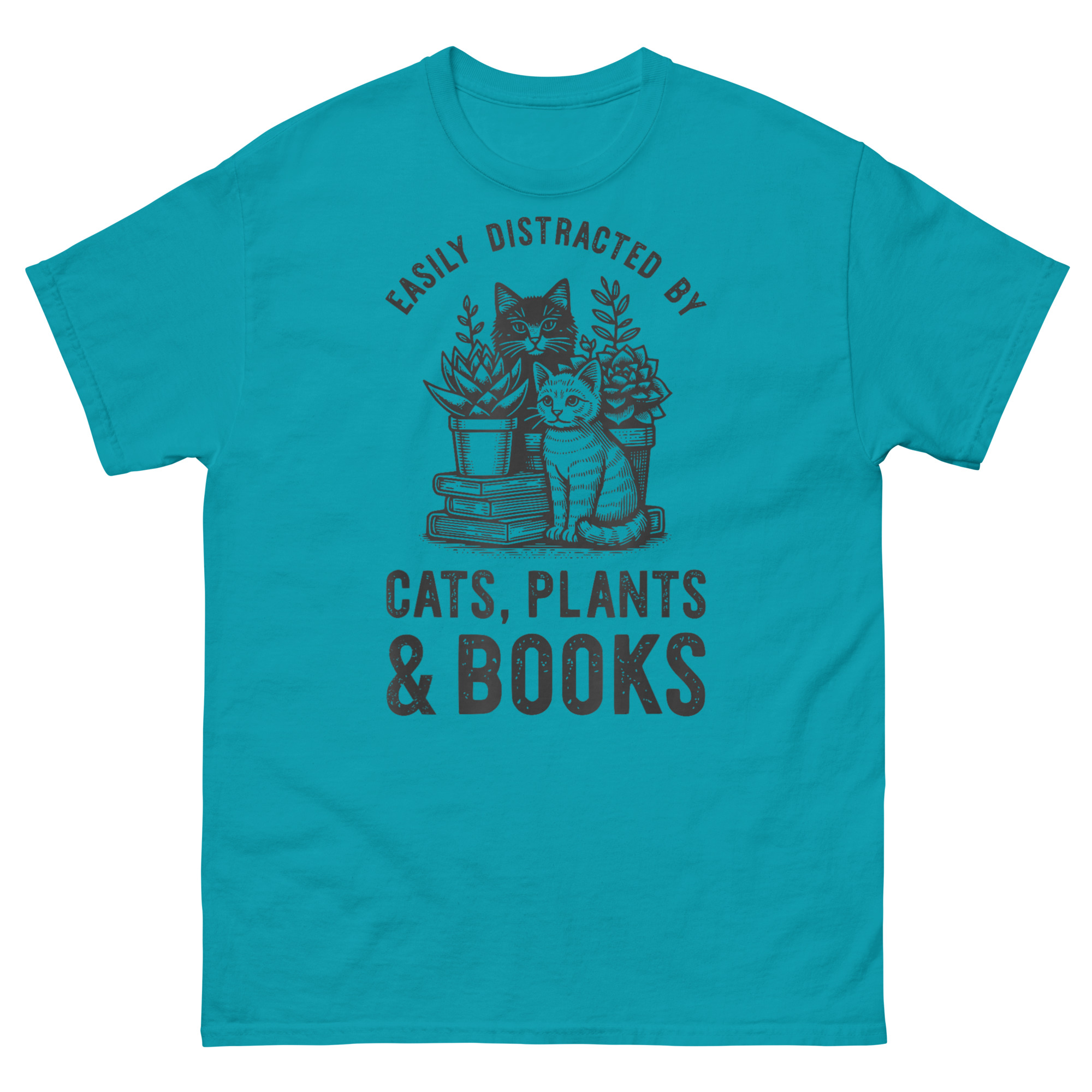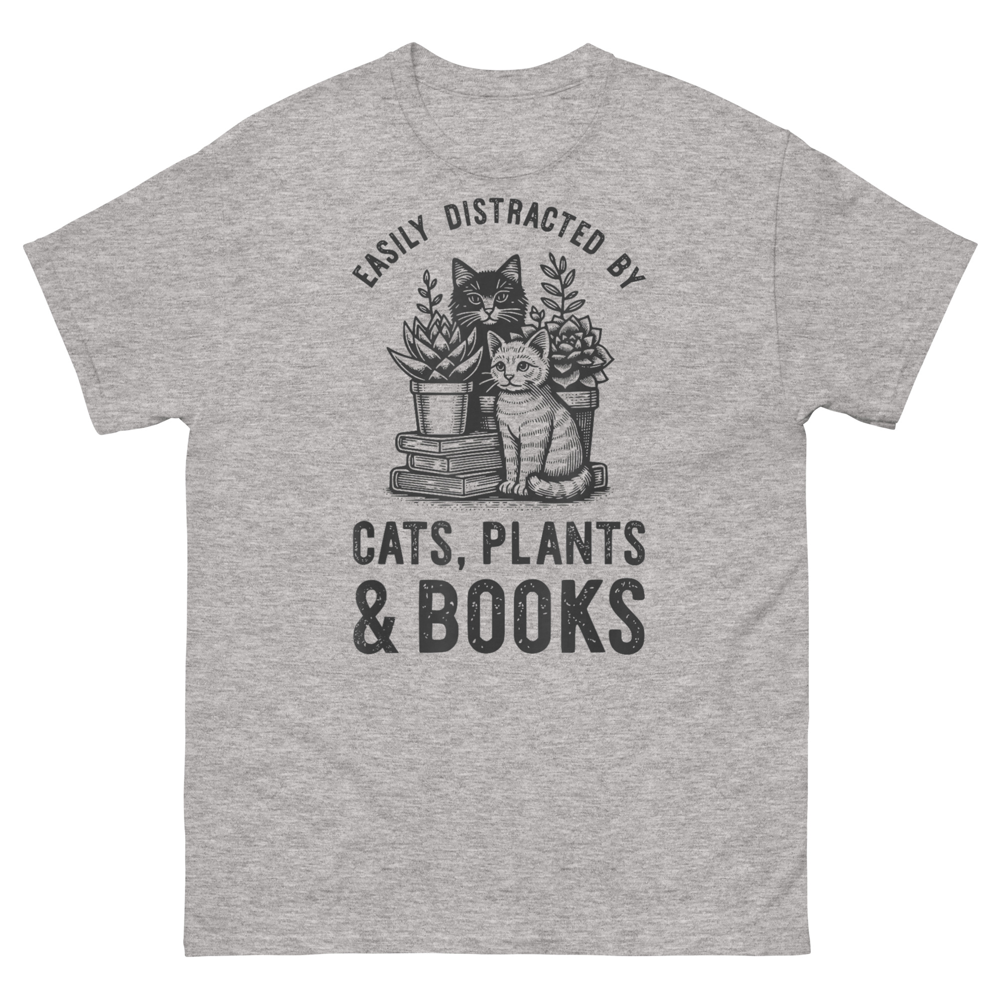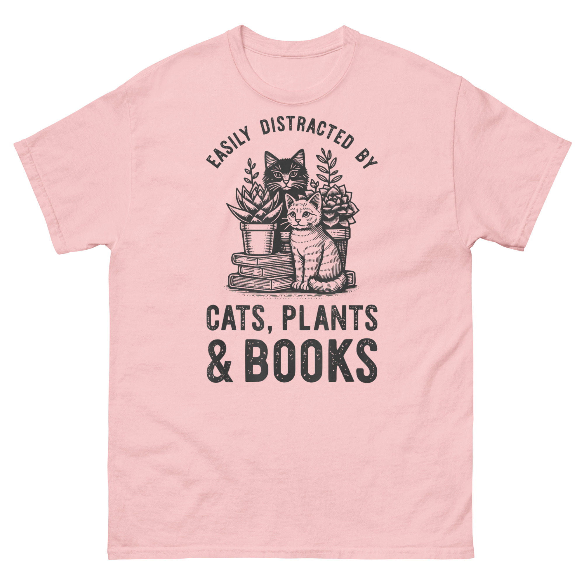 About Easily Distracted By Cats Plants And Books T Shirt Design