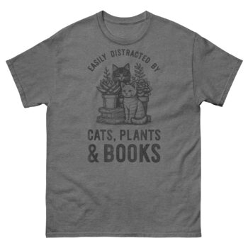 Easily Distracted By Cats Plants And Books T Shirt inspiration hit during a quiet afternoon at a friend’s apartment. She had books stacked on every surface, a collection of happy succulents on the windowsill, and her black cat, Binx, was curled up in a sunbeam right in the middle of it all. It was such a complete picture of contentment. Someone jokingly asked her a question, and she didn’t hear a thing, she was totally absorbed in that moment. We realized that’s exactly what peace looks like.