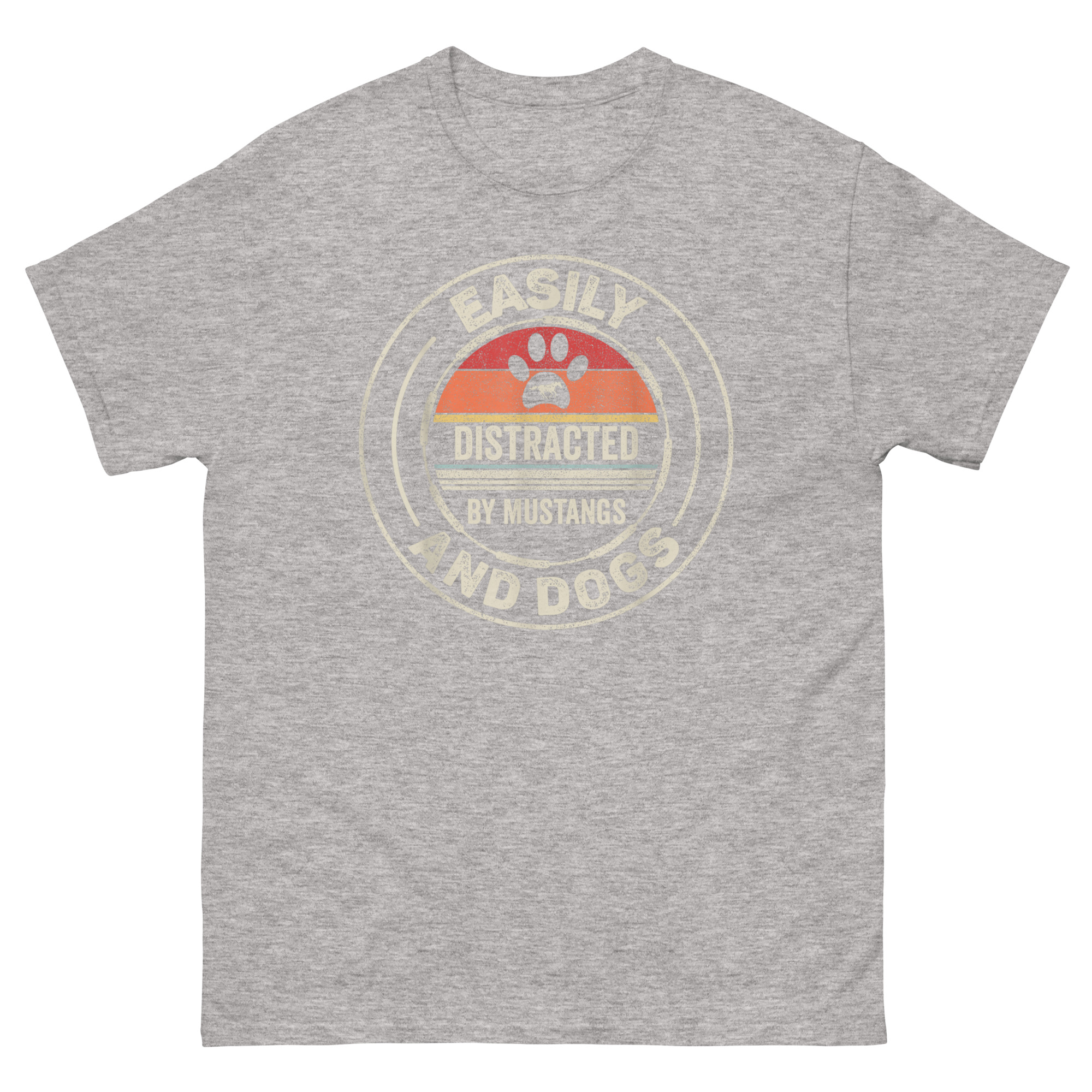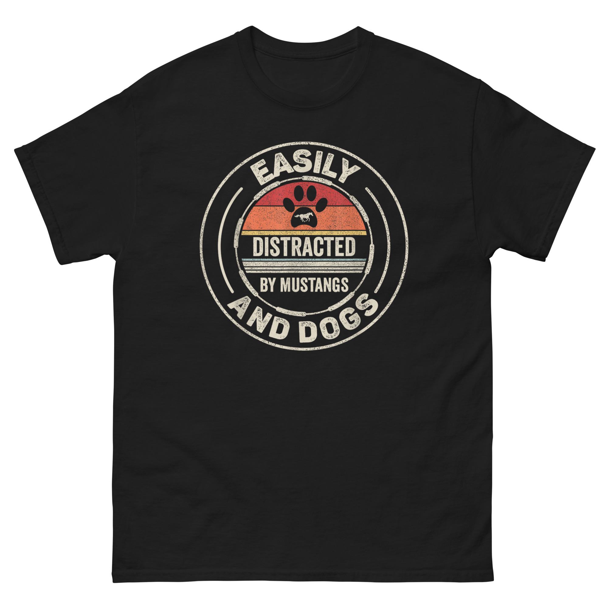 Here’s a shirt for anyone whose heart races twice: once for the roar of a V8 and again for the wag of a tail. The Easily Distracted by Mustangs and Dogs T Shirt combines vintage car culture with loyal canine companionship into one bold, retro-styled graphic. It’s built for Ford enthusiasts, dog dads, vet techs, and anyone who believes a weekend cruise is incomplete without a furry copilot.