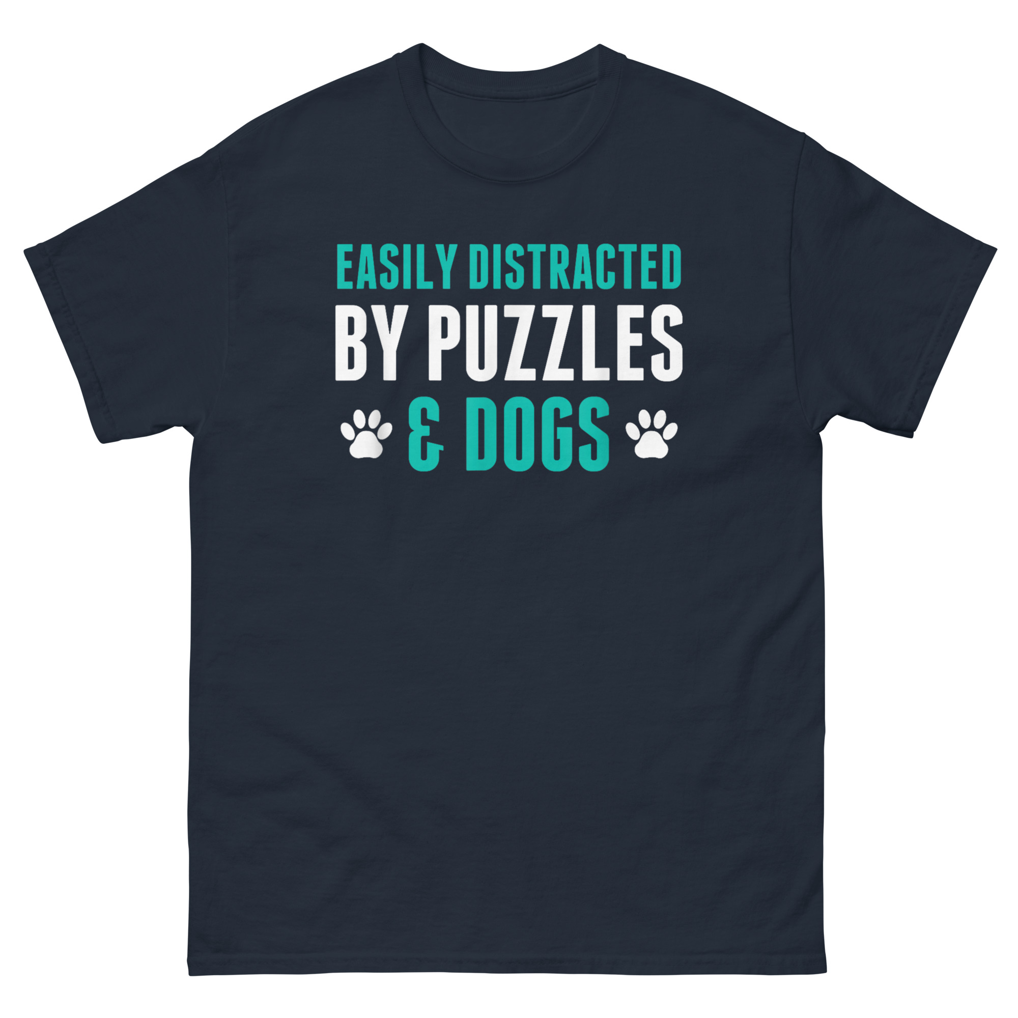 The Easily Distracted By Puzzles and Dogs T Shirt idea sparked on a rainy Sunday afternoon. A friend had just finished a 1,000-piece puzzle of a starry night sky. Spread out across her dining table, it was a masterpiece of patience. And right in the middle, snoozing peacefully on a pile of unsorted pieces, was her golden retriever. She laughed and said, “He’s not helping, but I wouldn’t have it any other way.” That moment of quiet contentment was exactly what we wanted to capture.