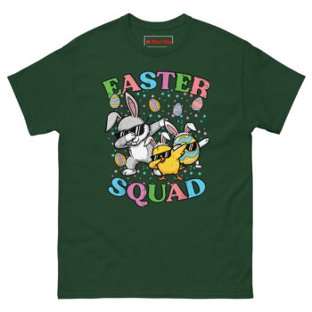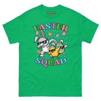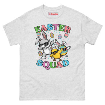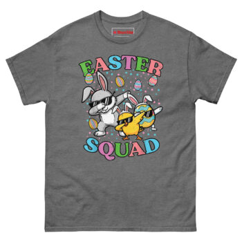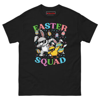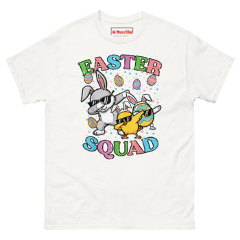 We designed Easter Squad Bunny T Shirt to capture that energy. The grey bunny, yellow chick, and egg character are all rocking stylish black sunglasses and striking the dab pose, a move that symbolizes youthful confidence and victory. The colorful bubble letters spelling “EASTER” and “SQUAD” pop against a backdrop of pastel confetti dots and floating decorated eggs, creating a festive party atmosphere. It bridges the gap between generations, making the holiday feel inclusive and exciting for everyone from toddlers to teens. It is a shirt that says, “We are in this together, and we are having fun.”