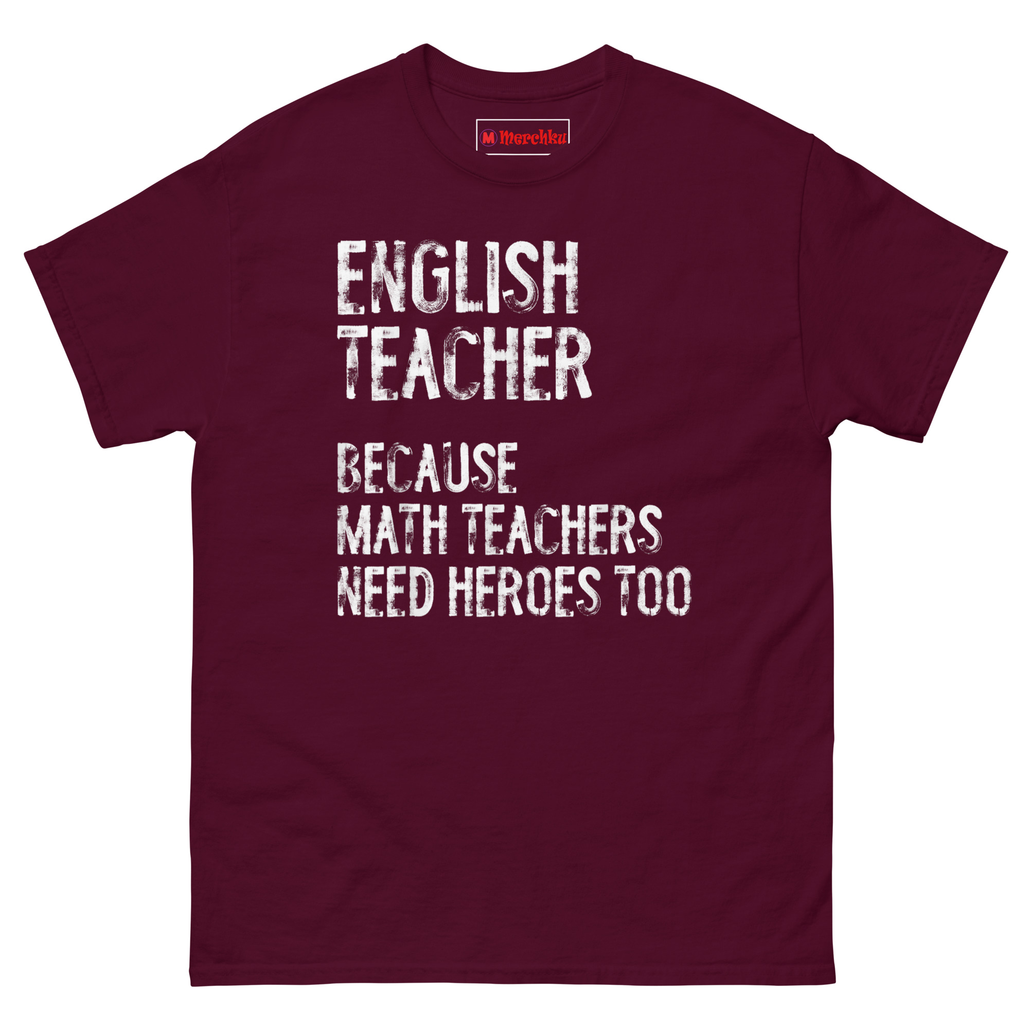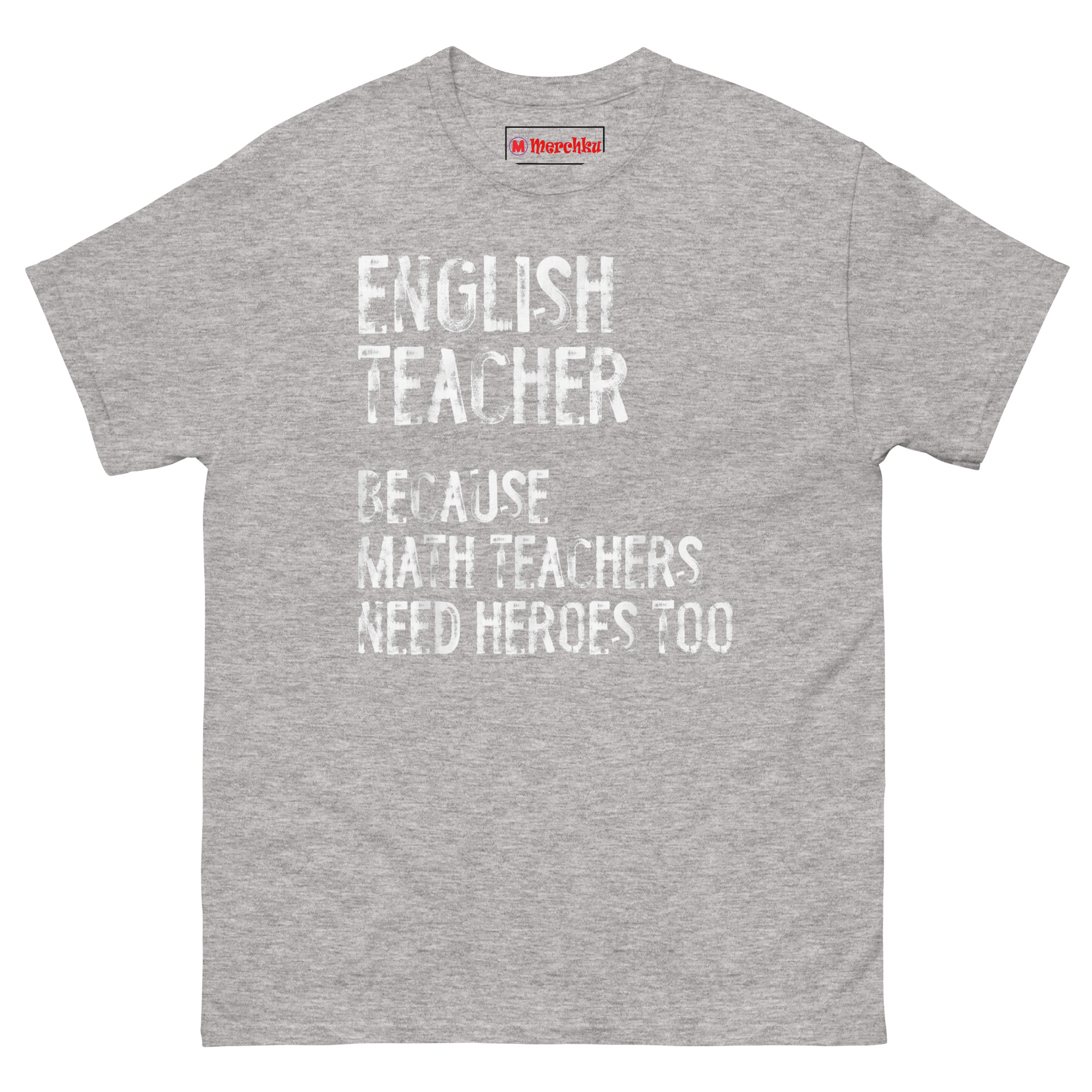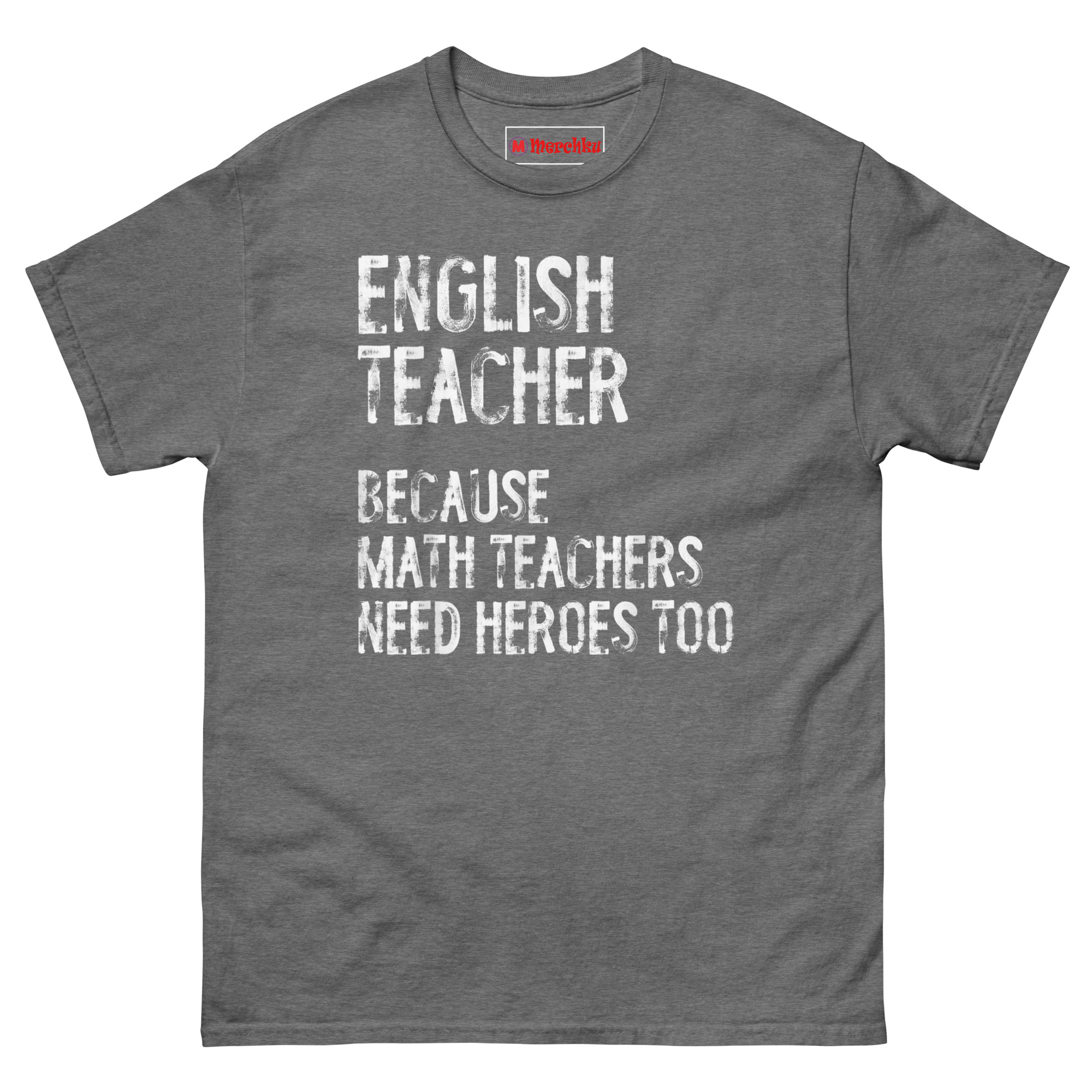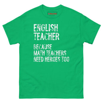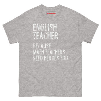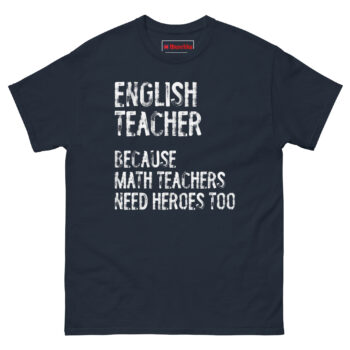 This shirt gives English teachers the recognition they deserve with a playful jab at the math department. The English Teacher Because Math Teachers Need Heroes Too T Shirt features bold, distressed typography that declares the humanities educator as the unsung hero of the school. It is designed for English teachers, language arts instructors, literacy specialists, and anyone who takes pride in shaping young minds with words.