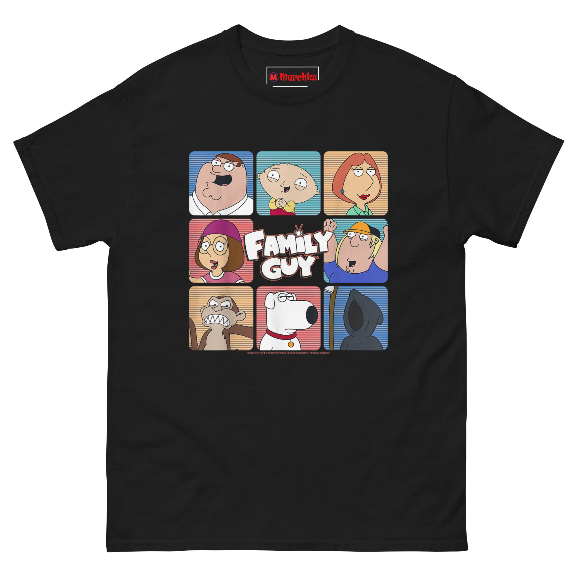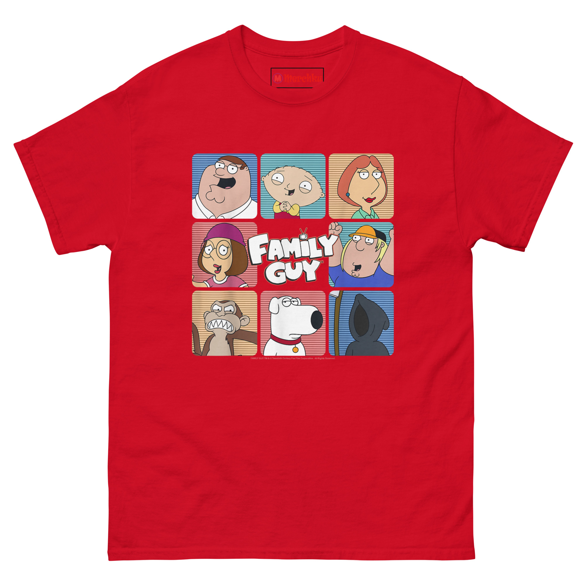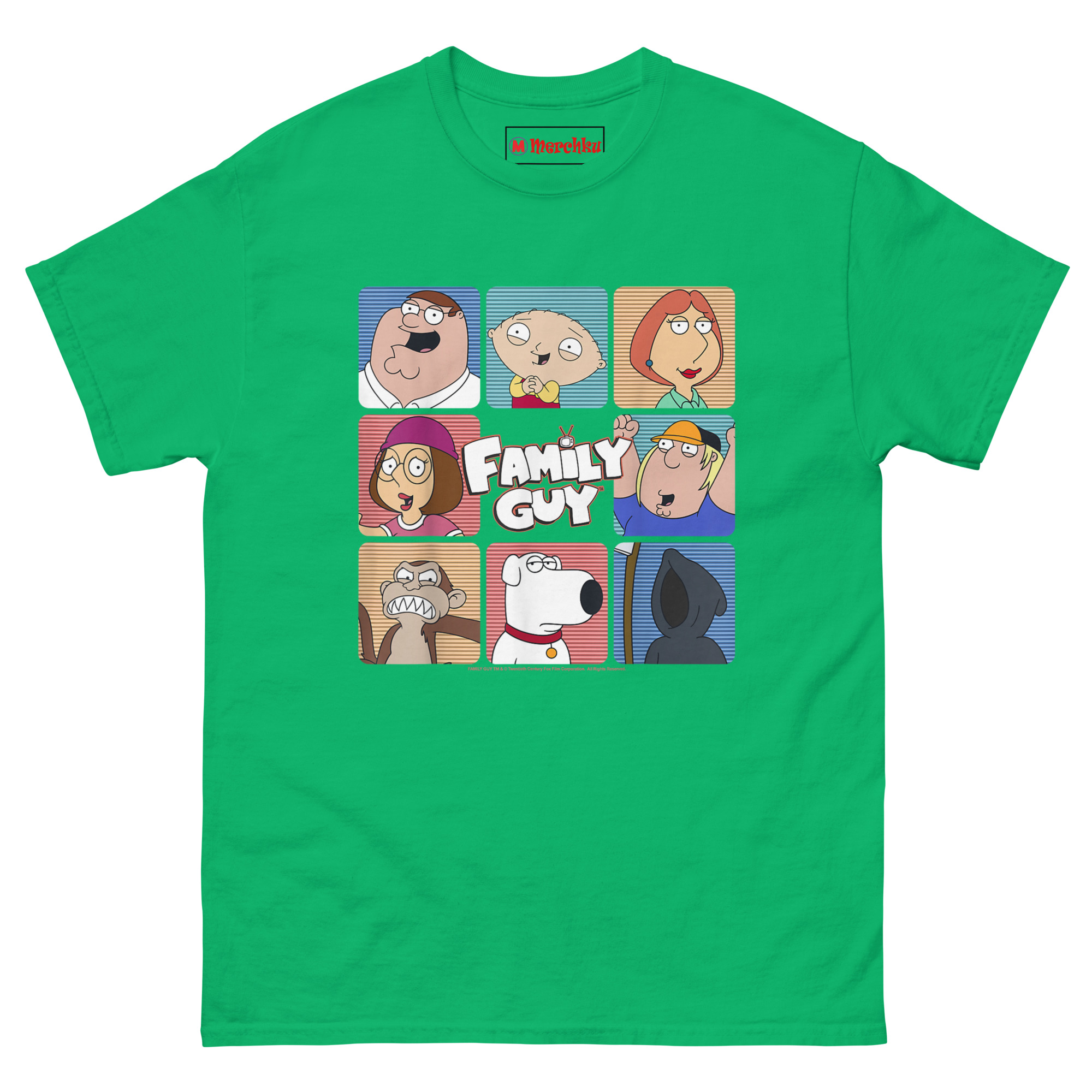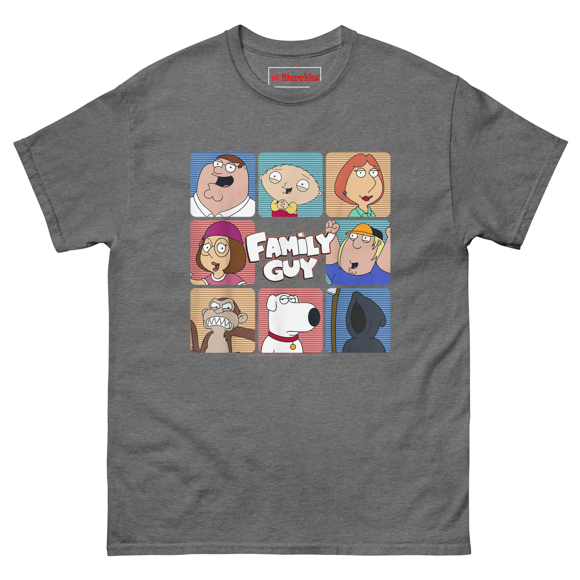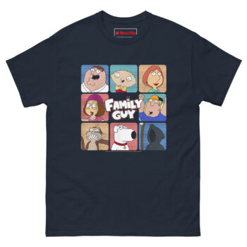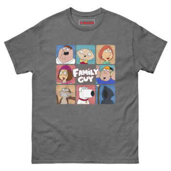 The Family Guy T Shirt is a nostalgic, all-character graphic tee that brings together the iconic residents of Quahog in one bold design. What makes it unique is the vibrant 3×3 “Brady Bunch” style grid featuring Peter, Stewie, Lois, Meg, Chris, Brian, the Evil Monkey, and Death, with the logo centered like a family crest. It is one of the nicest family gifts for anyone who grew up laughing at adult animation, making it perfect for dads, brothers, and friends who know every episode by heart.