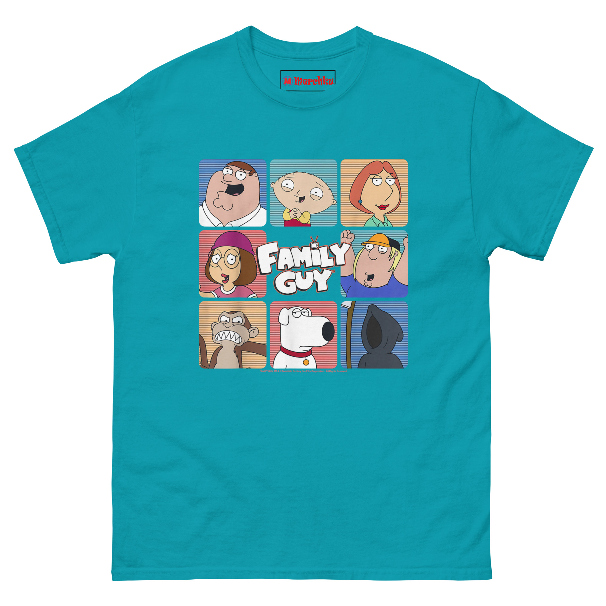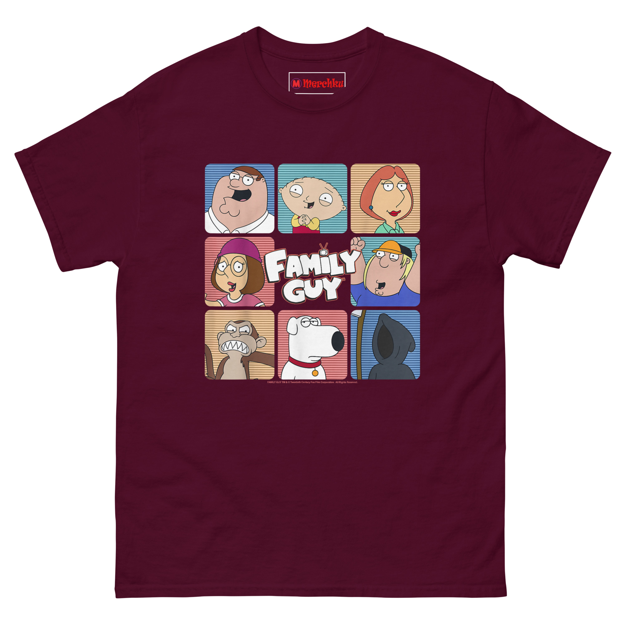 We designed this shirt to capture that complete universe. The 3×3 grid layout mirrors the classic Brady Bunch aesthetic but replaces wholesome family moments with Quahog’s beautifully dysfunctional cast. Each character sits in a square with a unique, colorful background and horizontal speed lines for a retro comic feel. Placing the official Family Guy logo in the center acts as the anchor, a reminder that this chaotic family is at the heart of it all. Including the Evil Monkey, Death, and Brian gives true fans the insider credibility they appreciate.