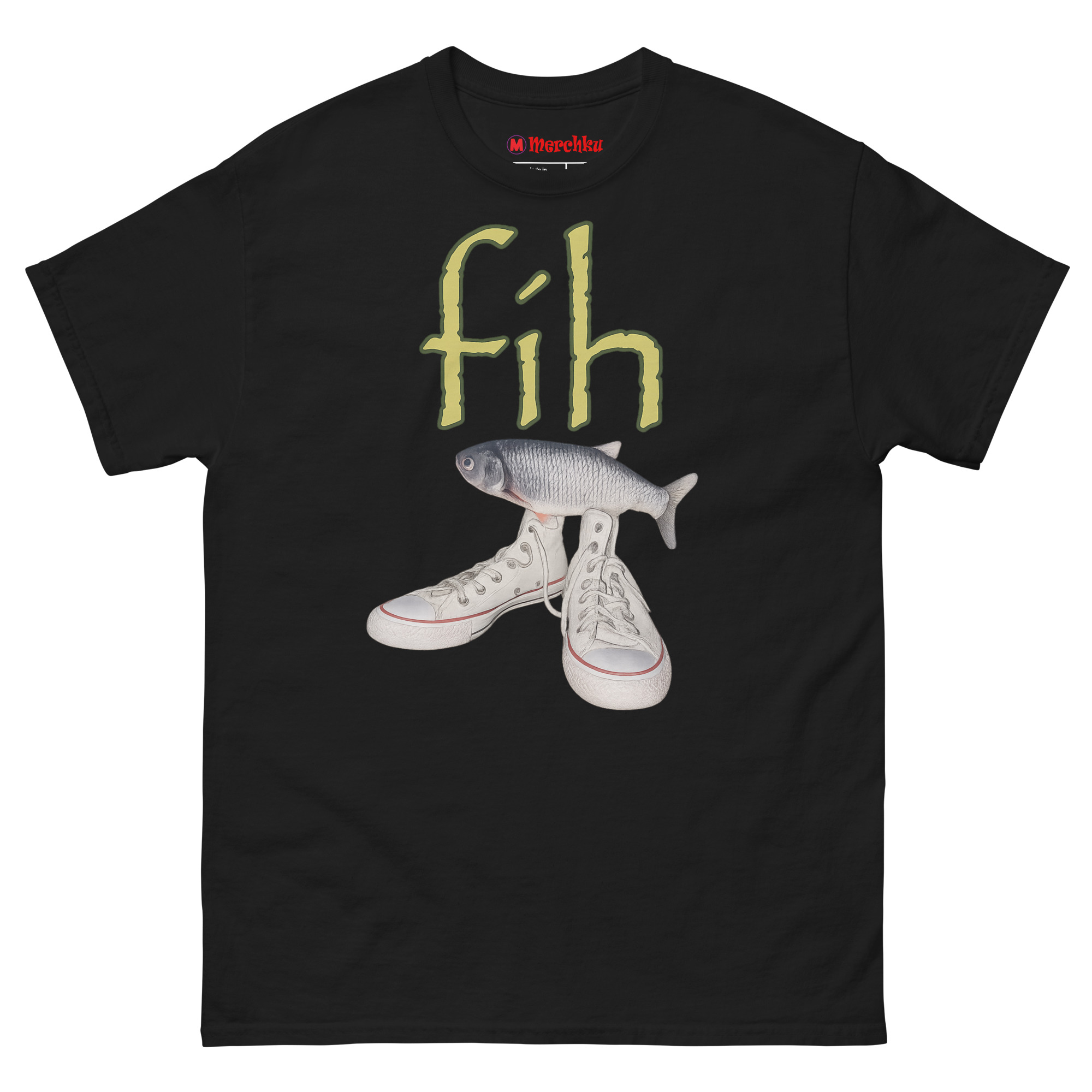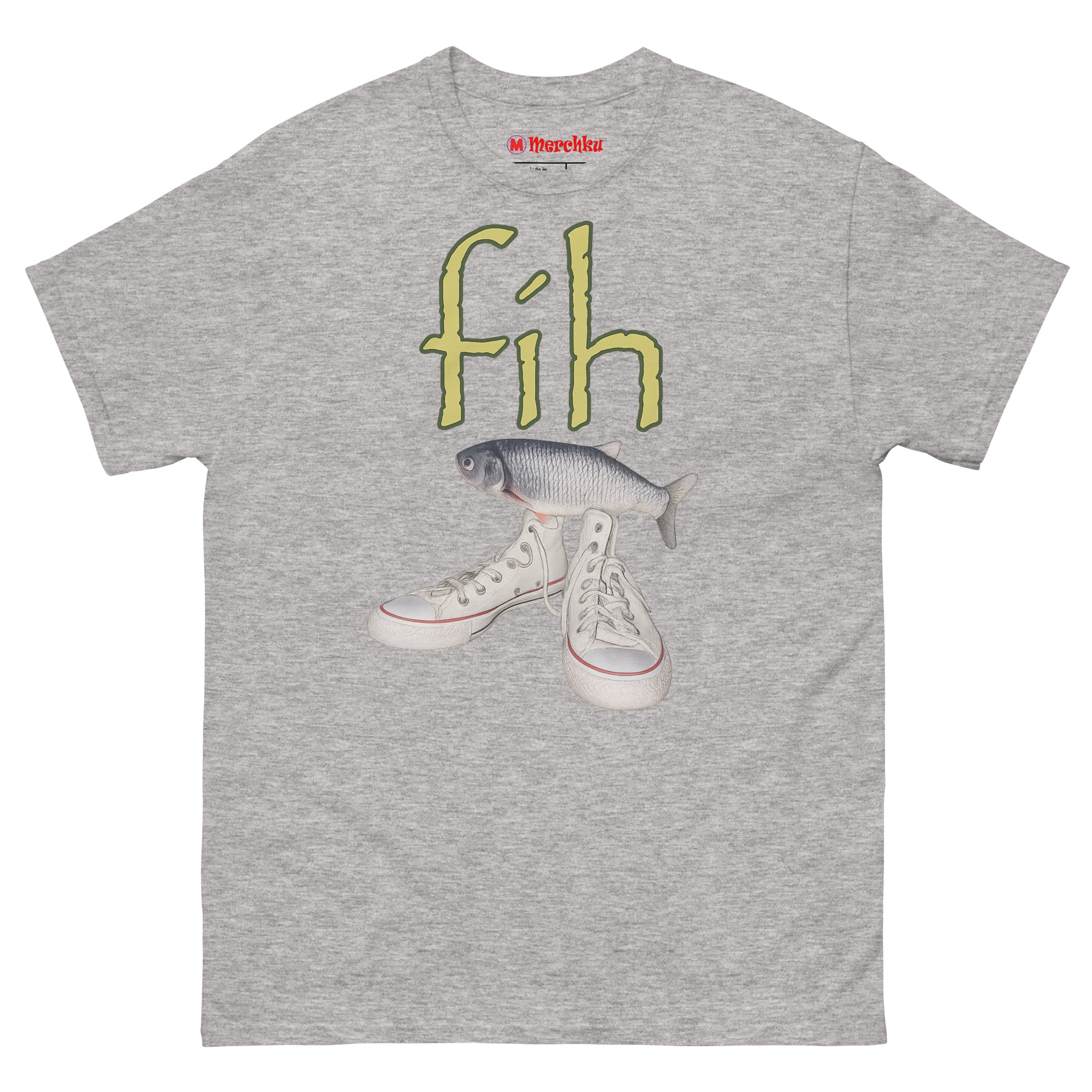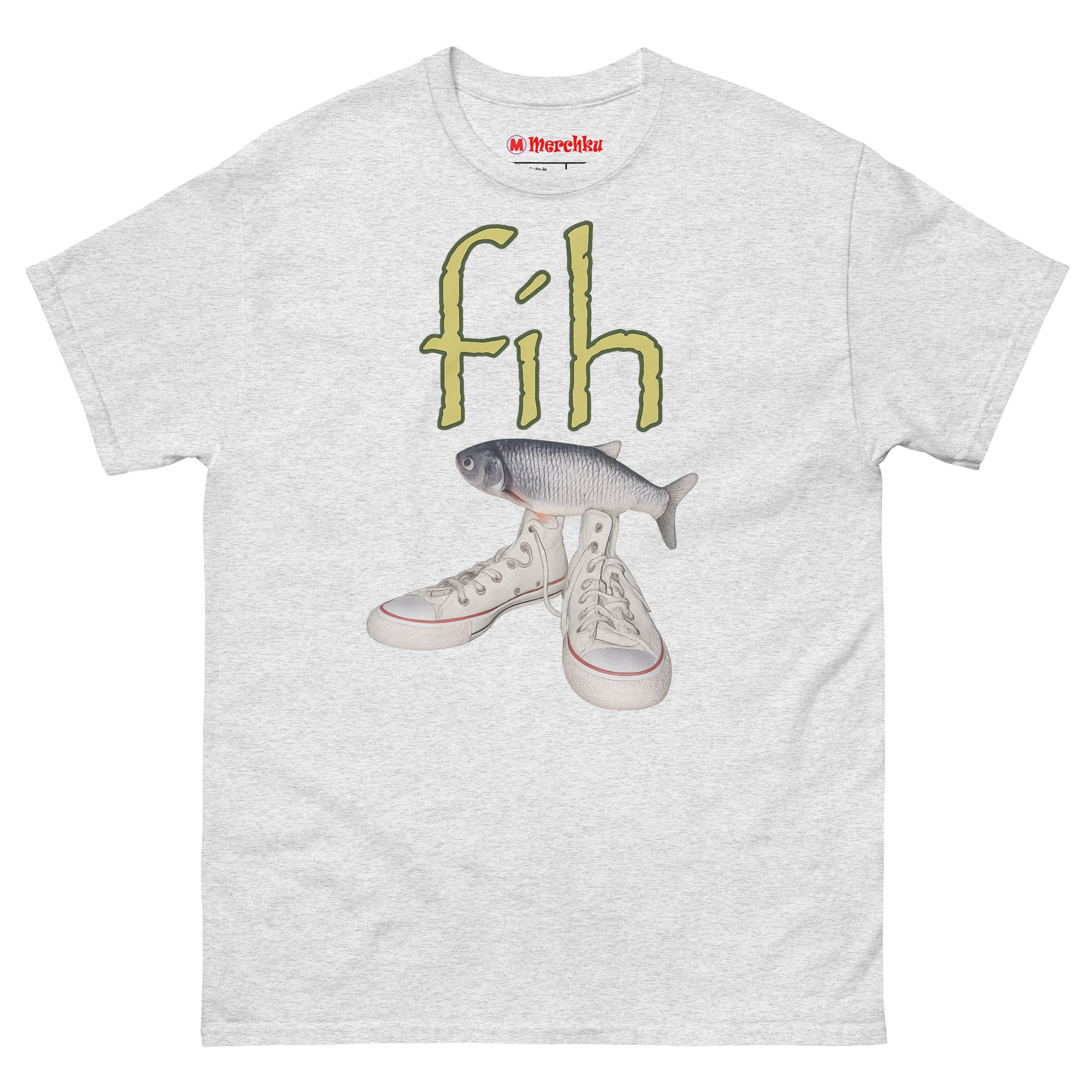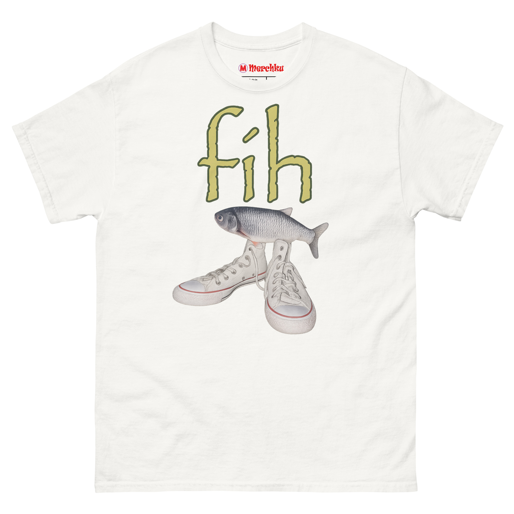 Ironic Fishing Meme T Shirt featuring a realistic fish on top of white high-top canvas sneakers with green fih text on a premium cotton tee.