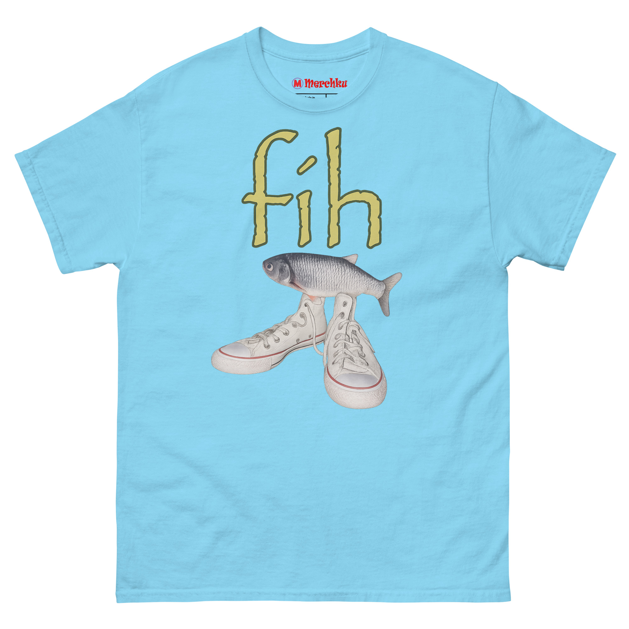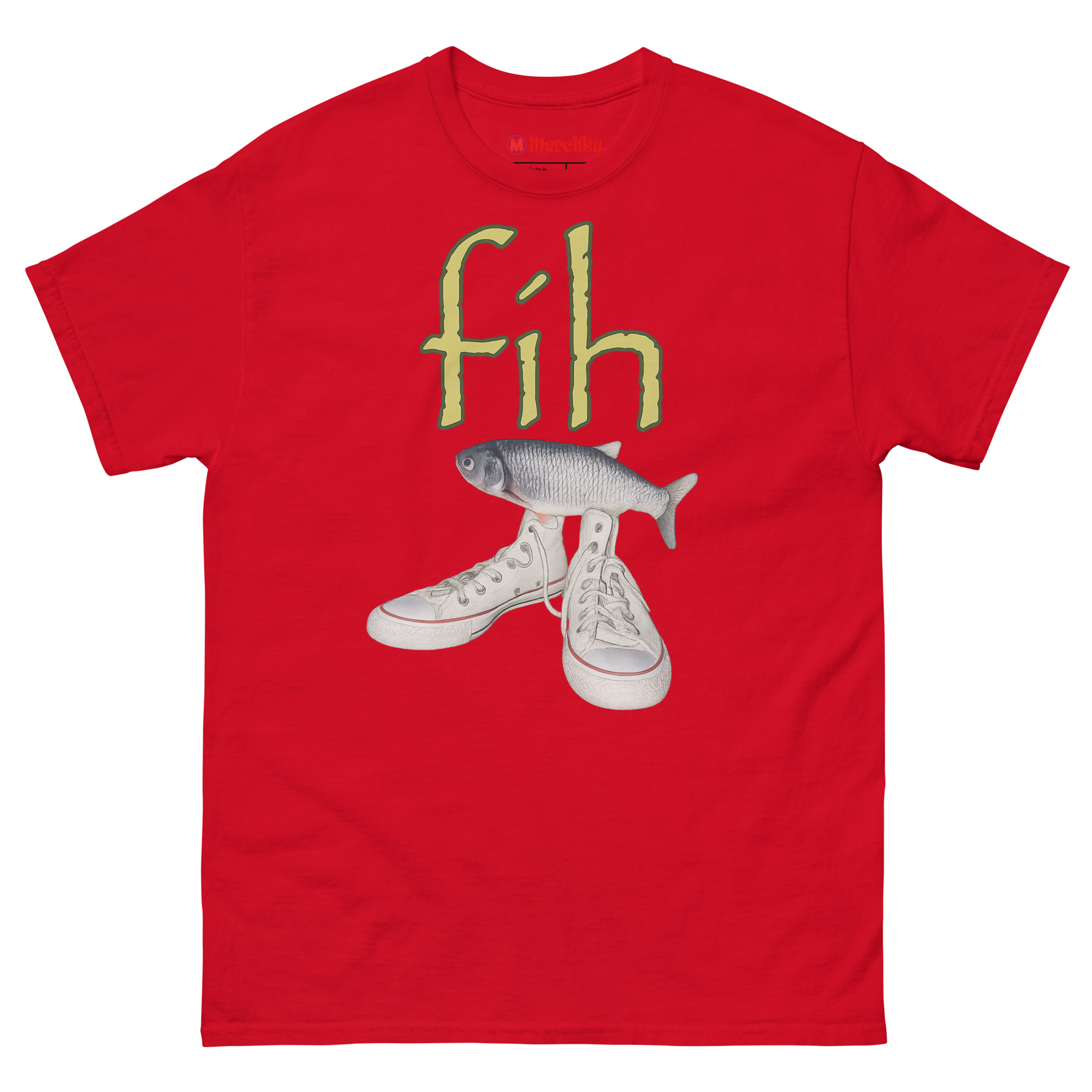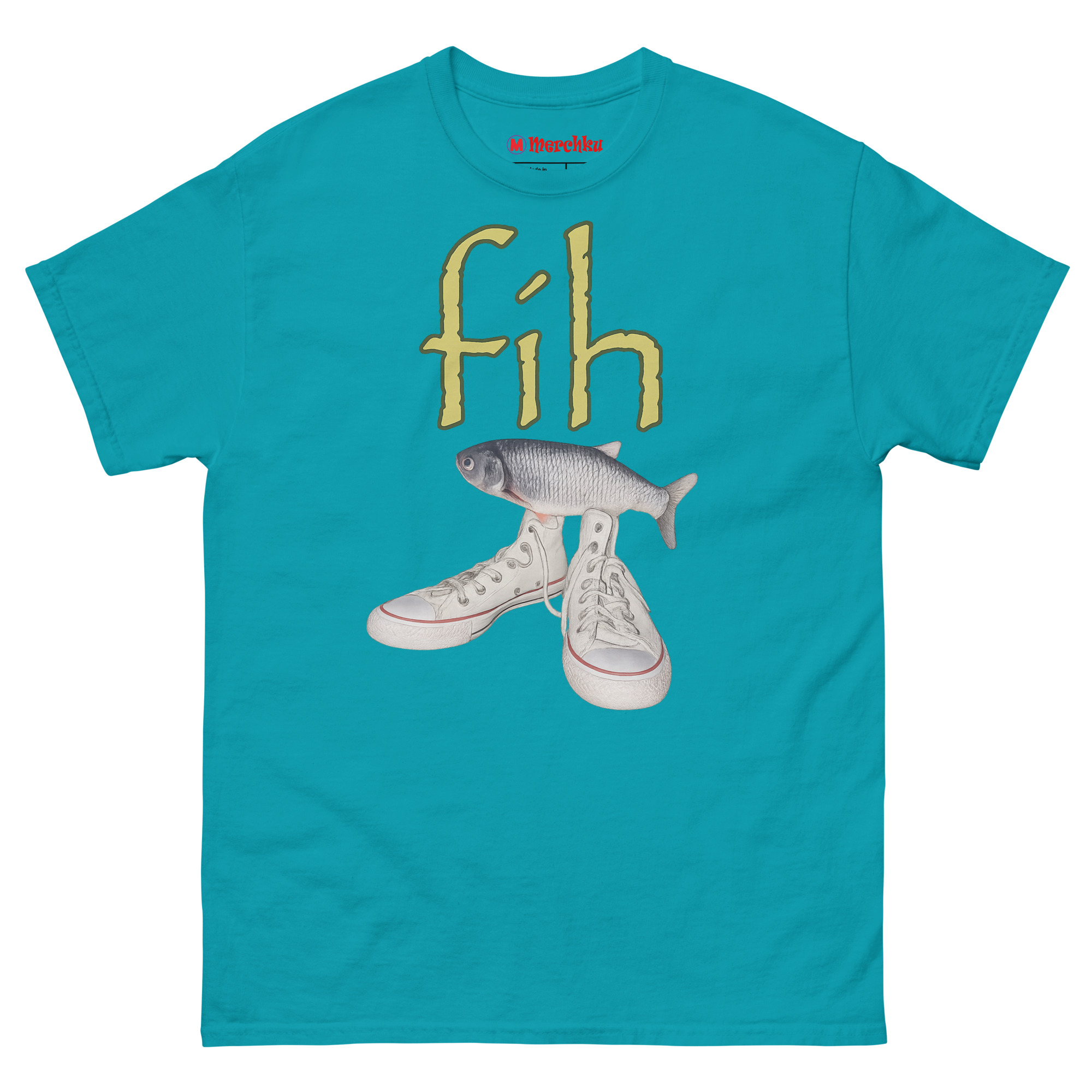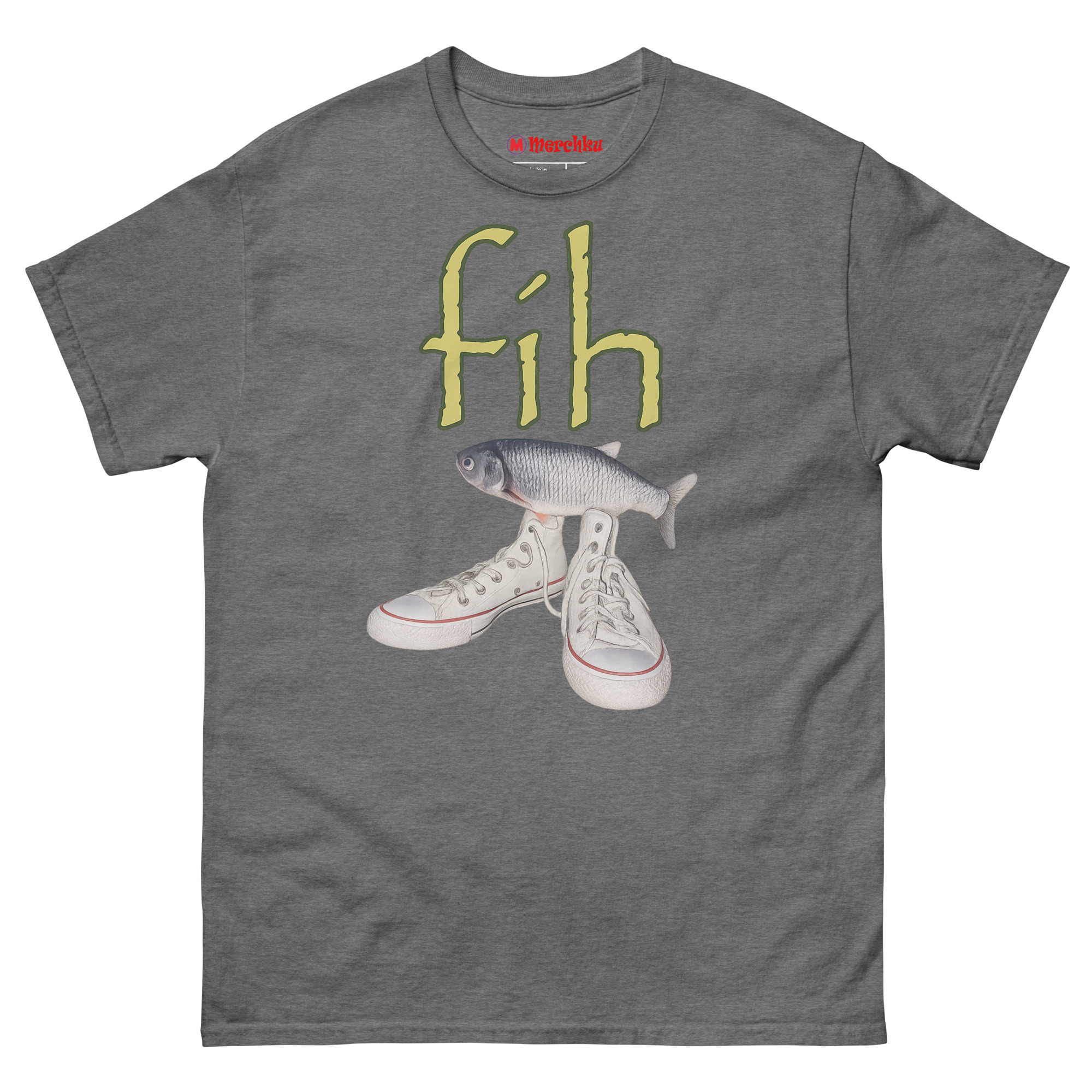 Ironic Fishing Meme T Shirt featuring a realistic fish on top of white high-top canvas sneakers with green fih text on a premium cotton tee.