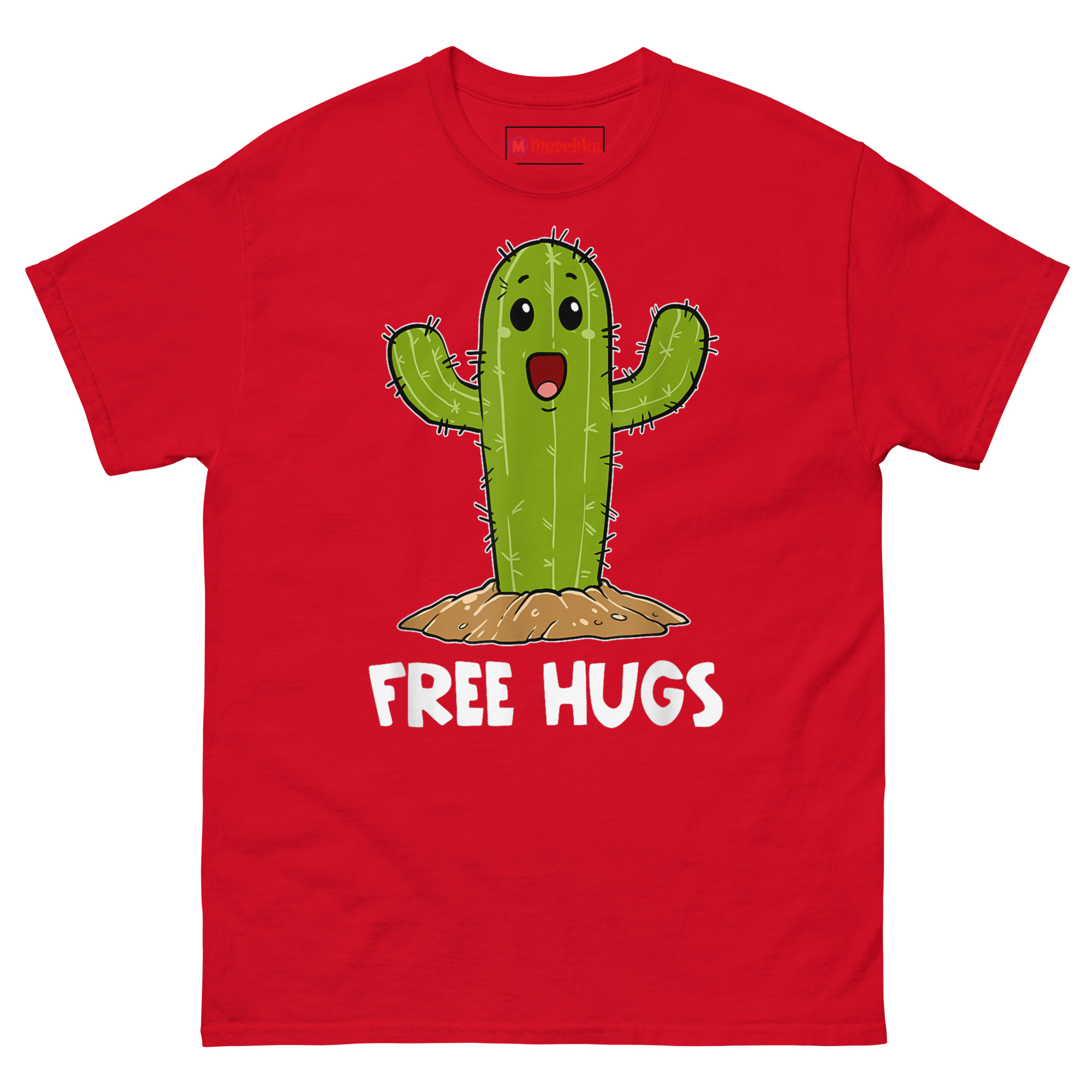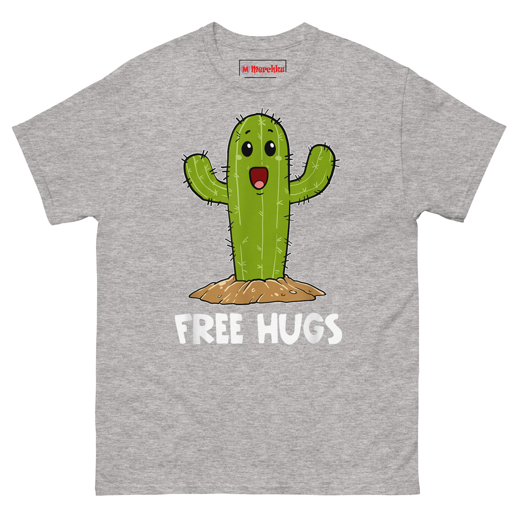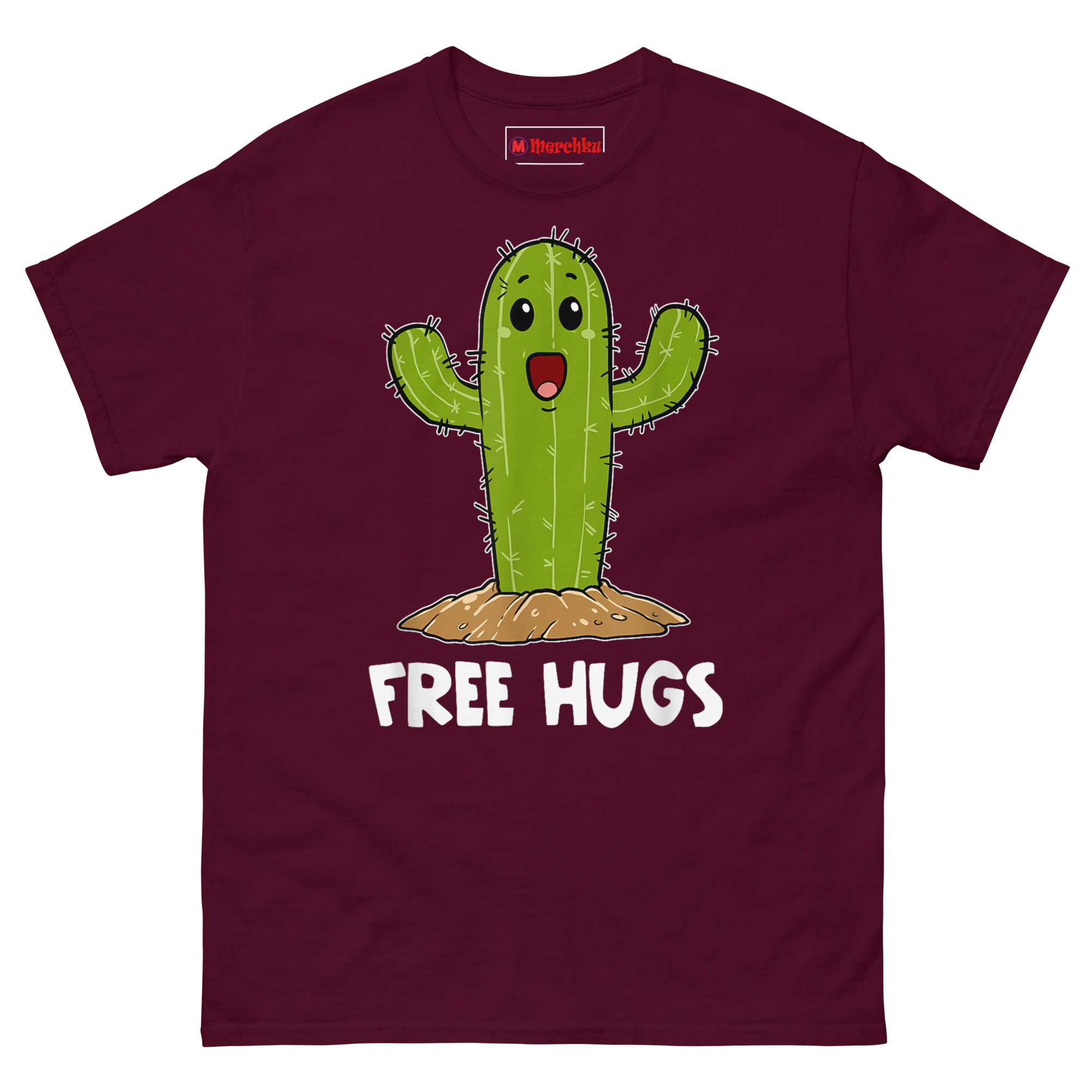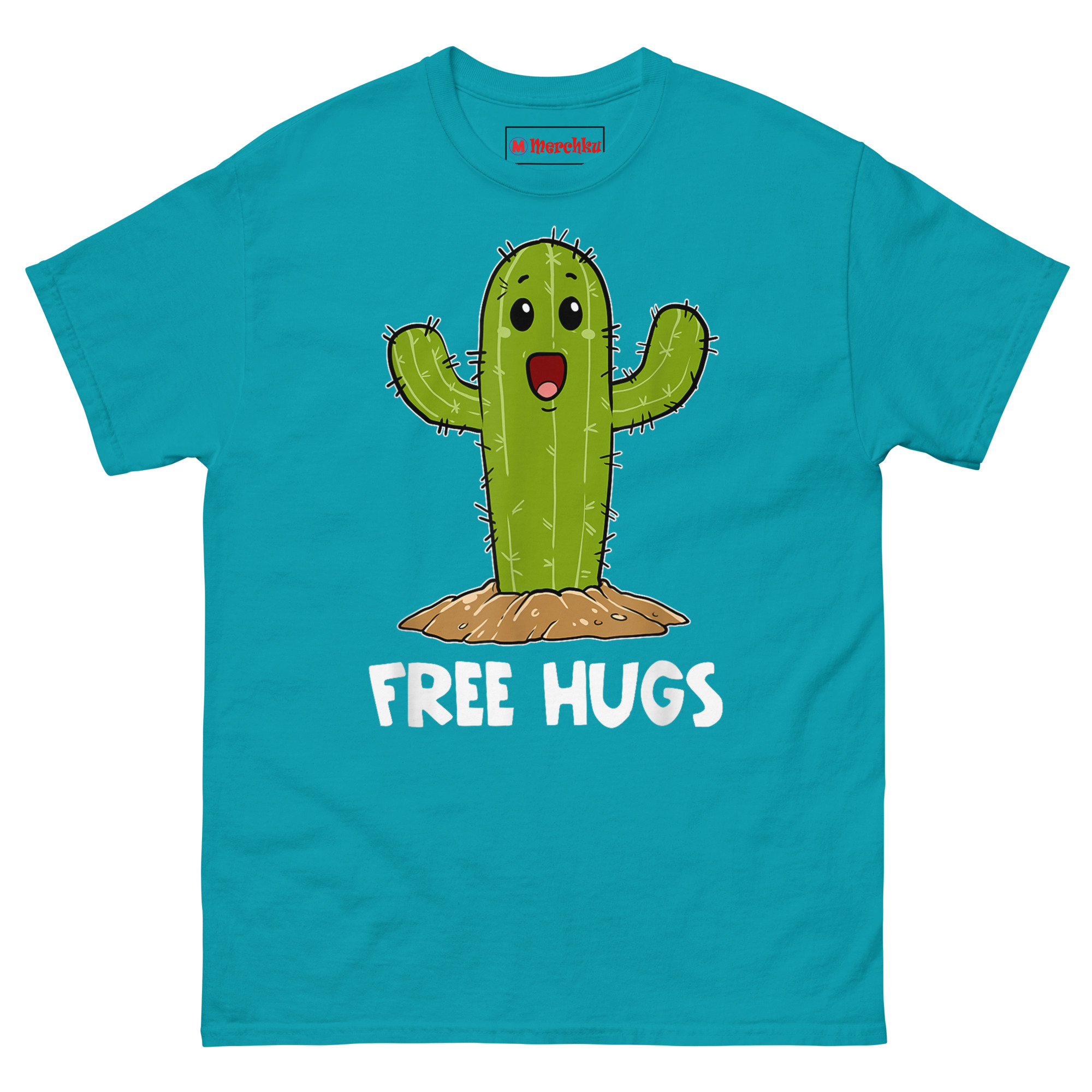 That image stuck. We started thinking about how many people feel that way, warm and loving on the inside, but with boundaries that keep others at a comfortable distance. The cactus became the perfect mascot. We drew it in the cutest kawaii style possible: huge sparkling eyes, an enormous happy grin, arms thrown wide open in the most inviting gesture imaginable. Below it, the words “FREE HUGS” sit in a playful white comic font. The contrast is the whole joke. This cactus is desperate to connect, but those spines mean business. It’s the ultimate cute kawaii succulent graphic tee for anyone whose exterior doesn’t always match their interior.