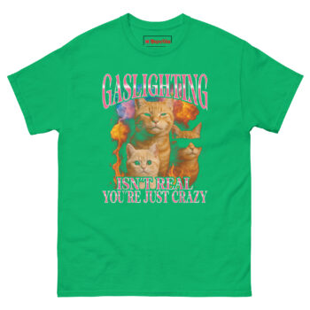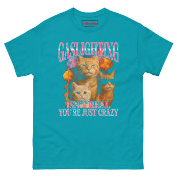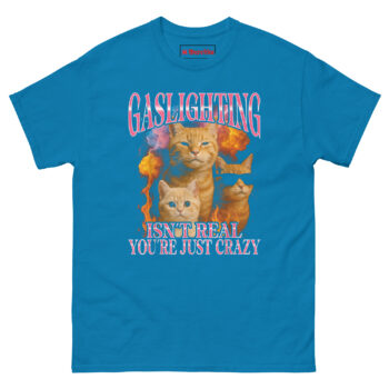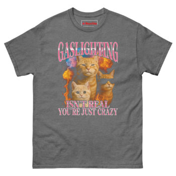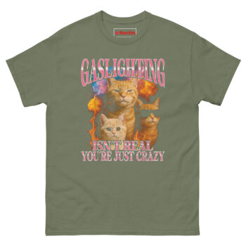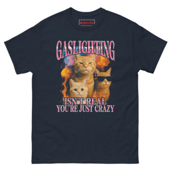 The Gaslighting Isnt Real Youre Just Crazy T Shirt pairs a toxic phrase with three innocent orange cats for maximum comedic whiplash. Made from 100% cotton, this piece features fiery explosions, lightning bolts, and felines who definitely have no idea what’s happening. It’s the perfect ginger cat fire explosion graphic tee and a funny dark humor gift for cat lover who appreciates absurdist internet culture. Wear it when you need to signal that you understand the joke, and you’re definitely not the punchline.