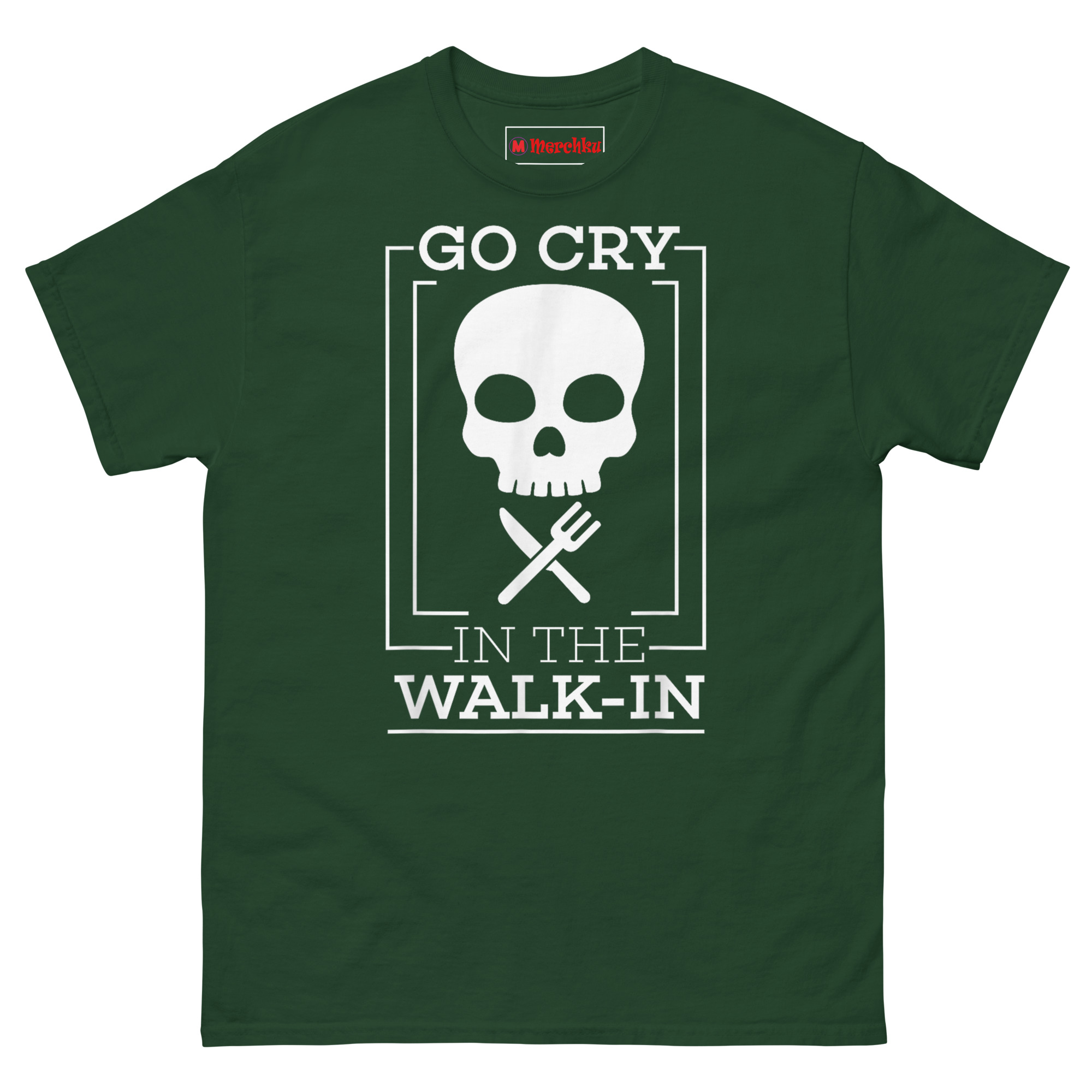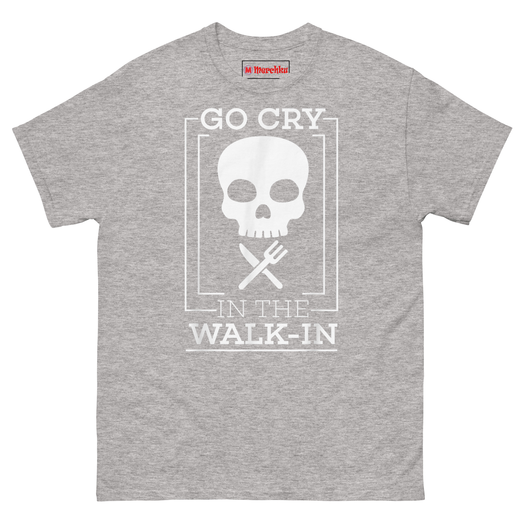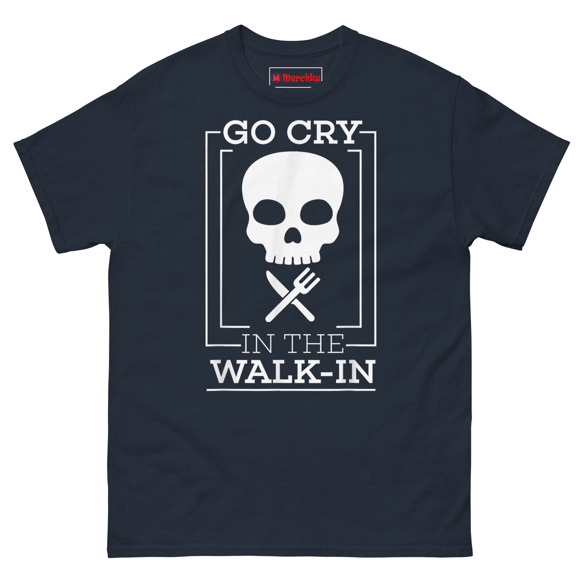 The concept Go Cry In The Walk-in T Shirt came straight from a conversation with a buddy who runs a busy kitchen. He described the walk-in cooler as “the only place in the building where nobody asks you for anything.” That stuck with us. We wanted to honor that sacred space while acknowledging the dark humor that keeps kitchen crews sane. The minimalist skull represents the grind, the nights when you feel dead on your feet but keep pushing. The crossed knife and fork mimic a pirate flag, reclaiming that rebellious culinary pirate flag apparel spirit for the back-of-house crew. The clean, architectural lines and bold sans-serif font give it a modern, almost industrial feel, reflecting the precision required in a commercial kitchen.