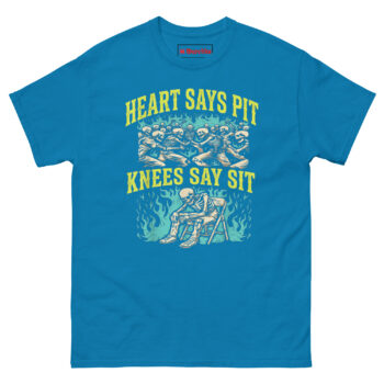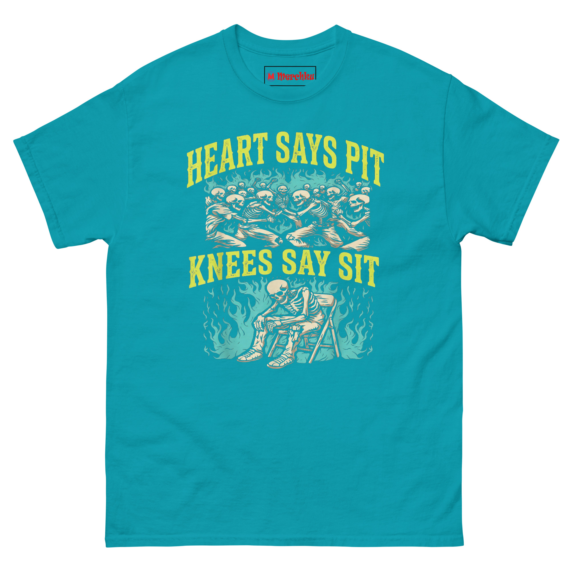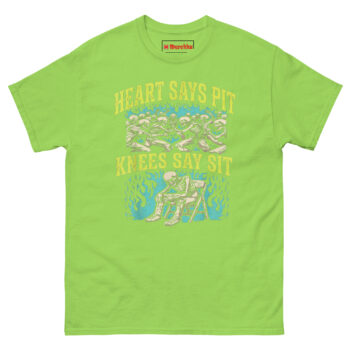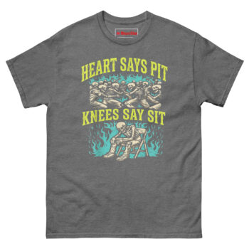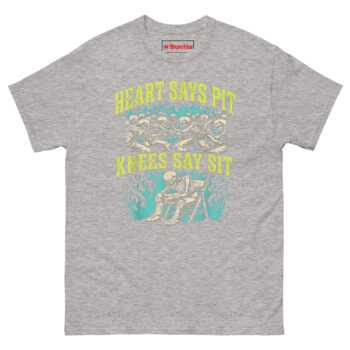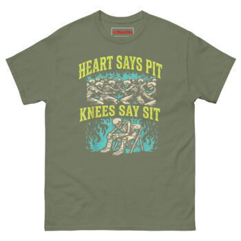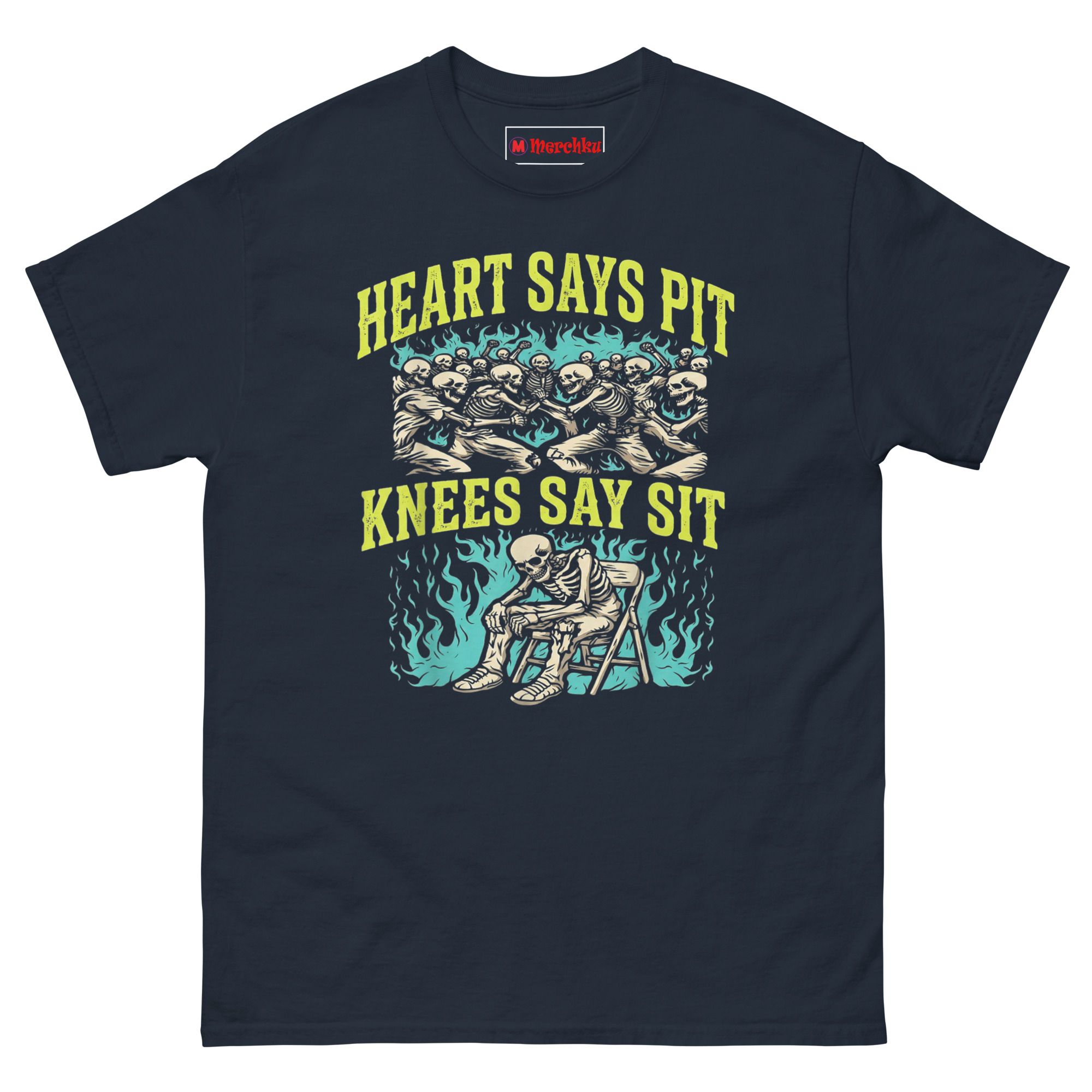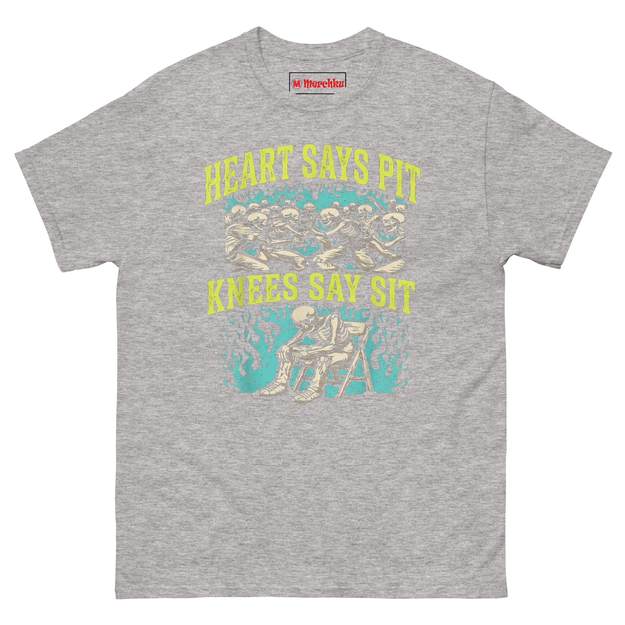 Heart Says Pit Knees Say Sit T Shirt idea came from a conversation at a recent reunion show. A group of friends in their late forties and early fifties stood near the back of the venue, nodding along to a band they’d loved since high school. Up front, kids were throwing elbows in the pit. One guy watched, sighed, and rubbed his knee. “You know,” he said, “my heart is right there in that chaos. But my knees? My knees say we find chairs.” Everyone around him laughed and nodded. They all felt the exact same way.